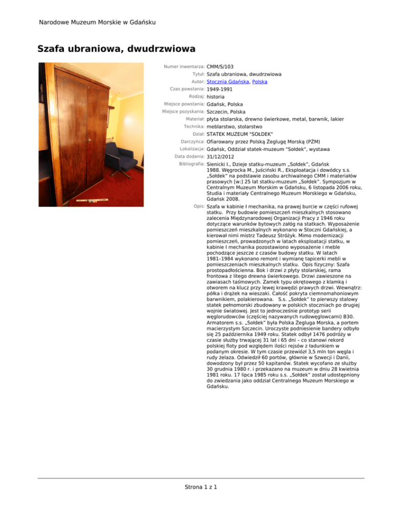 Narodowe Muzeum Morskie w Gdańsku Szafa ubraniowa, dwudrzwiowa Numer inwentarza: CMM/S/103 Tytuł: Szafa ubraniowa, dwudrzwiowa Autor: Stocznia Gdańska, Polska Czas powstania: 1949-1991 Rodzaj: historia Miejsce powstania: Gdańsk, Polska Miejsce pozyskania: Szczecin, Polska Materiał: płyta stolarska, drewno świerkowe, metal, barwnik, lakier Technika: meblarstwo, stolarstwo Dział: STATEK MUZEUM "SOŁDEK" Darczyńca: Ofiarowany przez Polską Żeglugę Morską (PŻM) Lokalizacja: Gdańsk, Oddział statek-muzeum "Sołdek", wystawa Data dodania: 31/12/2012 Bibliografia: Sienicki I., Dzieje statku-muzeum „Sołdek”, Gdańsk 1988. Węgrocka M., Juściński R., Eksploatacja i dowódcy s.s. „Sołdek” na podstawie zasobu archiwalnego CMM i materiałów prasowych [w:] 25 lat statku-muzeum „Sołdek”. Sympozjum w Centralnym Muzeum Morskim w Gdańsku, 6 listopada 2006 roku, Studia i materiały Centralnego Muzeum Morskiego w Gdańsku, Gdańsk 2008. Opis: Szafa w kabinie I mechanika, na prawej burcie w części rufowej statku. Przy budowie pomieszczeń mieszkalnych stosowano zalecenia Międzynarodowej Organizacji Pracy z 1946 roku dotyczące warunków bytowych załóg na statkach. Wyposażenie pomieszczeń mieszkalnych wykonano w Stoczni Gdańskiej, a kierował nimi mistrz Tadeusz Stróżyk. Mimo modernizacji pomieszczeń, prowadzonych w latach eksploatacji statku, w kabinie I mechanika pozostawiono wyposażenie i meble pochodzące jeszcze z czasów budowy statku. W latach 1981–1984 wykonano remont i wymianę tapicerki mebli w pomieszczeniach mieszkalnych statku. Opis fizyczny: Szafa prostopadłościenna. Bok i drzwi z płyty stolarskiej, rama frontowa z litego drewna świerkowego. Drzwi zawieszone na zawiasach taśmowych. Zamek typu okrętowego z klamką i otworem na klucz przy lewej krawędzi prawych drzwi. Wewnątrz: półka i drążek na wieszaki. Całość pokryta ciemnomahoniowym barwnikiem, polakierowana. S.s. „Sołdek” to pierwszy stalowy statek pełnomorski zbudowany w polskich stoczniach po drugiej wojnie światowej. Jest to jednocześnie prototyp serii węglorudowców (częściej nazywanych rudowęglowcami) B30. Armatorem s.s. „Sołdek” była Polska Żegluga Morska, a portem macierzystym Szczecin. Uroczyste podniesienie bandery odbyło się 25 października 1949 roku. Statek odbył 1476 podróży w czasie służby trwającej 31 lat i 65 dni – co stanowi rekord polskiej floty pod względem ilości rejsów z ładunkiem w podanym okresie. W tym czasie przewiózł 3,5 mln ton węgla i rudy żelaza. Odwiedził 60 portów, głównie w Szwecji i Danii, dowodzony był przez 50 kapitanów. Statek wycofano ze służby 30 grudnia 1980 r. i przekazano na muzeum w dniu 28 kwietnia 1981 roku. 17 lipca 1985 roku s.s. „Sołdek” został udostępniony do zwiedzania jako oddział Centralnego Muzeum Morskiego w Gdańsku. Strona 1 z 1