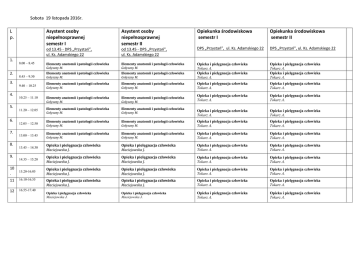 Sobota 19 listopada 2016r. L p. Opiekunka środowiskowa semestr I Opiekunka środowiskowa semestr II od 13.45 - DPS „Przystań”, ul. Ks. Adamskiego 22 DPS „Przystań”, ul. Ks. Adamskiego 22 DPS „Przystań”, ul. Ks. Adamskiego 22 Elementy anatomii i patologii człowieka Gołyszny M. Elementy anatomii i patologii człowieka Gołyszny M. 8.45 – 9.30 Elementy anatomii i patologii człowieka Gołyszny M. Elementy anatomii i patologii człowieka Gołyszny M. Opieka i pielęgnacja człowieka Tokarz A. Opieka i pielęgnacja człowieka Tokarz A. Opieka i pielęgnacja człowieka Tokarz A. Opieka i pielęgnacja człowieka Tokarz A. 9.40 – 10.25 Elementy anatomii i patologii człowieka Gołyszny M. Elementy anatomii i patologii człowieka Gołyszny M. Opieka i pielęgnacja człowieka Tokarz A. Opieka i pielęgnacja człowieka Tokarz A. 10.25 – 11.10 Elementy anatomii i patologii człowieka Gołyszny M. Elementy anatomii i patologii człowieka Gołyszny M. Opieka i pielęgnacja człowieka Tokarz A. Opieka i pielęgnacja człowieka Tokarz A. 11.20 – 12.05 Elementy anatomii i patologii człowieka Gołyszny M. Elementy anatomii i patologii człowieka Gołyszny M. Opieka i pielęgnacja człowieka Tokarz A. Opieka i pielęgnacja człowieka Tokarz A. 12.05 – 12.50 Elementy anatomii i patologii człowieka Gołyszny M. Elementy anatomii i patologii człowieka Gołyszny M. Opieka i pielęgnacja człowieka Tokarz A. Opieka i pielęgnacja człowieka Tokarz A. 13.00 – 13.45 Elementy anatomii i patologii człowieka Gołyszny M. Elementy anatomii i patologii człowieka Gołyszny M. Opieka i pielęgnacja człowieka Tokarz A. Opieka i pielęgnacja człowieka Tokarz A. 13.45 – 14.30 Opieka i pielęgnacja człowieka Maciejowska J. Opieka i pielęgnacja człowieka Maciejowska J. Opieka i pielęgnacja człowieka Tokarz A. Opieka i pielęgnacja człowieka Tokarz A. 14.35 – 15.20 Opieka i pielęgnacja człowieka Maciejowska J. Opieka i pielęgnacja człowieka Maciejowska J. Opieka i pielęgnacja człowieka Tokarz A. Opieka i pielęgnacja człowieka Tokarz A. 10 . 15.20-16.05 Opieka i pielęgnacja człowieka Maciejowska J. Opieka i pielęgnacja człowieka Maciejowska J. Opieka i pielęgnacja człowieka Tokarz A. Opieka i pielęgnacja człowieka Tokarz A. 11 16.10-16.55 Opieka i pielęgnacja człowieka Maciejowska J. Opieka i pielęgnacja człowieka Maciejowska J. Opieka i pielęgnacja człowieka Tokarz A. Opieka i pielęgnacja człowieka Tokarz A. 12 16.55-17.40 Opieka i pielęgnacja człowieka Maciejowska J. Opieka i pielęgnacja człowieka Maciejowska J. Opieka i pielęgnacja człowieka Tokarz A. Opieka i pielęgnacja człowieka Tokarz A. 1. 2. 3. 4. 5. 6. 7. 8. 9. 8.00 – 8.45 Asystent osoby niepełnosprawnej semestr I Asystent osoby niepełnosprawnej semestr II od 13.45 - DPS „Przystań”, ul. Ks. Adamskiego 22 Sobota 19 listopada 2016r. L p. 1. 2. 3. 4. 5. 6. 7. 8. 9. 10 . 11 12 Opiekun medyczny semestr I 8.00 – 8.45 8.45 – 9.30 Opiekun medyczny semestr II Technik informatyk semestr I Technik informatyk semestr II Systemy operacyjne Matuszczyk P. Witryny i aplikacje internetowe Wawrzyczek W. Systemy operacyjne Matuszczyk P. Systemy operacyjne Matuszczyk P. Witryny i aplikacje internetowe Wawrzyczek W. Witryny i aplikacje internetowe Wawrzyczek W. 9.40 – 10.25 Zarys psychologii i socjologii Maj E. 10.25 – 11.10 Zarys psychologii i socjologii Maj E. Systemy operacyjne Matuszczyk P. Witryny i aplikacje internetowe Wawrzyczek W. 11.20 – 12.05 Zarys psychologii i socjologii Maj E. Systemy operacyjne Matuszczyk P. Witryny i aplikacje internetowe Wawrzyczek W. 12.05 – 12.50 Zarys psychologii i socjologii Maj E. Systemy operacyjne Matuszczyk P. Witryny i aplikacje internetowe Wawrzyczek W. 13.00 – 13.45 Zarys psychologii i socjologii Maj E. Systemy operacyjne Matuszczyk P. Witryny i aplikacje internetowe Wawrzyczek W. 13.45 – 14.30 Zdrowie publiczne Gołyszny M. Systemy operacyjne Matuszczyk P. Witryny i aplikacje internetowe Wawrzyczek W. 14.35 – 15.20 Zdrowie publiczne Gołyszny M. Systemy operacyjne Matuszczyk P. Witryny i aplikacje internetowe Wawrzyczek W. 15.20 – 16.05 Zdrowie publiczne Gołyszny M. Systemy operacyjne Matuszczyk P. Witryny i aplikacje internetowe Wawrzyczek W. 16.10-16.55 Zdrowie publiczne Gołyszny M. Witryny i aplikacje internetowe Wawrzyczek W. 16.55-17.40 Zdrowie publiczne Gołyszny M. Diagnostyka i naprawa urządzeń techniki komputerowej Matuszczyk P. Diagnostyka i naprawa urządzeń techniki komputerowej Matuszczyk P. Witryny i aplikacje internetowe Wawrzyczek W. Technik informatyk semestr III