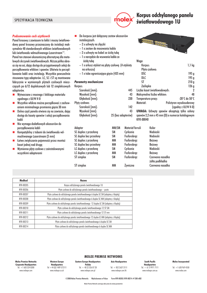 Korpus odchylanego panelu światłowodowego 1U SPECYFIKACJA TECHNICZNA Podsumowanie cech użytkowch Panel krosowy z zawiasem to lekki i mocny światłowodowy panel krosowy przeznaczony do instalacji maksymalnie 48 standardowych włókien światłowodowych lub światłowodu wdmuchiwanego Laserstream™. Panel ten stanowi ekonomiczną alternatywę dla metalowych skrzynek światłowodowych. Niższa półka obraca się na osi, dając dostęp do przygotowanych sekcji do porządkowania włókien i spawów. Ułatwia to porządkowanie kabli oraz instalację. Wszystkie powszechnie stosowane typy adapterów: LC, SC i ST są montowane fabrycznie w wymiennych płytach czołowych mieszczących po 6/12 dupleksowych lub 12 simpleksowych adapterów. n Wytwarzane z mocnego i lekkiego materiału zgodnego z UL94 V-0 n Wszystkie włókna można porządkować z zachowaniem minimalnego promienia gięcia 30 mm n Dolna część panela otwiera się na zawiasie, dając dostęp do kasety spawów i sekcji porządkowania kabli n Nie wymaga dodatkowych akcesoriów do porządkowania kabli n Kompatybilny z tubami do światłowodu wdmuchiwanego Laserstream (5 mm) n Łatwe zwiększanie pojemności przez montaż kaset jednej nad drugą n Wymienne płyty czołowe z zainstalowanymi wszystkimi adapterami n Do korpusu jest dołączony zestaw akcesoriów instalacyjnych: – 2 x uchwyty na złączki – 1 x zestaw do mocowania kabla – 2 x uchwyty na kabel ze ścisłą tubą – 1 x narzędzie do wsuwania kabla ze ścisłą tubą – 1 x arkusz etykiet na płytę czołową (4 etykiety na arkuszu) – 1 x tuba ograniczająca gięcie (435 mm) Parametry mechaniczne Korpus: Szerokość [mm]: Wysokość [mm]: Głębokość [mm]: Płyty czołowe: Szerokość [mm]: Wysokość [mm]: Głębokość [mm]: 445 43 230 142 43 25 (bez adapterów) Waga Korpus: 1,1 kg Płyta czołowa: DSC 195 g DLC 195 g ST 210 g Zaślepka 126 g Liczba kaset światłowodowych: 2 Maksymalna liczba włókien: 48 Temperatura pracy: -20°C do 50°C Materiał: Polistyren wysokoudarowy (zgodny z UL94 V-0) UWAGA: Uchwyty spawów akceptują tylko osłony spawów 2,2 mm x 45 mm (D) o numerze katalogowym KFR-00040 Adapter MM/SM Materiał ferruli SC duplex z przesłoną SM Cyrkonia SC duplex bez przesłony SM Fosforobrąz SC duplex z przesłoną MM Fosforobrąz SC duplex bez przesłony MM Fosforobrąz LC duplex z przesłoną SM Cyrkonia LC duplex z przesłoną MM Fosforobrąz ST simplex SM Fosforobrąz ST simplex MM Żywiczna Modkod Nazwa RFR-00205 Korpus odchylanego panelu światłowodowego 1U RFR-00206 Płyta czołowa do odchylanego panelu światłowodowego – pusta RFR-00207 Płyta czołowa do odchylanego panelu światłowodowego 6 duplex SC SM (adaptery z klapką) RFR-00208 Płyta czołowa do odchylanego panelu światłowodowego 6 duplex SC MM (adaptery z klapką) RFR-00209 Płyta czołowa do odchylanego panelu światłowodowego 12 duplex LC SM (adaptery z klapką) RFR-00210 Płyta czołowa do odchylanego panelu światłowodowego 12 ST SM RFR-00211 Płyta czołowa do odchylanego panelu światłowodowego 12 ST mm RFR-00212 Płyta czołowa do odchylanego panelu światłowodowego 12 duplex LC MM (adaptery z klapką) RFR-00213 Płyta czołowa do odchylanego panelu światłowodowego 6 duplex SC SM RFR-00214 Płyta czołowa do odchylanego panelu światłowodowego 6 duplex SC MM Kolor Niebieski Niebieski Beżowy Beżowy Niebieski Beżowy Czerwona nasadka żółta podkładka Czerwona nasadka MOLEX PREMISE NETWORKS Molex Premise Networks Corporate Headquarters Tel. +1 603 324 0200 www.molexpn.com Western Europe Headquarters Tel +44 (0) 1489 572111 www.molexpn.co.uk Eastern Europe Headquarters Polska Tel. + 48 22 326 07 20 www.molexpn.com.pl ©2008 Molex Premise Networks Wydrukowano w Polsce Asia Headquarters Tel. + 852 2637 3111 www.molexpn.com.hk South Pacific Headquarters Tel. + 61 3 9971 7111 www.molexpn.com.au Form RFR-00205/ RFR-00214 #1200 v002 Molex Premise Networks zastrzega sobie prawo do zmiany parametrów Molex Incorporated Tel. +1 630 969 4550 www.molex.com