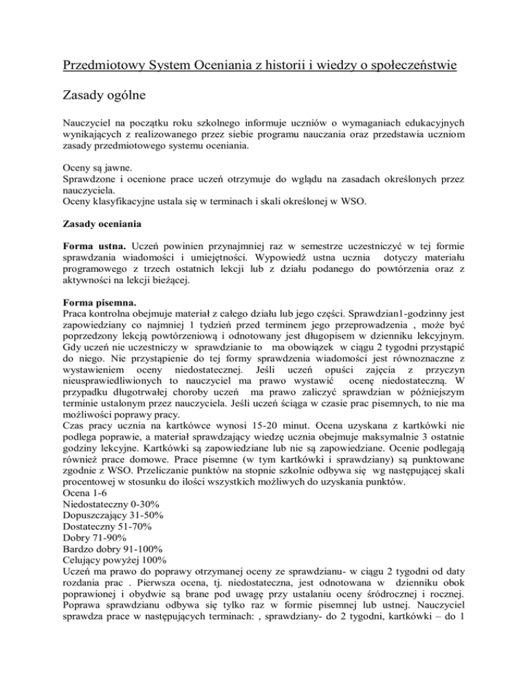 Przedmiotowy system oceniania z historii i wiedzy o społeczeństwie