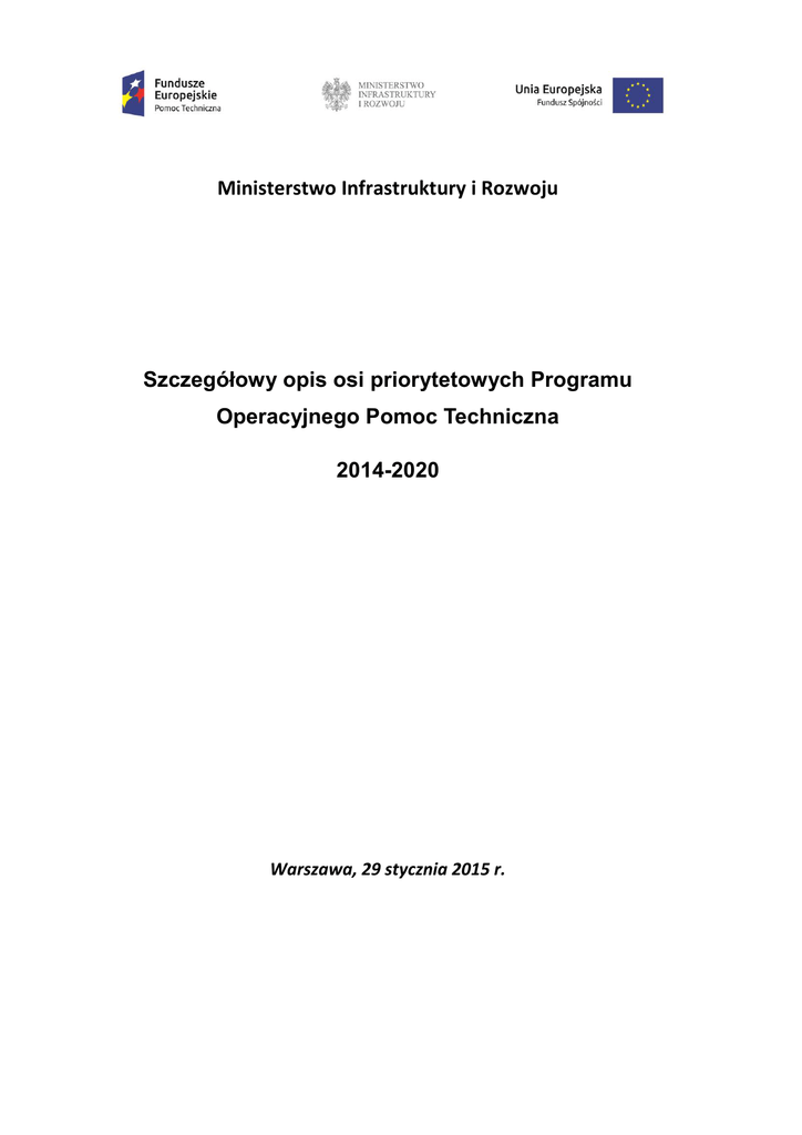 Ministerstwo Infrastruktury i Rozwoju Szczegółowy opis osi priorytetowych Programu Operacyjnego Pomoc Techniczna 2014-2020 Warszawa, 29 stycznia 2015 r. Spis treści Spis treści................................................................................................................................................. 2 1 Wstęp/ Preambuła.......................................................................................................................... 3 2 Ogólny opis PO oraz głównych warunków realizacji ...................................................................... 3 3 Opis poszczególnych osi priorytetowych PO oraz poszczególnych działań/ poddziałań ............... 7 3.1 Oś priorytetowa 1: Zasoby ludzkie......................................................................................... 7 3.1.1 Działanie 1.1: Wsparcie zatrudnienia .............................................................................. 7 3.1.2 Działanie 1.2 Wsparcie stanowiska pracy...................................................................... 11 3.2 Oś priorytetowa 2: Skuteczny i efektywny system realizacji polityki spójności .................. 16 3.2.1 Działanie 2.1: Wsparcie instytucji.................................................................................. 17 3.3 Oś priorytetowa 3: Potencjał beneficjentów funduszy europejskich .................................. 25 3.3.1 Działanie 3.1: Skuteczni beneficjenci ............................................................................ 26 3.4 Oś priorytetowa 4: Informacja i promocja........................................................................... 29 3.4.1 Działanie 4.1: Spójna oraz skuteczna informacja i promocja ........................................ 30 4 Indykatywny plan finansowy (wydatki kwalifikowalne w EUR) .................................................... 34 5 Wymiar terytorialny prowadzonej interwencji – N/D ................................................................. 36 6 Wykaz najważniejszych dokumentów służących realizacji PO ..................................................... 36 6.1 Wykaz rozporządzeń krajowych i UE oraz krajowych ustaw ............................................... 36 6.1.1 Rozporządzenia UE ........................................................................................................ 36 6.1.2 Rozporządzenia delegowane ......................................................................................... 36 6.1.3 Rozporządzenia wykonawcze ........................................................................................ 37 6.1.4 Ustawy krajowe ............................................................................................................. 38 6.1.5 Rozporządzenia krajowe................................................................................................ 38 6.2 Wykaz wytycznych UE .......................................................................................................... 38 6.3 Wykaz krajowych wytycznych horyzontalnych - w przygotowaniu ..................................... 39 6.4 Wykaz wytycznych programowych ...................................................................................... 40 6.5 Indykatywny wykaz dokumentów towarzyszących realizacji projektu (dla beneficjentów); 40 6.6 Inne dokumenty ustalone przez IZ wg specyfiki PO............................................................. 40 7 Załączniki ...................................................................................................................................... 40 2 1 Wstęp/ Preambuła 1) Niniejszy dokument został przygotowany na podstawie art. 8 ustawy z dnia 11 lipca 2014 r. o zasadach realizacji programów w zakresie polityki spójności finansowanych w perspektywie finansowej 2014-2020 (tekst jedn. Dz. U. z 2014 r. Nr 84, poz. 1146, z późn. zm.) zwanej dalej ustawą, który nakłada na instytucję zarządzającą obowiązek podania do publicznej wiadomości szczegółowego opisu osi priorytetowych programu operacyjnego. Dokument ten doprecyzowuje zasady wdrażania Programu Operacyjnego Pomoc Techniczna 2014-2020 (POPT 2014-2020) oraz stanowi kompendium wiedzy dla beneficjentów ułatwiające im prawidłowe przygotowanie wniosków o dofinansowanie oraz wskazujące tryb postępowania przy ich składaniu. 2) Szczegółowy opis osi priorytetowych Programu Operacyjnego Pomoc Techniczna 2014-2020 (zwany dalej szczegółowym opisem) zawiera: podstawowe informacje dotyczące POPT 2014-2020 wraz z opisem źródeł jego finansowania, opis systemu wyboru projektów, szczegółowy opis działań realizowanych w ramach priorytetów, katalog beneficjentów uprawnionych do składania wniosków w ramach poszczególnych działań oraz przykładowe rodzaje projektów. 3) Szczegółowy opis stanowi podstawę do przygotowania i przedstawienia przez instytucję zarządzającą Komitetowi Monitorującemu POPT do zatwierdzenia kryteriów wyboru finansowanych projektów, o których mowa w art. 110 ust. 2 lit. a rozporządzenia Parlamentu Europejskiego i Rady (UE) NR 1303/2013 z dnia 17 grudnia 2013 r. ustanawiającego wspólne przepisy dotyczące Europejskiego Funduszu Rozwoju Regionalnego, Europejskiego Funduszu Społecznego, Funduszu Spójności, Europejskiego Funduszu Rolnego na rzecz Rozwoju Obszarów Wiejskich oraz Europejskiego Funduszu Morskiego i Rybackiego oraz ustanawiającego przepisy ogólne dotyczące Europejskiego Funduszu Rozwoju Regionalnego, Europejskiego Funduszu Społecznego, Funduszu Spójności i Europejskiego Funduszu Morskiego i Rybackiego oraz uchylającego rozporządzenie Rady (WE) nr 1083/2006 (Dz. Urz. UE L 347 z 20.12.2013), zwanego dalej rozporządzeniem ogólnym. Kryteria wyboru finansowanych projektów obowiązują od momentu ich akceptacji przez Komitet Monitorujący POPT. 4) Zmiany w szczegółowym opisie są dokonywane zgodnie z Wytycznymi Ministra Infrastruktury i 