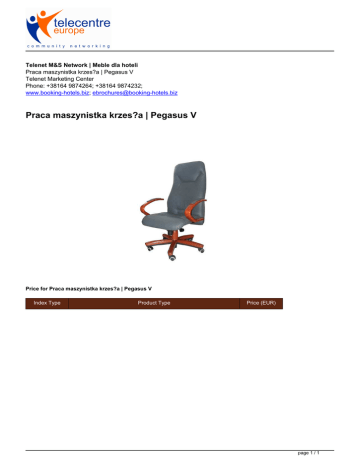 Telenet M&S Network | Meble dla hoteli Praca maszynistka krzes?a | Pegasus V Telenet Marketing Center Phone: +38164 9874264; +38164 9874232; www.booking-hotels.biz; [email protected] Praca maszynistka krzes?a | Pegasus V Price for Praca maszynistka krzes?a | Pegasus V Index Type Product Type Price (EUR) page 1 / 1