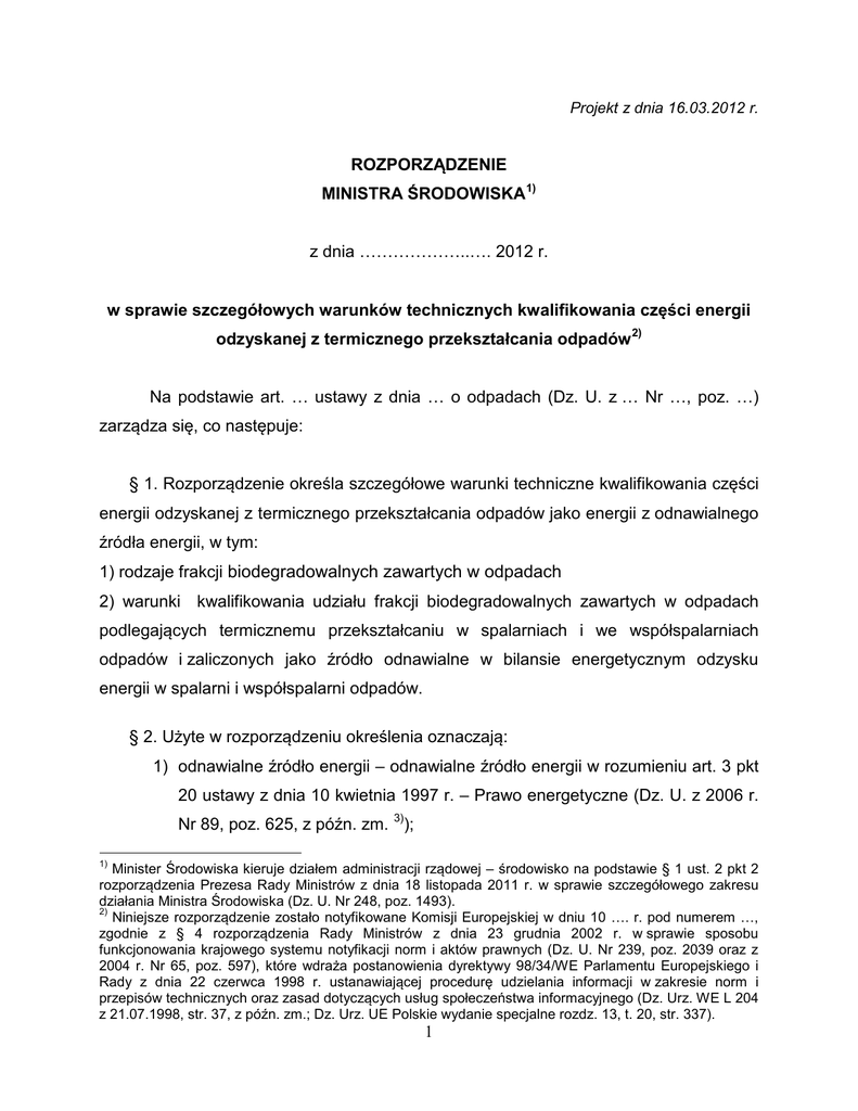 Projekt z dnia 16.03.2012 r. ROZPORZĄDZENIE MINISTRA ŚRODOWISKA1) z dnia ………………..…. 2012 r. w sprawie szczegółowych warunków technicznych kwalifikowania części energii odzyskanej z termicznego przekształcania odpadów 2) Na podstawie art. … ustawy z dnia … o odpadach (Dz. U. z … Nr …, poz. …) zarządza się, co następuje: § 1. Rozporządzenie określa szczegółowe warunki techniczne kwalifikowania części energii odzyskanej z termicznego przekształcania odpadów jako energii z odnawialnego źródła energii, w tym: 1) rodzaje frakcji biodegradowalnych zawartych w odpadach 2) warunki kwalifikowania udziału frakcji biodegradowalnych zawartych w odpadach podlegających termicznemu przekształcaniu w spalarniach i we współspalarniach odpadów i zaliczonych jako źródło odnawialne w bilansie energetycznym odzysku energii w spalarni i współspalarni odpadów. § 2. Użyte w rozporządzeniu określenia oznaczają: 1) odnawialne źródło energii – odnawialne źródło energii w rozumieniu art. 3 pkt 20 ustawy z dnia 10 kwietnia 1997 r. – Prawo energetyczne (Dz. U. z 2006 r. Nr 89, poz. 625, z późn. zm. 3)); 1) Minister Środowiska kieruje działem administracji rządowej – środowisko na podstawie § 1 ust. 2 pkt 2 rozporządzenia Prezesa Rady Ministrów z dnia 18 listopada 2011 r. w sprawie szczegółowego zakresu działania Ministra Środowiska (Dz. U. Nr 248, poz. 1493). 2) Niniejsze rozporządzenie zostało notyfikowane Komisji Europejskiej w dniu 10 …. r. pod numerem …, zgodnie z § 4 rozporządzenia Rady Ministrów z dnia 23 grudnia 2002 r. w sprawie sposobu funkcjonowania krajowego systemu notyfikacji norm i aktów prawnych (Dz. U. Nr 239, poz. 2039 oraz z 2004 r. Nr 65, poz. 597), które wdraża postanowienia dyrektywy 98/34/WE Parlamentu Europejskiego i Rady z dnia 22 czerwca 1998 r. ustanawiającej procedurę udzielania informacji w zakresie norm i przepisów technicznych oraz zasad dotyczących usług społeczeństwa informacyjnego (Dz. Urz. WE L 204 z 21.07.1998, str. 37, z późn. zm.; Dz. Urz. UE Polskie wydanie specjalne rozdz. 13, t. 20, str. 337). 1 2) biomasa – biomasę w rozumieniu przepisów wydanych na podstawie art. 9a ust. 9 ustawy z dnia 10 kwietnia 1997 r. – Prawo energetyczne. § 3. Do rodzajów frakcji biodegradowalnych zalicza się następujące frakcje: 1) frakcję podsitową o granulacji 0 – 20 mm; 2) odpady kuchenne pochodzenia roślinnego lub zwierzęcego, ogrodowe oraz z terenów zieleni; 3) drewno; 4) papier lub tekturę; 5) tekstylia z włókien naturalnych; 6) odpady wielomateriałowe, w tym odpady z utrzymania higieny; 7) skórę. § 4.1. Część energii odzyskanej z termicznego przekształcania odpadów zawierających frakcje, o których mowa w § 3, może być zakwalifikowana jako energia z odnawialnego źródła energii, jeżeli są spełnione łącznie następujące warunki: 1) termicznie przekształcane są odpady zawierające co najmniej jedną z frakcji biodegradowalnych; 2) w przypadku odpadów komunalnych termicznie przekształcane są zmieszane odpady pochodzące wyłącznie z obszarów, na których, zgodnie z regulaminem utrzymania czystości i porządku na terenie gminy, są selektywnie zbierane odpady przeznaczone do innych procesów odzysku, w tym do procesów recyklingu; 3) wartość ryczałtowa udziału energii chemicznej frakcji biodegradowalnych w energii chemicznej całej masy odpadów, o których mowa w pkt 1, kierowanych do termicznego przekształcania osiąga poziom 42 % całości energii odzyskanej w wyniku termicznego przekształcenia tych odpadów; 3) Zmiany tekstu jednolitego wymienionej ustawy zostały ogłoszone w Dz. U. z 2006 r. Nr 104, poz. 708, Nr 158, poz. 1123 i Nr 170, poz. 1217, z 2007 r. Nr 21, poz. 124, Nr 52, poz. 343, Nr 115, poz. 790 i Nr 130, poz. 905, z 2008 r. Nr 180, poz. 1112 i Nr 227, poz. 1505, z 2009 r. Nr 3, poz. 11, Nr 69, poz. 586, Nr 165, poz. 1316 i Nr 215, poz. 1664 oraz z 2010 r. Nr 21, poz. 104. 2 4) wartość, o której mowa w pkt 4, jest wartością kwalifikującą część energii odzyskanej z termicznego przekształcenia odpadów, o których mowa w pkt 1,jako energii odzyskanej z odnawialnego źródła energii; 5) prowadzone są badania udziału energii chemicznej frakcji biodegradowalnych w energii chemicznej całej masy odpadów, o których mowa w pkt 1, kierowanych do termicznego przekształcenia, na podstawie metodyki badań potwierdzających rzeczywisty udział energii chemicznej frakcji biodegradowalnych w całkowitej energii z termicznego przekształcania odpadów, o których mowa w pkt 1,, określonej w załączniku do rozporządzenia, zwane dalej „badaniami”; 6) badania są wykonywane przez laboratoria akredytowane lub posiadające certyfikat wdrożonego systemu jakości badań lub uprawnienia do badania właściwości fizykochemicznych, toksyczności i ekotoksyczności substancji i preparatów nadane w trybie określonym w przepisach o substancjach i preparatach chemicznych; 7) termiczne przekształcenie odpadów, o których mowa w pkt 1, zawierających frakcje biodegradowalne odbywa się zgodnie z warunkami określonymi w przepisach dotyczących termicznego przekształcania odpadów, w szczególności w zakresie emisji zanieczyszczeń do powietrza; 8) prowadzona jest wiarygodna dokumentacja dotycząca: a) ilości i jakości odpadów dostarczonych do procesu termicznego przekształcania odpadów w postaci ewidencji odpadów, o której mowa w art. … ustawy z dnia…. o odpadach, b) wyników badań. 2. Dokumentacja, o której mowa w ust. 1 pkt 9, powinna w szczególności zawierać końcowy raport z badań, zawierający rzeczywisty udział energii chemicznej frakcji biodegradowalnych w energii chemicznej całej masy kierowanych do termicznego przekształcenia odpadów, o których mowa w ust. 1 pkt 1.. § 5. Badania przeprowadza się raz na 3 lata, w tym w pierwszym roku, w którym miałoby nastąpić zakwalifikowanie częś