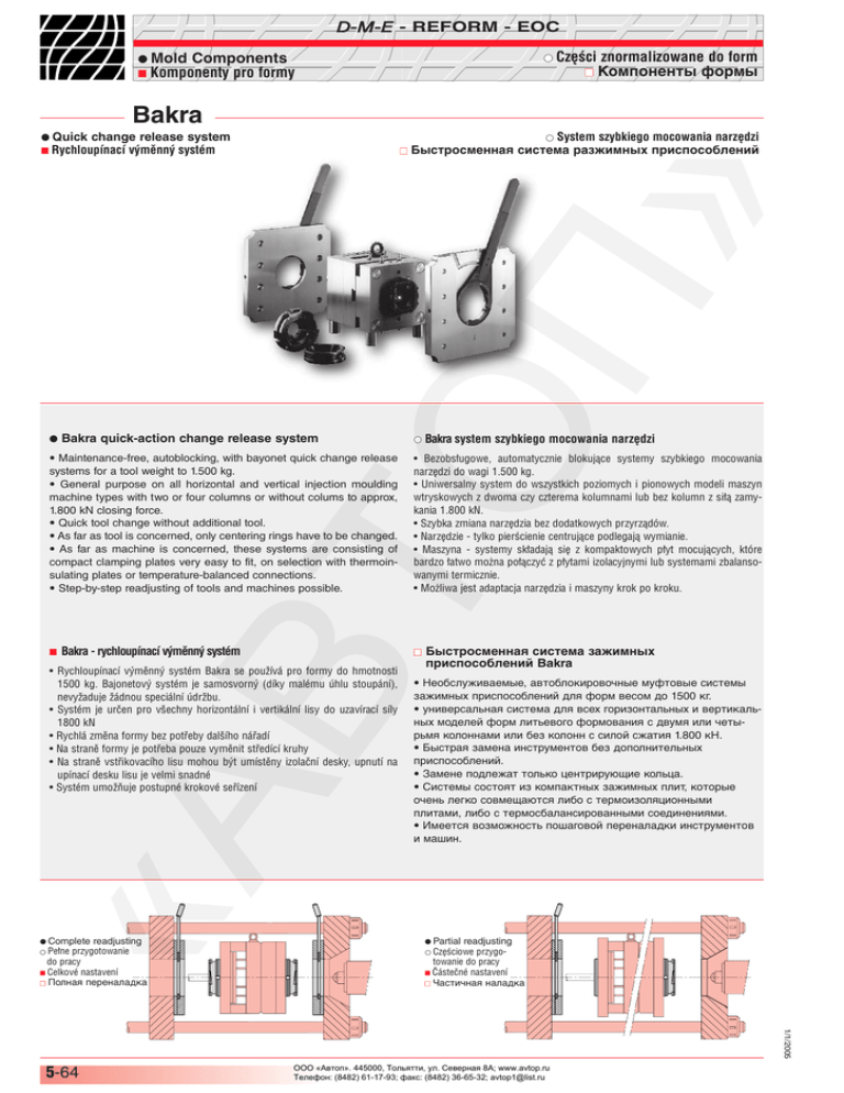 ä Mold D-M-E - REFORM - EOC D ä Części znormalizowane do form å Компоненты формы Components å Komponenty pro formy Bakra ä Quick change release system výměnný systém å Rychloupínací ä System szybkiego mocowania narzędzi Быстросменная система разжимных приспособлений «А ВТ ОП » å ä Bakra quick-action change release system • Maintenance-free, autoblocking, with bayonet quick change release systems for a tool weight to 1.500 kg. • General purpose on all horizontal and vertical injection moulding machine types with two or four columns or without colums to approx, 1.800 kN closing force. • Quick tool change without additional tool. • As far as tool is concerned, only centering rings have to be changed. • As far as machine is concerned, these systems are consisting of compact clamping plates very easy to fit, on selection with thermoinsulating plates or temperature-balanced connections. • Step-by-step readjusting of tools and machines possible. å Bakra - rychloupínací výměnný systém Bakra system szybkiego mocowania narzędzi • Bezobsługowe, automatycznie blokujące systemy szybkiego mocowania narzędzi do wagi 1.500 kg. • Uniwersalny system do wszystkich poziomych i pionowych modeli maszyn wtryskowych z dwoma czy czterema kolumnami lub bez kolumn z siłą zamykania 1.800 kN. • Szybka zmiana narzędzia bez dodatkowych przyrządów. • Narzędzie - tylko pierścienie centrujące podlegają wymianie. • Maszyna - systemy składają się z kompaktowych płyt mocujących, które bardzo łatwo można połączyć z płytami izolacyjnymi lub systemami zbalansowanymi termicznie. • Możliwa jest adaptacja narzędzia i maszyny krok po kroku. å • Rychloupínací výměnný systém Bakra se používá pro formy do hmotnosti 1500 kg. Bajonetový systém je samosvorný (díky malému úhlu stoupání), nevyžaduje žádnou speciální údržbu. • Systém je určen pro všechny horizontální i vertikální lisy do uzavírací síly 1800 kN • Rychlá změna formy bez potřeby dalšího nářadí • Na straně formy je potřeba pouze vyměnit středící kruhy • Na straně vstřikovacího lisu mohou být umístěny izolační desky, upnutí na upínací desku lisu je velmi snadné • Systém umožňuje postupné krokové seřízení readjusting Pełne przygotowanie do pracy å Celkové nastavení å Полная переналадка ä Быстросменная система зажимных приспособлений Bakra • Необслуживаемые, автоблокировочные муфтовые системы зажимных приспособлений для форм весом до 1500 кг. • универсальная система для всех горизонтальных и вертикальных моделей форм литьевого формования с двумя или четырьмя колоннами или без колонн с силой сжатия 1.800 кН. • Быстрая замена инструментов без дополнительных приспособлений. • Замене подлежат только центрирующие кольца. • Системы состоят из компактных зажимных плит, которые очень легко совмещаются либо с термоизоляционными плитами, либо с термосбалансированными соединениями. • Имеется возможность пошаговой переналадки инструментов и машин. ä Complete ä Partial ä ä readjusting Częściowe przygotowanie do pracy å Částečné nastavení å Частичная наладка 1/1/2005 5-64 ООО «Автоп». 445000, Тольятти, ул. Северная 8А; www.avtop.ru Телефон: (8482) 61-17-93; факс: (8482) 36-65-32; [email protected] ä Mold D-M-E - REFORM - EOC D ä Części znormalizowane do form å Компоненты формы Components å Komponenty pro formy MCA ä Mold clamps å Upínky pro formy Uchwyty do form wtryskowych å Зажимы пресс-форм «А ВТ ОП » ä MCA 8-95 19 53,9 34,9 34,9 1,5 1,5 11,9 23 A A 18,2 18,2 MCA 4-4 -> MCA 6-7 B W W B L1 L1 41,2 L L REF/Номер 5-94 4-4 5-5 5-7 6-5 6-7 8-95 B (DIN 933) HEX M 12 x 80 HEX M 16 x 100 HEX M 24 x 120 A L L1 W 38 100 106 132 178 132 178 241 72 86 127 86 127 135 41 48 50 ООО «Автоп». 445000, Тольятти, ул. Северная 8А; www.avtop.ru Телефон: (8482) 61-17-93; факс: (8482) 36-65-32; [email protected] 51 67 1/1/2005 MCA MCA MCA MCA MCA MCA D-M-E - REFORM - EOC DD ä Części znormalizowane do form å Компоненты формы ä Mold å Components Komponenty pro formy DMCA ä Mold clamps for diecasting forem pro tlakové lití å Upínky ä Uchwyty do form ciśnieniowych Зажимы форм для литья под давлением «А ВТ ОП » å DMCA-8-95 DMCA-5-5 -> DMCA-6-7 B A 57,1 C C A 45,2 23 34,9 A' A' 18,2 18,2 B d W W d L1 L1 L 41,2 L K H E 1/1/2005 F G REF/Номер A A' B C d L L1 W E F G H K DMCA-5-5 DMCA-5-7 DMCA-6-5 DMCA-6-7 DMCA-8-95 15,8 39 5/8-11 x 4 1/2 15,9 35 19,1 38 1” x 6 25,5 51 86 127 86 127 135 48 3/4-10 x 4 1/2 132 178 132 178 241 15,9 15,9 19,0 19,0 25,4 28,6 28,6 33,3 33,3 42,9 33,0 33,0 37,6 37,6 49,8 16,2 16,2 20,6 20,6 26,9 6,4 6,4 13,5 13,5 17,5 19,0 22,2 50 ООО «Автоп». 445000, Тольятти, ул. Северная 8А; www.avtop.ru Телефон: (8482) 61-17-93; факс: (8482) 36-65-32; [email protected] 51 67 5-95