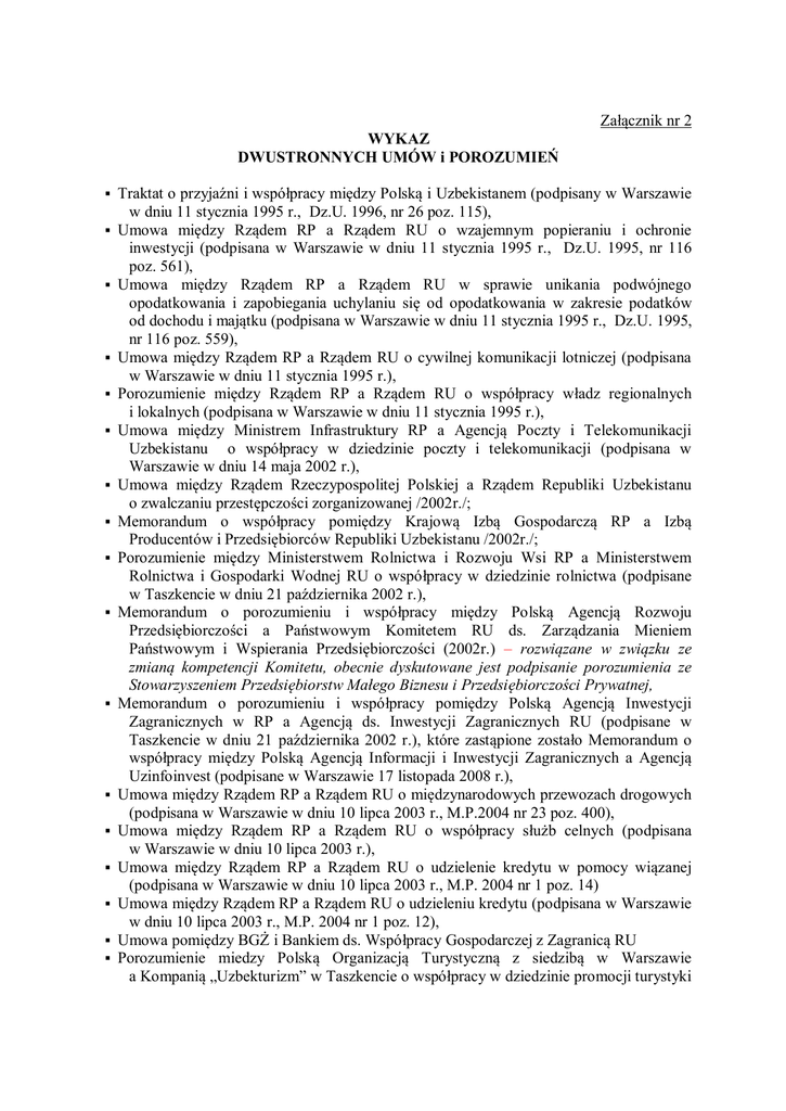 Załącznik nr 2 WYKAZ DWUSTRONNYCH UMÓW i POROZUMIEŃ § Traktat o przyjaźni i współpracy między Polską i Uzbekistanem (podpisany w Warszawie w dniu 11 stycznia 1995 r., Dz.U. 1996, nr 26 poz. 115), § Umowa między Rządem RP a Rządem RU o wzajemnym popieraniu i ochronie § § § § § § § § § § § § § § § inwestycji (podpisana w Warszawie w dniu 11 stycznia 1995 r., Dz.U. 1995, nr 116 poz. 561), Umowa między Rządem RP a Rządem RU w sprawie unikania podwójnego opodatkowania i zapobiegania uchylaniu się od opodatkowania w zakresie podatków od dochodu i majątku (podpisana w Warszawie w dniu 11 stycznia 1995 r., Dz.U. 1995, nr 116 poz. 559), Umowa między Rządem RP a Rządem RU o cywilnej komunikacji lotniczej (podpisana w Warszawie w dniu 11 stycznia 1995 r.), Porozumienie między Rządem RP a Rządem RU o współpracy władz regionalnych i lokalnych (podpisana w Warszawie w dniu 11 stycznia 1995 r.), Umowa między Ministrem Infrastruktury RP a Agencją Poczty i Telekomunikacji Uzbekistanu o współpracy w dziedzinie poczty i telekomunikacji (podpisana w Warszawie w dniu 14 maja 2002 r.), Umowa między Rządem Rzeczypospolitej Polskiej a Rządem Republiki Uzbekistanu o zwalczaniu przestępczości zorganizowanej /2002r./; Memorandum o współpracy pomiędzy Krajową Izbą Gospodarczą RP a Izbą Producentów i Przedsiębiorców Republiki Uzbekistanu /2002r./; Porozumienie między Ministerstwem Rolnictwa i Rozwoju Wsi RP a Ministerstwem Rolnictwa i Gospodarki Wodnej RU o współpracy w dziedzinie rolnictwa (podpisane w Taszkencie w dniu 21 października 2002 r.), Memorandum o porozumieniu i współpracy między Polską Agencją Rozwoju Przedsiębiorczości a Państwowym Komitetem RU ds. Zarządzania Mieniem Państwowym i Wspierania Przedsiębiorczości (2002r.) – rozwiązane w związku ze zmianą kompetencji Komitetu, obecnie dyskutowane jest podpisanie porozumienia ze Stowarzyszeniem Przedsiębiorstw Małego Biznesu i Przedsiębiorczości Prywatnej, Memorandum o porozumieniu i współpracy pomiędzy Polską Agencją Inwestycji Zagranicznych w RP a Agencją ds. Inwestycji Zagranicznych RU (podpisane w Taszkencie w dniu 21 października 2002 r.), które zastąpione zostało Memorandum o współpracy między Polską Agencją Informacji i Inwestycji Zagranicznych a Agencją Uzinfoinvest (podpisane w Warszawie 17 listopada 2008 r.), Umowa między Rządem RP a Rządem RU o międzynarodowych przewozach drogowych (podpisana w Warszawie w dniu 10 lipca 2003 r., M.P.2004 nr 23 poz. 400), Umowa między Rządem RP a Rządem RU o współpracy służb celnych (podpisana w Warszawie w dniu 10 lipca 2003 r.), Umowa między Rządem RP a Rządem RU o udzielenie kredytu w pomocy wiązanej (podpisana w Warszawie w dniu 10 lipca 2003 r., M.P. 2004 nr 1 poz. 14) Umowa między Rządem RP a Rządem RU o udzieleniu kredytu (podpisana w Warszawie w dniu 10 lipca 2003 r., M.P. 2004 nr 1 poz. 12), Umowa pomiędzy BGŻ i Bankiem ds. Współpracy Gospodarczej z Zagranicą RU Porozumienie miedzy Polską Organizacją Turystyczną z siedzibą w Warszawie a Kompanią „Uzbekturizm” w Taszkencie o współpracy w dziedzinie promocji turystyki § Umowa między Rządem RP a Rządem RU o ochronie informacji niejawnych (z dnia 18 stycznia 2005 r.), § Porozumienia o współpracy i dobrowolnej reasekuracji pomiędzy KUKE S.A. a Narodową Kompanią Ubezpieczeń Eksportowo-Importowych „Uzbekinwest” (z dn. 6 lipca 2010 r.), § List intencyjny o dalszym rozwoju współpracy dwustronnej w dziedzinie obrony (6 września 2012 r.),