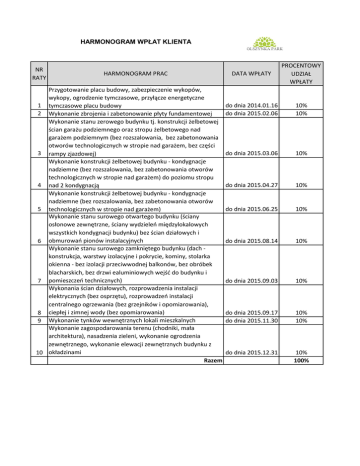HARMONOGRAM WPŁAT KLIENTA NR RATY HARMONOGRAM PRAC Przygotowanie placu budowy, zabezpieczenie wykopów, wykopy, ogrodzenie tymczasowe, przyłącze energetyczne 1 tymczasowe placu budowy 2 Wykonanie zbrojenia i zabetonowanie płyty fundamentowej Wykonanie stanu zerowego budynku tj. konstrukcji żelbetowej ścian garażu podziemnego oraz stropu żelbetowego nad garażem podziemnym (bez rozszalowania, bez zabetonowania otworów technologicznych w stropie nad garażem, bez części 3 rampy zjazdowej) Wykonanie konstrukcji żelbetowej budynku - kondygnacje nadziemne (bez rozszalowania, bez zabetonowania otworów technologicznych w stropie nad garażem) do poziomu stropu 4 nad 2 kondygnacją Wykonanie konstrukcji żelbetowej budynku - kondygnacje nadziemne (bez rozszalowania, bez zabetonowania otworów 5 technologicznych w stropie nad garażem) Wykonanie stanu surowego otwartego budynku (ściany osłonowe zewnętrzne, ściany wydzieleń międzylokalowych wszystkich kondygnacji budynku) bez ścian działowych i 6 obmurowań pionów instalacyjnych Wykonanie stanu surowego zamkniętego budynku (dach konstrukcja, warstwy izolacyjne i pokrycie, kominy, stolarka okienna - bez izolacji przeciwwodnej balkonów, bez obróbek blacharskich, bez drzwi ealuminiowych wejść do budynku i 7 pomieszczeń technicznych) Wykonania ścian działowych, rozprowadzenia instalacji elektrycznych (bez osprzętu), rozprowadzeń instalacji centralnego ogrzewania (bez grzejników i opomiarowania), 8 ciepłej i zimnej wody (bez opomiarowania) 9 Wykonanie tynków wewnętrznych lokali mieszkalnych Wykonanie zagospodarowania terenu (chodniki, mała architektura), nasadzenia zieleni, wykonanie ogrodzenia zewnętrznego, wykonanie elewacji zewnętrznych budynku z 10 okładzinami Razem DATA WPŁATY PROCENTOWY UDZIAŁ WPŁATY do dnia 2014.01.16 do dnia 2015.02.06 10% 10% do dnia 2015.03.06 10% do dnia 2015.04.27 10% do dnia 2015.06.25 10% do dnia 2015.08.14 10% do dnia 2015.09.03 10% do dnia 2015.09.17 do dnia 2015.11.30 10% 10% do dnia 2015.12.31 10% 100% KWOTA #ADR! #ADR! #ADR! #ADR! #ADR! #ADR! #ADR! #ADR! #ADR! #ADR! #ADR!