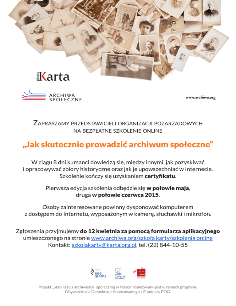 www.archiwa.org Zapraszamy przedstawicieli organizacji pozarządowych na bezpłatne szkolenie online „Jak skutecznie prowadzić archiwum społeczne” W ciągu 8 dni kursanci dowiedzą się, między innymi, jak pozyskiwać i opracowywać zbiory historyczne oraz jak je upowszechniać w Internecie. Szkolenie kończy się uzyskaniem certyfikatu. Pierwsza edycja szkolenia odbędzie się w połowie maja, druga w połowie czerwca 2015. Osoby zainteresowane powinny dysponować komputerem z dostępem do Internetu, wyposażonym w kamerę, słuchawki i mikrofon. Zgłoszenia przyjmujemy do 12 kwietnia za pomocą formularza aplikacyjnego umieszczonego na stronie www.archiwa.org/szkoła karty/szkolenia online Kontakt: [email protected], tel. (22) 844-10-55 Projekt „Stabilizacja archiwistyki społecznej w Polsce” realizowany jest w ramach programu Obywatele dla Demokracji, finansowanego z Funduszy EOG.