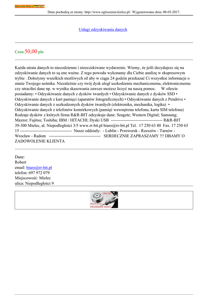 Dane pochodzą ze strony: http://www.ogloszenia-kielce.pl/. Wygenerowano dnia: 08-03-2017. Usługi odzyskiwania danych Cena:50,00 pln Każda utrata danych to niecodzienne i nieoczekiwane wydarzenie. Wiemy, że jeśli decydujesz się na odzyskiwanie danych to są one ważne. Z tego powodu wykonamy dla Ciebie analizę w ekspresowym trybie . Dołożymy wszelkich możliwych sił aby w ciągu 24 godzin przekazać Ci wszystkie informacje o stanie Twojego nośnika. Niezależnie czy twój dysk uległ uszkodzeniu mechanicznemu, elektronicznemu czy utraciłeś dane np. w wyniku skasowania zawsze możesz liczyć na naszą pomoc. W ofercie posiadamy: • Odzyskiwanie danych z dysków twardych • Odzyskiwanie danych z dysków SSD • Odzyskiwanie danych z kart pamięci (aparatów fotograficznych) • Odzyskiwanie danych z Pendrive • Odzyskiwanie danych z uszkodzonych dysków twardych (elektronika, mechanika, logika) • Odzyskiwanie danych z telefonów komórkowych (pamięć wewnętrzna telefonu, karta SIM telefonu) Rodzaje dysków z których firma R&R-BIT odzyskuje dane: Seagete; Western Digital; Samsung; Maxtor; Fujitsu; Toshiba; IBM / HITACHI; Dyski USB ------------------------------------- R&R-BIT 39-300 Mielec, al. Niepodległości 3/5 www.rr-bit.pl [email protected] Tel. 17 250 63 80 Fax. 17 250 65 15 ------------------------------------- Nasze oddziały: - Lublin - Przeworsk - Rzeszów - Tarnów Wrocław - Radom ------------------------------------- SERDECZNIE ZAPRASZAMY !!! DBAMY O ZADOWOLENIE KLIENTA Dane: Robert email: [email protected] telefon: 697 972 079 Miejscowość: Mielec ulica: Niepodległości 9
