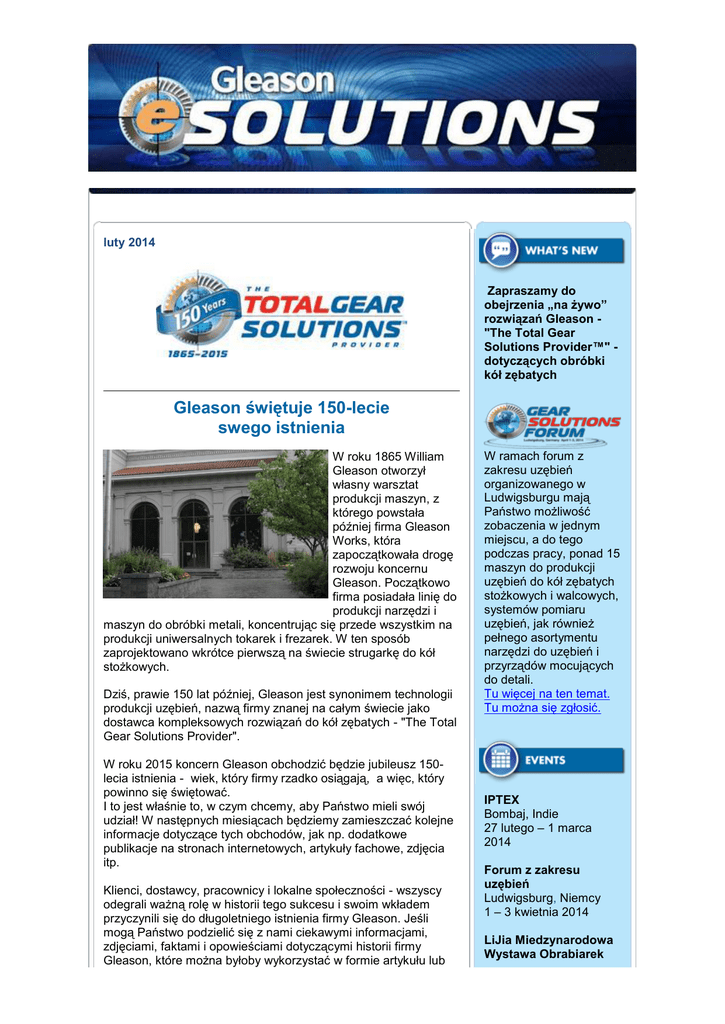 luty 2014 Zapraszamy do obejrzenia „na żywo” rozwiązań Gleason "The Total Gear Solutions Provider™" dotyczących obróbki kół zębatych Gleason świętuje 150-lecie swego istnienia W roku 1865 William Gleason otworzył własny warsztat produkcji maszyn, z którego powstała później firma Gleason Works, która zapoczątkowała drogę rozwoju koncernu Gleason. Początkowo firma posiadała linię do produkcji narzędzi i maszyn do obróbki metali, koncentrując się przede wszystkim na produkcji uniwersalnych tokarek i frezarek. W ten sposób zaprojektowano wkrótce pierwszą na świecie strugarkę do kół stożkowych. Dziś, prawie 150 lat później, Gleason jest synonimem technologii produkcji uzębień, nazwą firmy znanej na całym świecie jako dostawca kompleksowych rozwiązań do kół zębatych - "The Total Gear Solutions Provider". W roku 2015 koncern Gleason obchodzić będzie jubileusz 150lecia istnienia - wiek, który firmy rzadko osiągają, a więc, który powinno się świętować. I to jest właśnie to, w czym chcemy, aby Państwo mieli swój udział! W następnych miesiącach będziemy zamieszczać kolejne informacje dotyczące tych obchodów, jak np. dodatkowe publikacje na stronach internetowych, artykuły fachowe, zdjęcia itp. Klienci, dostawcy, pracownicy i lokalne społeczności - wszyscy odegrali ważną rolę w historii tego sukcesu i swoim wkładem przyczynili się do długoletniego istnienia firmy Gleason. Jeśli mogą Państwo podzielić się z nami ciekawymi informacjami, zdjęciami, faktami i opowieściami dotyczącymi historii firmy Gleason, które można byłoby wykorzystać w formie artykułu lub W ramach forum z zakresu uzębień organizowanego w Ludwigsburgu mają Państwo możliwość zobaczenia w jednym miejscu, a do tego podczas pracy, ponad 15 maszyn do produkcji uzębień do kół zębatych stożkowych i walcowych, systemów pomiaru uzębień, jak również pełnego asortymentu narzędzi do uzębień i przyrządów mocujących do detali. Tu więcej na ten temat. Tu można się zgłosić. IPTEX Bombaj, Indie 27 lutego – 1 marca 2014 Forum z zakresu uzębień Ludwigsburg, Niemcy 1 – 3 kwietnia 2014 LiJia Miedzynarodowa Wystawa Obrabiarek pokazać na wystawie z okazji tego jubileuszu, prosimy o kontakt z nami, jako przedstawicielem firmy Gleason w Polsce. ([email protected]). Prezentacja firmy Gleason Cutting Tools GmbH Chongqing, Chiny 23 – 26 kwietnia 2014 Control Stuttgart, Niemcy 6 – 9 maja 2014 Mach-Tool Poznań, Polska 3 – 6 czerwca 2014 Metalloobrabotka Moskwa, Rosja 16 – 20 czerwca 2014 Z końcem roku 2013 koncern Gleason zakupił od firm IMS Gear GmbH oraz KOEPFER Verzahnungsmaschinen GmbH niemieckie przedsiebiorstwo IMS KOEPFER Cutting Tools GmbH z Eisenbach, z którego utworzono następnie firmę „Gleason Cutting Tools GmbH“. IMS KOEPFER Cutting Tools jest liderem w zakresie technologii, jakości, jak również logistyki dostaw narzędzi do produkcji uzębień. Poprzez silną pozycję rynkową w Europie jak również znaczącą rolę w dziedzinie konstrukcji, projektowania, i produkcji frezów obwiedniowych z węglików spiekanych, firma ta w połączeniu z innymi organizacjami serwisowymi Gleason o światowym zasięgu dysponuje możliwościami dalszego powiększenia obszaru działania, w celu jeszcze lepszej obsługi zarówno lokalnych, jak też globalnych klientów z różnych gałęzi przemysłu. W tym miejscu znajdą Państwo więcej informacji na temat Gleason Cutting Tools GmbH. Możliwości zwiększenia wydajności wiórkarek Gleason z serii ZS Popularne wiórkarki Gleason z serii ZS znajdują z powodzeniem zastosowanie na całym świecie. Tak jak w przypadku każdej innej maszyny do obróbki, główne elementy i podzespoły muszą być regularnie serwisowane i remontowane, aby maszyna i zastosowane procesy były w pełni zoptymalizowane. W zależności od liczy godzin dziennej pracy urządzenia, jak również biorąc pod uwagę konkretne uwarunkowania, typowa wiórkarka po 8 - 14 latach pracy wymaga z reguły określonego zakresu prac remontowych. Jeśli stwierdzą Państwo, że korekcje wymiarów wpływają na obróbkę detalu dopiero po kilku próbach ich wprowadzenia do menu, a następnie wszystkie jednocześnie się kumulują, to być może potrzebny jest remont konika(ów). Jeśli stwierdzą Państwo, że przy wprowadzaniu korekcji linii flanek nie jest osiągany właściwy efekt skrawania materiału oraz proces nie jest powtarzalny, to być może potrzebny jest remont głowicy do wiórkowania. W tym miejscu znajdą Państwo więcej informacji na temat programu remontowego maszyn Gleason. Wyłączny przedstawiciel Gleason w Polsce EUROPEAN TECHNOLOGY Sp. z o.o., Sp. k. ul. Libijska 10 03 – 977 Warszawa http://www.eurotec.pl Osoby kontaktowe: Obrabiarki, maszyny pomiarowe: Szymon Ratajczak [email protected] Serwis, części zamienne, narzędzia, systemy mocowań: Beata Czarnecka [email protected] Tel. (22) 617 46 41 Fax (22) 616 31 09 Aby uzyskać więcej informacji o rozwiązaniach z zakresu produkcji kół zębatych, prosimy o kontakt z nami. [email protected] | Gleason Corporation, 1000 University Ave, Rochester, NY 14692 Copyright © 2014. All Rights Reserved.