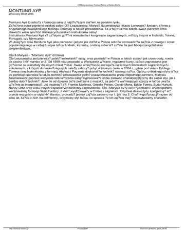 II Miêdzynarodowy Festiwal Tañca w Bielsku-Bia³ej MONTUNO AYÉ Zmieniony 08.01.2008. Montuno Ayé to szko?a i formacja salsy z najd?u?szym sta?em na polskim rynku. Za?o?ona przez pionierki polskiej salsy: Ol? Leszczewicz, Marysi? Szumielewicz i Kasie Lorkowsk? – s?ynie z oryginalnego nowojorskiego feelingu i precyzji w nauce prowadzenia. To w tej w?a?nie szkole swoje pierwsze kroki stawia?o wielu spo?ród dzisiejszych polskich instruktorów salsy! Instruktorzy Montuno Ayé s? cz?stymi go??mi warsztatów i kongresów zagranicznych, mi?dzy innymi w Holandii, ?otwie, Portugalii, czy Niemczech. W ubieg?ym roku Montuno Ayé jako pierwsza i jedyna jak dot?d w Polsce szko?a wprowadzi?a zaj?cia z nowego i coraz popularniejszego w ca?ej Europie ta?ca – kizomby, o której mówi si? cz?sto ?e jest „angola?skim tangiem”. Ola & Marysia - "Montuno Ayé" (Polska) Ola Leszczewicz jest pierwsz? polsk? instruktork? salsy, oraz pionierk? w Polsce w takich stylach jak cross-body, rueda de casino i NY mambo on2. Od 1999 roku prowadzi w Warszawie w?asne, regularne kursy, cz?sto zapraszana jest go?cinnie na warsztaty do innych miast Polski. Swoje umiej?tno?ci rozwija?a na licznych festiwalach zagranicznych i szkoleniach, z których do najwa?niejszych nale?y zaliczy? pobyt w Nowym Jorku w 2004 r., gdzie pod okiem Eddiego Torresa oraz instruktorów z formacji Abakua i Fogarate doskonali?a technik? swojego ta?ca. Oprócz unikalnego stylu ta?ca do perfekcji opanowa?a tak?e technik? prowadzenia godn? pozazdroszczenia przez niejednego partnera. Marysia Szumielewicz poprzez wszystkie lata ta?czenia salsy wypracowa?a sobie zarówno charakterystyczny dla siebie styl, jak i bardzo dobr? technik?. Jako ?e od dziecka by?a zwi?zana z muzyk?, za jedn? z wa?niejszych rzeczy w ta?cu uwa?a w?a?nie jej interpretacj?. Jej inspiracj? s?: Frankie Martinez, Griselle Ponce, Candy Mena, Eddie Torres, Burju Hurturk, Nancy Ortiz oraz wielu innych wspania?ych tancerzy i instruktorów. Ola i Marysia by?y za?o?ycielkami i choreografami warszawskiej formacji Salsa Factory, z któr? wyst?powa?y w Polsce i zagranic?. Obydwie dziewczyny specjalizuj? si? przede wszystkim w stylu NY Mambo, prowadz? jednak zaj?cia zarówno na 1, jak i na 2. Cho? wspó?pracuj? razem od kilku lat, ka?da z nich ma odmienny, oryginalny styl ta?ca, co sprawia ?e ich zaj?cia maj? niepowtarzalny charakter. http://festiwal.bielsko.pl Kreator PDF Utworzono 8 March, 2017, 18:46