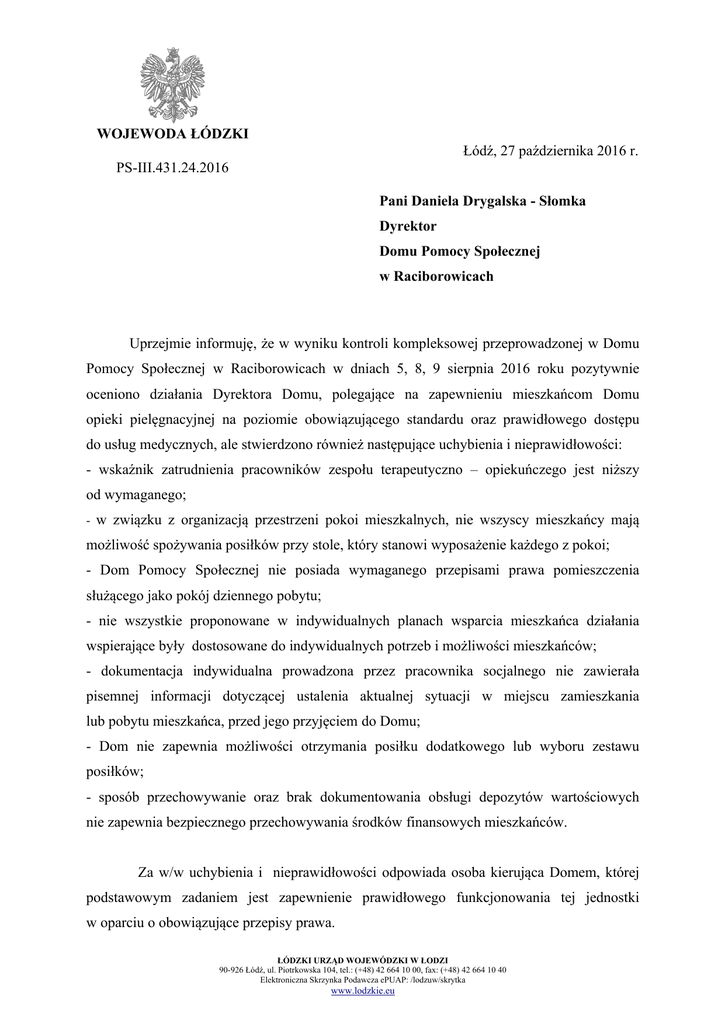 WOJEWODA ŁÓDZKI Łódź, 27 października 2016 r. PS-III.431.24.2016 Pani Daniela Drygalska - Słomka Dyrektor Domu Pomocy Społecznej w Raciborowicach Uprzejmie informuję, że w wyniku kontroli kompleksowej przeprowadzonej w Domu Pomocy Społecznej w Raciborowicach w dniach 5, 8, 9 sierpnia 2016 roku pozytywnie oceniono działania Dyrektora Domu, polegające na zapewnieniu mieszkańcom Domu opieki pielęgnacyjnej na poziomie obowiązującego standardu oraz prawidłowego dostępu do usług medycznych, ale stwierdzono również następujące uchybienia i nieprawidłowości: - wskaźnik zatrudnienia pracowników zespołu terapeutyczno – opiekuńczego jest niższy od wymaganego; - w związku z organizacją przestrzeni pokoi mieszkalnych, nie wszyscy mieszkańcy mają możliwość spożywania posiłków przy stole, który stanowi wyposażenie każdego z pokoi; - Dom Pomocy Społecznej nie posiada wymaganego przepisami prawa pomieszczenia służącego jako pokój dziennego pobytu; - nie wszystkie proponowane w indywidualnych planach wsparcia mieszkańca działania wspierające były dostosowane do indywidualnych potrzeb i możliwości mieszkańców; - dokumentacja indywidualna prowadzona przez pracownika socjalnego nie zawierała pisemnej informacji dotyczącej ustalenia aktualnej sytuacji w miejscu zamieszkania lub pobytu mieszkańca, przed jego przyjęciem do Domu; - Dom nie zapewnia możliwości otrzymania posiłku dodatkowego lub wyboru zestawu posiłków; - sposób przechowywanie oraz brak dokumentowania obsługi depozytów wartościowych nie zapewnia bezpiecznego przechowywania środków finansowych mieszkańców. Za w/w uchybienia i nieprawidłowości odpowiada osoba kierująca Domem, której podstawowym zadaniem jest zapewnienie prawidłowego funkcjonowania tej jednostki w oparciu o obowiązujące przepisy prawa. ŁÓDZKI URZĄD WOJEWÓDZKI W ŁODZI 90-926 Łódź, ul. Piotrkowska 104, tel.: (+48) 42 664 10 00, fax: (+48) 42 664 10 40 Elektroniczna Skrzynka Podawcza ePUAP: /lodzuw/skrytka www.lodzkie.eu Główną przyczyną powstania nieprawidłowości i uchybień jest niewystarczająca znajomość przepisów prawa z zakresu pomocy społecznej. Na podstawie art. 128 ust. 1 ustawy z dnia 12 marca 2004 r. o pomocy społecznej (Dz. U. z 2016 poz. 930) zalecam: 1. Wypełnić wymóg dotyczący spełnienia standardu w zakresie osiągnięcia wskaźnika zatrudnienia pracowników zespołu terapeutyczno – opiekuńczego. 2. Zapewnić mieszkańcom możliwość spożywania posiłków w pokojach poprzez taką organizację przestrzeni, która umożliwi każdemu z mieszkańców spożywanie posiłku przy stole. 3. Wypełnić wymóg dotyczący spełnienia standardu w zakresie posiada pomieszczenia służącego jako pokój dziennego pobytu, 4. W indywidualnych planach wsparcia mieszkańca określać cele pracy wspierającej w taki sposób, aby na ich podstawie można było stwierdzić czy są one dostosowane do indywidualnych potrzeb i możliwości mieszkańców, 5. Każdorazowo przed przyjęciem mieszkańca do Domu ustalać jego aktualną sytuację w miejscu zamieszkania lub pobytu. 6. Zapewnić mieszkańcom możliwość wyboru zestawu posiłków lub możliwość otrzymania posiłku dodatkowego. 7.Zapewnić mieszkańcom bezpieczne przechowywanie środków finansowych oraz prowadzić dokumentację w tym zakresie. Zalecenia należy wykonać niezwłocznie. Zgodnie z art. 128 ust. 2 ustawy o pomocy społecznej z dnia 12 marca 2004 roku (Dz. U. z 2016 poz. 930 ) jednostce kontrolowanej przysługuje, w terminie 7 dni od daty otrzymania zaleceń pokontrolnych, prawo zgłoszenia do nich zastrzeżeń. W przypadku braku zastrzeżeń jednostka kontrolowana obowiązana jest poinformować Wojewodę Łódzkiego o realizacji zaleceń w terminie 30 dni od daty ich otrzymania. Z poważaniem Z up. WOJEWODY ŁÓDZKIEGO Małgorzata Pyka Zastępca Dyrektora Wydziału Rodziny i Polityki Społecznej