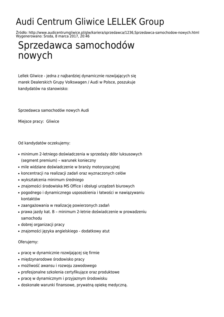 Audi Centrum Gliwice LELLEK Group Źródło: http://www.audicentrumgliwice.pl/glw/kariera/sprzedawca/1236,Sprzedawca-samochodow-nowych.html Wygenerowano: Środa, 8 marca 2017, 20:46 Sprzedawca samochodów nowych Lellek Gliwice - jedna z najbardziej dynamicznie rozwijających się marek Dealerskich Grupy Volkswagen / Audi w Polsce, poszukuje kandydatów na stanowisko: Sprzedawca samochodów nowych Audi Miejsce pracy: Gliwice Od kandydatów oczekujemy: ● minimum 2-letniego doświadczenia w sprzedaży dóbr luksusowych (segment premium) – warunek konieczny ● mile widziane doświadczenie w branży motoryzacyjnej ● koncentracji na realizacji zadań oraz wyznaczonych celów ● wykształcenia minimum średniego ● znajomości środowiska MS Office i obsługi urządzeń biurowych ● pogodnego i dynamicznego usposobienia i łatwości w nawiązywaniu kontaktów ● zaangażowania w realizację powierzonych zadań ● prawa jazdy kat. B – minimum 2-letnie doświadczenie w prowadzeniu samochodu ● dobrej organizacji pracy ● znajomości języka angielskiego - dodatkowy atut Oferujemy: ● pracę w dynamicznie rozwijającej się firmie ● międzynarodowe środowisko pracy ● możliwość awansu i rozwoju zawodowego ● profesjonalne szkolenia certyfikujące oraz produktowe ● pracę w dynamicznym i przyjaznym środowisku ● doskonałe warunki finansowe, prywatną opiekę medyczną. Zainteresowanych kandydatów prosimy o wysłanie CV na adres e-mail: [email protected] lub złożenie oferty bezpośrednio w recepcji Salonu po adresem: Audi Centrum Gliwice ul. Portowa 2 | 44-100 Gliwice (recepcja salonu Audi) Koniecznie z dopiskiem jakiego stanowiska dotyczy aplikacja: (SPRZEDAŻ /NOWE / AUDI) Prosimy o dopisanie następującej klauzuli: "Wyrażam zgodę na przetwarzanie moich danych osobowych zawartych w mojej ofercie pracy dla potrzeb niezbędnych do realizacji procesu obecnej i przyszłych rekrutacji zgodnie z ustawą z dnia 29 sierpnia 1997 r. o ochronie danych osobowych (tekst jednolity z dnia 25 listopada 2015 r. (Dz.U. Nr 2015, poz. 2135 ze zm.)" Dziękujemy za wszystkie aplikacje. Jednocześnie informujemy, że odpowiemy tylko na wybrane oferty.