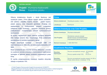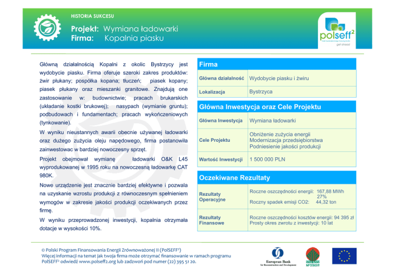HISTORIA SUKCESU Projekt: Wymiana ładowarki Firma: Kopalnia piasku działalnością Kopalni Przed wydobycie piasku. Firma oferuje Główną modernizacją z okolic Bystrzycy jest szeroki zakres produktów: żwir płukany; pospółka kopana; tłuczeń; piasek kopany; piasek płukany oraz mieszanki granitowe. Znajdują one zastosowanie w: budownictwie; (układanie kostki brukowej); pracach Firma Po modernizacji Główna działalność Wydobycie piasku i żwiru Lokalizacja Bystrzyca brukarskich nasypach (wymianie gruntu); Główna Inwestycja oraz Cele Projektu podbudowach i fundamentach; pracach wykończeniowych (tynkowanie). Główna Inwestycja Wymiana ładowarki Cele Projektu Obniżenie zużycia energii Modernizacja przedsiębiorstwa Podniesienie jakości produkcji Wartość Inwestycji 1 500 000 PLN W wyniku nieustannych awarii obecnie używanej ładowarki oraz dużego zużycia oleju napędowego, firma postanowiła zainwestowac w bardziej nowoczesny sprzęt. Projekt obejmował wymianę ładowarki O&K L45 wyprodukowanej w 1995 roku na nowoczesną ładowarkę CAT 980K. Oczekiwane Rezultaty Nowe urządzenie jest znacznie bardziej efektywne i pozwala na uzyskanie wzrostu produkcji z równoczesnym spełnieniem wymogów w zakresie jakości produkcji oczekiwanych przez Rezultaty Operacyjne Roczne oszczędności energii: 167,88 MWh 27% Roczny spadek emisji CO2: 44,32 ton Rezultaty Finansowe Roczne oszczędności kosztów energii: 94 395 zł Prosty okres zwrotu z inwestycji: 10 lat firmę. W wyniku przeprowadzonej inwestycji, kopalnia otrzymała dotacje w wysokości 10%. © Polski Program Finansowania Energii Zrównoważonej II (PolSEFF2) Więcej informacji na temat jak twoja firma może otrzymać finansowanie w ramach programu PolSEFF2 odwiedź www.polseff2.org lub zadzwoń pod numer (22) 395 51 20. HISTORIA SUKCESU Projekt: Wymiana ładowarki Firma: Kopalnia piasku Przed Modernizacją Inwestycja / Rodzaj Urządzenia Wartość inwestycji Rok produkcji Roczna produkcja Wzrost produkcji z tytułu wymiany Zużycie energii Po Modernizacji j.m. Przed Modernizacją Po Modernizacji - O&K L45 CAT 980K PLN -‐-‐ 1 500 000 - 1995 2013 t/rok 758 347 1 040 522 % 27,1 l/rok 59 574 43 299 Jednostkowe Zużycie energii l/h 29,79 21,65 Oszczędności energii % 27,3 t/rok 44,32 PLN/rok 94 395 Zmniejszenie emisji CO2 Oszczędności kosztów zużycia energii © Polski Program Finansowania Energii Zrównoważonej II (PolSEFF2) Więcej informacji na temat jak twoja firma może otrzymać finansowanie w ramach programu PolSEFF2 odwiedź www.polseff2.org lub zadzwoń pod numer (22) 395 51 20.