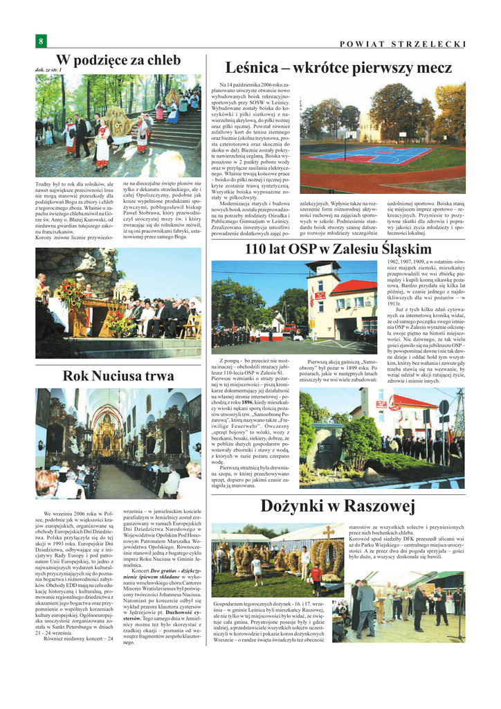 8 W podziêce za chleb dok. ze str. 1 Trudny by³ to rok dla rolników, ale nawet najwiêksze przeciwnoci losu nie mog¹ stanowiæ przeszkody dla podziêkowañ Bogu za zbiory i chleb z tegorocznego zbo¿a. W³anie o zapachu wie¿ego chleba mówi³ na Górze w. Anny o. B³a¿ej Kurowski, od niedawna gwardian tutejszego zakonu franciszkanów. Korony ¿niwne licznie przywiezio- ne na diecezjalne wiêto plonów nie tylko z dekanatu strzeleckiego, ale i ca³ej Opolszczyzny, podobne jak kosze wype³nione produktami spo¿ywczymi, pob³ogos³awi³ biskup Pawe³ Stobrawa, który przewodniczy³ uroczystej mszy w. i który zwracaj¹c siê do rolnikmów mówi³, i¿ s¹ oni pracownikami fabryki, ustanowionej przez samego Boga. Rok Nuciusa trwa We wrzeniu 2006 roku w Polsce, podobnie jak w wiêkszoci krajów europejskich, organizowane s¹ obchody Europejskich Dni Dziedzictwa. Polska przy³¹czy³a siê do tej akcji w 1993 roku. Europejskie Dni Dziedzictwa, odbywaj¹ce siê z inicjatywy Rady Europy i pod patronatem Unii Europejskiej, to jedno z najwa¿niejszych wydarzeñ kulturalnych przyczyniaj¹cych siê do poznania bogactwa i ró¿norodnoci zabytków. Obchody EDD maj¹ na celu edukacjê historyczn¹ i kulturaln¹, promowanie regionalnego dziedzictwa z ukazaniem jego bogactwa oraz przypomnienie o wspólnych korzeniach kultury europejskiej. Ogólnoeuropejska uroczystoæ zorganizowana zosta³a w Sankt Petersburgu w dniach 21 - 24 wrzenia. Równie¿ niedawny koncert 24 wrzenia w jemielnickim kociele parafialnym w Jemielnicy zosta³ zorganizowany w ramach Europejskich Dni Dziedzictwa Narodowego w Województwie Opolskim Pod Honorowym Patronatem Marsza³ka Województwa Opolskiego. Równoczenie stanowi³ jedn¹ z bogatego cyklu imprez Roku Nuciusa w Gminie Jemielnica. Koncert Deo gratias - dziêkczynienie piewem sk³adane w wykonaniu wroc³awskiego chóru Cantores Minores Wratislavienses by³ powiêcony twórczoci Johannesa Nuciusa. Natomiast po koncercie odby³ siê wyk³ad przeora klasztoru cystersów w Jêdrzejowie pt. Duchowoæ cystersów. Tego samego dnia w Jemielnicy mo¿na te¿ by³o skorzystaæ z rzadkiej okazji poznania od wewn¹trz fragmentów zespo³u klasztornego. POWIAT STR Z E LE C K I Lenica wkrótce pierwszy mecz Na 14 padziernika 2006 roku zaplanowano uroczyste otwarcie nowo wybudowanych boisk rekreacyjnosportowych przy SOSW w Lenicy. Wybudowane zosta³y boiska do koszykówki i pi³ki siatkowej z nawierzchni¹ akrylow¹, do pi³ki no¿nej oraz pi³ki rêcznej. Powsta³ równie¿ asfaltowy kort do tenisa ziemnego oraz bie¿nie (okólna trzytorowa, prosta czterotorowa oraz skocznia do skoku w dal). Bie¿nie zosta³y pokryte nawierzchni¹ ceglan¹. Boiska wyposa¿ono w 2 punkty poboru wody oraz w przy³¹cze zasilania elektrycznego. W³anie trwaj¹ koñcowe prace boisko do pi³ki no¿nej i rêcznej pokryte zostanie traw¹ syntetyczn¹. Wszystkie boiska wyposa¿one zosta³y w pi³kochwyty. Modernizacja starych i budowa nowych boisk zosta³a przeprowadzona na potrzeby m³odzie¿y Orodka i Publicznego Gimnazjum w Lenicy. Zrealizowana inwestycja umo¿liwi prowadzenie dodatkowych zajêæ po- zalekcyjnych. Wp³ynie tak¿e na rozszerzenie form ró¿norodnej aktywnoci ruchowej na zajêciach sportowych w szkole. Podniesienie standardu boisk stworzy szansê dalszego rozwoju m³odzie¿y szczególnie uzdolnionej sportowo. Boiska stan¹ siê miejscem imprez sportowo rekreacyjnych. Przyniesie to pozytywne skutki dla zdrowia i poprawy jakoci ¿ycia m³odzie¿y i spo³ecznoci lokalnej. Pierwsz¹ akcj¹ ganicz¹ Samoobrony by³ po¿ar w 1899 roku. Po po¿arach, jakie w nastêpnych latach zniszczy³y we wsi wiele zabudowañ: 1902, 1907, 1909, a w ostatnim -równie¿ maj¹tek ziemski, mieszkañcy przeprowadzili we wsi zbiórkê pieniêdzy i kupili konn¹ sikawkê po¿arow¹. Bardzo przyda³a siê kilka lat póniej, w czasie jednego z najdotkliwszych dla wsi po¿arów w 1913r. Ju¿ z tych kilku zdañ cytowanych za internetow¹ kronik¹ widaæ, ¿e od samego pocz¹tku swego istnienia OSP w Zalesiu wyranie odcisnê³a swoje piêtno na historii miejscowoci. Nic dziwnego, ¿e tak wielu goci zjawi³o siê na jubileuszu OSP by powspominaæ dawne i nie tak dawne dzieje i oddaæ ho³d tym wszystkim, którzy bez wahania i zawsze gdy trzeba stawi¹ siê na wezwanie, by wzi¹æ udzia³ w akcji ratuj¹cej ¿ycie, zdrowie i mienie innych. 110 lat OSP w Zalesiu l¹skim Z pomp¹ - bo przecie¿ nie mo¿na inaczej obchodzili stra¿acy jubileusz 110-lecia OSP w Zalesiu l. Pierwsze wzmianki o stra¿y po¿arnej w tej miejscowoci pisz¹ kronikarze dokumentuj¹cy jej dzia³alnoæ na w³asnej stronie internetowej - pochodz¹ z roku 1896, kiedy mieszkañcy wioski nêkani spor¹ iloci¹ po¿arów utworzyli tzw. Samoobronê Po¿arow¹, któr¹ nazywano tak¿e Freiwilige Feuerwehr. Ówczesny sprzêt bojowy to wózki, wozy z beczkami, bosaki, siekiery, dobrze, ¿e w pobli¿u du¿ych gospodarstw powstawa³y zbiorniki i stawy z wod¹, z których w razie po¿aru czerpano wodê. Pierwsz¹ stra¿nic¹ by³a drewniana szopa, w której przechowywano sprzêt, dopiero po jakim czasie zast¹pi³a j¹ murowana. Do¿ynki w Raszowej starostów ze wszystkich so³ectw i przyniesionych przez nich bochenkach chleba. Korowód spod siedziby DFK przeszed³ ulicami wsi a¿ do Parku Wiejskiego centralnego miejsca uroczystoci. A ¿e przez dwa dni pogoda sprzyja³a goci by³o du¿o, a wszyscy doskonale siê bawili. Gospodarzem tegorocznych do¿ynek - 16. i 17. wrzenia w gminie Lenica byli mieszkañcy Raszowej, ale nie tylko w tej miejscowoci by³o widaæ, ¿e wiêtuje ca³a gmina. Przystrojone posesje by³y i gdzie indziej, a przedstawiciele wszystkich so³ectw uczestniczyli w korowodzie i pokazie koron do¿ynkowych Wreszcie o randze wiêta wiadczy³a te¿ obecnoæ