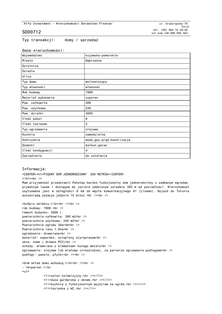 'Alfa Investment - Nieruchomości Doradztwo Finanse' SD00712 Typ transakcji: ul. Grudziądzka 79 Toruń tel. (56) 664 10 25/26 tel.kom +48 888 658 303 domy / sprzedaż Dane nieruchomości: Województwo kujawsko-pomorskie Miasto Wąbrzeźno Dzielnica Osiedle Ulica Typ domu wolnostojący Typ własności własność Rok budowy 1988 Materiał wykonania suporex Pow. całkowita 300 Pow. użytkowa 240 Pow. działki 3000 Ilość pokoi 6 Ilość łazienek 2 Typ ogrzewania olejowe Kuchnia samodzielna Uzbrojenie woda,gaz,prąd,kanalizacja Dodatki balkon,garaż Ilość kondygnacji 4 Zasiedlenie do ustalenia Informacje: <CENTER><h1>PIĘKNY DOM JEDNORODZINNY 300 METRÓW</CENTER> </h1><br /> Mam przyjemność przedstawić Państwu bardzo funkcjonalny dom jednorodzinny z zadbanym ogrodem, prywatnym lasem i dostępem do jeziora oddalonym zaledwie 300 m od posiadłości. Nieruchomość usytuowana jest w odległości 6 km od węzła komunikacyjnego A1 (Lisewo). Dojazd do Torunia autostradą zajmuje jedynie 15 minut.<br /><br /> <b>Opis obiektu:</b><br /><br /> rok budowy: 1988 <br /> remont budynku: 2008 r. powierzchnia całkowita: 300 m2<br /> powierzchnia użytkowa: 240 m2<br /> Powierzchnia ogrodu 30arów<br /> Powierzchnia lasu 1,5ha<br /> ogrodzenie: drewniane<br /> materiał: suporeks, ocieplony styropianem<br /> okna: nowe ( drewno PCV)<br /> schody: drewniane z elementami kutego metalu<br /> ogrzewanie: olejowe lub miałowe (niezależne), na parterze ogrzewanie podłogowe<br /> podłogi: panele, płytki<br /><br /> <b>W skład domu wchodzą:</b><br /><br /> - <b>parter:</b> <ul> <li>salon telewizyjny,<br /></li> <li>duża garderoba z oknem,<br /></li> <li>kuchnia z funkcjonalnym wyjściem na ogród,<br /></li> <li>łazienka z WC,<br /></li> <li>przedpokój.</li> </ul> - <b>półpiętro:</b><br /> <br /> <ul> <li>salon stołowy z wyjściem na imponujący taras,</li> <li>pokój gościnny.</li> </ul> - <b>piętro:</b><br /> <ul> <li>3 sypialnie,</li> <li>łazienka z WC,</li> <li>przedpokój.</li> </ul> -<b>piwnica</b> (Wszędzie kafle na podłogach) :<br /> <ul> <li>spiżarnia,<br /> pomieszczenie gospodarcze,<br /> pokój letni z wyjściem na ogród (okna nowego typu – drewniane)</li> <li>pomieszczenia techniczne</li> </ul> -<b>garaż:</b> <ul> <li>jednostanowiskowy -przybudowany</li> </ul><br />Jeśli marzycie Państwo by zamieszkać w enklawie ciszy i spokoju z dala od wielkomiejskiego zgiełku to ta oferta spełni Państwa oczekiwania. To raj dla ludzi ceniących spokój i kontakt z naturą. Jednocześnie stąd do najbliższych obiektów infrastruktury miejskiej jest 700m. Znajdują się tu: urząd, szkoła, sklepy, apteka, kościół.Dom jest po kapitalnym remoncie. Stan techniczny: bardzo dobry. W najbliższej okolicy znajduje się ośrodek wypoczynkowy w Przydworzu, co umożliwia uprawianie sportów wodnych i podnosi atrakcyjność tej lokalizacji. <br /><br />GORĄCO POLECAM !!!Serdecznie zapraszam na prezentację domu, z przyjemnością odpowiem Państwu na wszelkie pytania oraz udzielę dodatkowych informacji.<br /><br /> Dorota Korajczyk, tel.885-870-695, [email protected].<br /><br /><br /><br /> Pośrednik odpowiedzialny zawodowo: Paweł Dawidowicz licencja pośrednika w obrocie nieruchomościami 7432 Andrzej Pamin licencja pośrednika w obrocie nieruchomościami 1145. UWAGA!!! BEZPŁATNIE POMAGAMY W UZYSKANIU KREDYTU NA ZAKUP NIERUCHOMOŚCI. WSPÓŁPRACUJEMY Z WIELOMA BANKAMI. Treść niniejszego ogłoszenia nie stanowi oferty handlowej w rozumieniu przepisów Kodeksu Cywilnego. Więcej ofert na www.alfa-investment.pl ZAPRASZAMY! Cena: 999 000 PLN Dokument wygenerowany ze strony www.alfa-investment.pl Strona 2