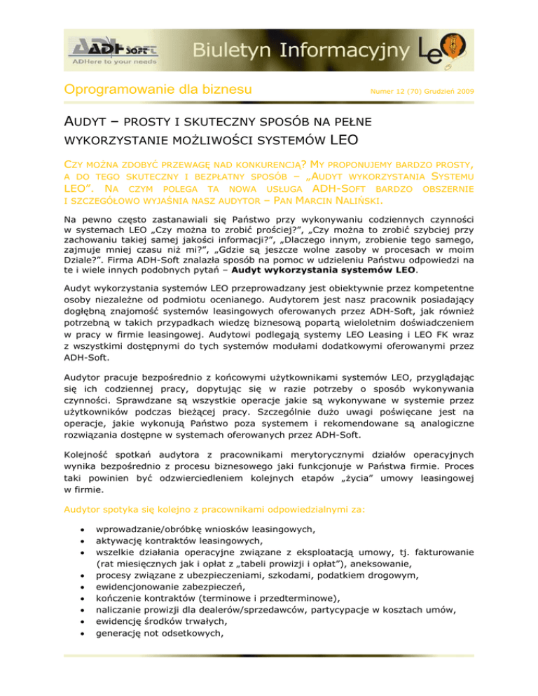 Oprogramowanie dla biznesu Numer 12 (70) Grudzień 2009 AUDYT – PROSTY I SKUTECZNY SPOSÓB NA PEŁNE WYKORZYSTANIE MOśLIWOŚCI SYSTEMÓW LEO CZY MOśNA ZDOBYĆ PRZEWAGĘ NAD KONKURENCJĄ? MY PROPONUJEMY BARDZO PROSTY, A DO TEGO SKUTECZNY I BEZPŁATNY SPOSÓB – „AUDYT WYKORZYSTANIA SYSTEMU LEO”. NA CZYM POLEGA TA NOWA USŁUGA ADH-SOFT BARDZO OBSZERNIE I SZCZEGÓŁOWO WYJAŚNIA NASZ AUDYTOR – PAN MARCIN NALIŃSKI. Na pewno często zastanawiali się Państwo przy wykonywaniu codziennych czynności w systemach LEO „Czy moŜna to zrobić prościej?”, „Czy moŜna to zrobić szybciej przy zachowaniu takiej samej jakości informacji?”, „Dlaczego innym, zrobienie tego samego, zajmuje mniej czasu niŜ mi?”, „Gdzie są jeszcze wolne zasoby w procesach w moim Dziale?”. Firma ADH-Soft znalazła sposób na pomoc w udzieleniu Państwu odpowiedzi na te i wiele innych podobnych pytań – Audyt wykorzystania systemów LEO. Audyt wykorzystania systemów LEO przeprowadzany jest obiektywnie przez kompetentne osoby niezaleŜne od podmiotu ocenianego. Audytorem jest nasz pracownik posiadający dogłębną znajomość systemów leasingowych oferowanych przez ADH-Soft, jak równieŜ potrzebną w takich przypadkach wiedzę biznesową popartą wieloletnim doświadczeniem w pracy w firmie leasingowej. Audytowi podlegają systemy LEO Leasing i LEO FK wraz z wszystkimi dostępnymi do tych systemów modułami dodatkowymi oferowanymi przez ADH-Soft. Audytor pracuje bezpośrednio z końcowymi uŜytkownikami systemów LEO, przyglądając się ich codziennej pracy, dopytując się w razie potrzeby o sposób wykonywania czynności. Sprawdzane są wszystkie operacje jakie są wykonywane w systemie przez uŜytkowników podczas bieŜącej pracy. Szczególnie duŜo uwagi poświęcane jest na operacje, jakie wykonują Państwo poza systemem i rekomendowane są analogiczne rozwiązania dostępne w systemach oferowanych przez ADH-Soft. Kolejność spotkań audytora z pracownikami merytorycznymi działów operacyjnych wynika bezpośrednio z procesu biznesowego jaki funkcjonuje w Państwa firmie. Proces taki powinien być odzwierciedleniem kolejnych etapów „Ŝycia” umowy leasingowej w firmie. Audytor spotyka się kolejno z pracownikami odpowiedzialnymi za: • • • • • • • • • wprowadzanie/obróbkę wniosków leasingowych, aktywację kontraktów leasingowych, wszelkie działania operacyjne związane z eksploatacją umowy, tj. fakturowanie (rat miesięcznych jak i opłat z „tabeli prowizji i opłat”), aneksowanie, procesy związane z ubezpieczeniami, szkodami, podatkiem drogowym, ewidencjonowanie zabezpieczeń, kończenie kontraktów (terminowe i przedterminowe), naliczanie prowizji dla dealerów/sprzedawców, partycypacje w kosztach umów, ewidencję środków trwałych, generację not odsetkowych, • • • • • księgowość (wprowadzanie wyciągów, płatności wychodzące, naliczanie amortyzacji, naliczanie rezerw, rozrachunki z klientami), windykację (generację wezwań do zapłaty, wypowiedzeń umów, kontakt z agencjami windykacyjnymi i kancelariami prawnymi), raportowanie do GIIF, zarządzanie tabelami kursów walut i stóp procentowych, zarządzanie uŜytkownikami. Dodatkowo, w kaŜdej instytucji istnieją jeszcze specyficzne procesy, w których pracownicy np. działu marketingu korzystają z LEO Leasing, w związku z czym ostateczny kształt audytu jest bardzo spersonalizowany i dostosowany do specyfiki konkretnej firmy leasingowej. Jak uŜytkownicy mogą przyczynić się do większego sukcesu audytu? Po pierwsze: powinni wykonywać swoją bieŜącą pracę. Naczelnym zadaniem audytora jest – nie przeszkadzać w bieŜącej pracy osoby merytorycznej. Po drugie: w związku z faktem, iŜ nie zawsze wykonywane są wszystkie dostępne czynności bieŜące, naleŜy, jeŜeli jest to moŜliwe, tak ustawić sobie pracę, aby moŜliwie duŜo czynności wykonać podczas wizyty audytora. PrzecieŜ obu stronom zaleŜy na pokazaniu/zobaczeniu, a w konsekwencji usprawnieniu wszystkich procesów biznesowych. Po trzecie: jeŜeli wykonanie jakichś czynności nie jest moŜliwe w danej chwili (np. naliczenie amortyzacji), naleŜy posiadać przygotowaną odpowiednio bazę testową, tak aby pracownik mógł pokazać jak wykonuje daną czynność, a nie tylko o niej opowiedzieć audytorowi. Po czwarte: naleŜy zastanowić się, co przeszkadza w uŜytkowaniu systemów LEO, jakie usprawnienia chętnie by pracownik widział w systemach LEO, itp. Przy tej okazji chciałbym nadmienić, Ŝe audytor nie jest „przenośnym systemem zgłaszania błędów”, dlatego wszelkie zauwaŜone błędy i usterki naleŜy zgłaszać jak dotychczas do Serwisu LEO poprzez dedykowany do tego system TestTrack. Po zakończeniu audytu przygotowywany jest raport, w którym wykazane są procesy, które według audytora mogą podlegać ulepszeniom wraz z sugestią, co dokładnie naleŜy wykonać, aby usprawnić dany proces. Sugerowane zmiany podzielone są na trzy grupy: • • • zmiany moŜliwe do wprowadzenia przez Państwa Dział IT za pomocą posiadanych juŜ funkcjonalności i modułów, zmiany moŜliwe do wprowadzenia bezpłatnie przez ADH-Soft w ramach rozwoju systemów, zmiany moŜliwe do wprowadzenia przez ADH-Soft po uzgodnieniu zakresu zmian, jakich Państwo oczekujecie i zaakceptowaniu przedstawionej oferty na modyfikację systemu. Mam nadzieję, Ŝe powyŜszy tekst pozwoli Państwu na bardzo dobre przygotowanie się do audytu systemów LEO, co z kolei przełoŜy się na poznanie przez audytora pełnej pracy wykonywanej w Państwa organizacji związanej z zawieraniem i obsługą kontraktów leasingowych. Mam równieŜ nadzieję, Ŝe przedstawione w raporcie z audytu wnioski przełoŜą się na znaczne poprawienie wydajności pracy i zmniejszenie nakładów na czynności wykonywane poza systemem LEO. Marcin Naliński (napisz do autora)