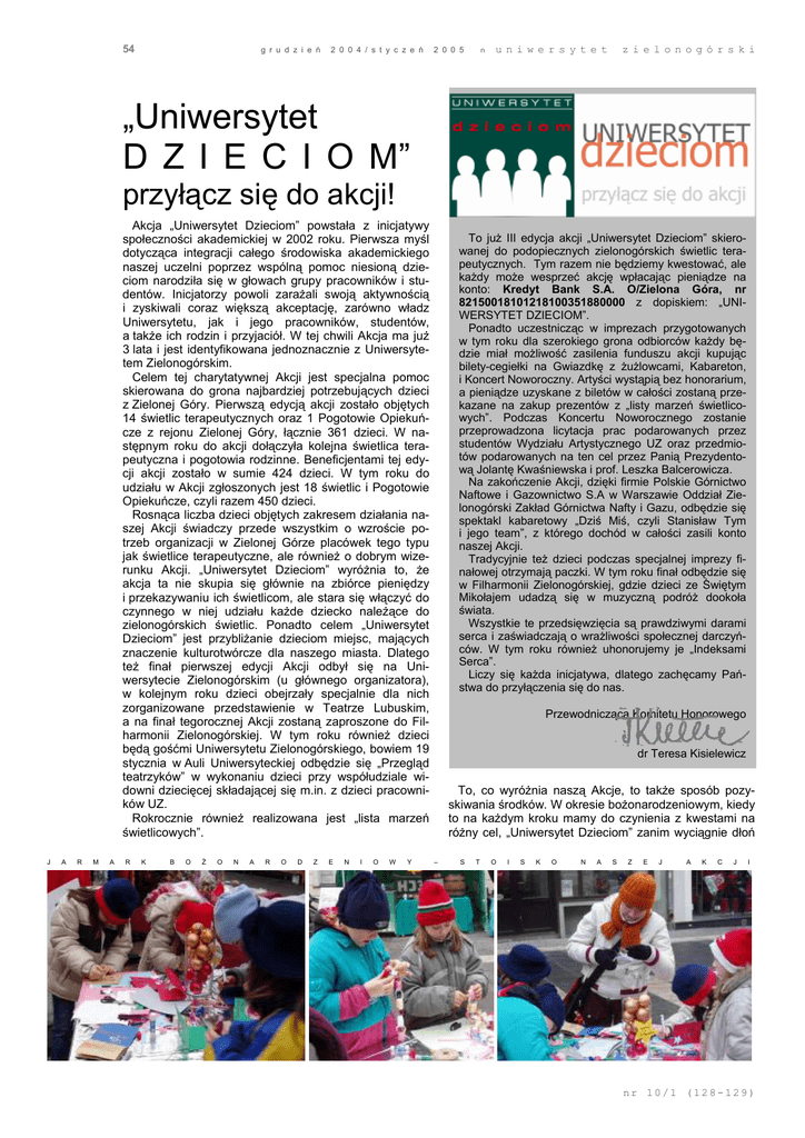 54 g r u d z i e ń 2 0 0 4 / s t y c z e ń 2 0 0 5 Q uniwersytet zielonogórski „Uniwersytet D Z I E C I O M” przyłącz się do akcji! Akcja „Uniwersytet Dzieciom” powstała z inicjatywy społeczności akademickiej w 2002 roku. Pierwsza myśl dotycząca integracji całego środowiska akademickiego naszej uczelni poprzez wspólną pomoc niesioną dzieciom narodziła się w głowach grupy pracowników i studentów. Inicjatorzy powoli zarażali swoją aktywnością i zyskiwali coraz większą akceptację, zarówno władz Uniwersytetu, jak i jego pracowników, studentów, a także ich rodzin i przyjaciół. W tej chwili Akcja ma już 3 lata i jest identyfikowana jednoznacznie z Uniwersytetem Zielonogórskim. Celem tej charytatywnej Akcji jest specjalna pomoc skierowana do grona najbardziej potrzebujących dzieci z Zielonej Góry. Pierwszą edycją akcji zostało objętych 14 świetlic terapeutycznych oraz 1 Pogotowie Opiekuńcze z rejonu Zielonej Góry, łącznie 361 dzieci. W następnym roku do akcji dołączyła kolejna świetlica terapeutyczna i pogotowia rodzinne. Beneficjentami tej edycji akcji zostało w sumie 424 dzieci. W tym roku do udziału w Akcji zgłoszonych jest 18 świetlic i Pogotowie Opiekuńcze, czyli razem 450 dzieci. Rosnąca liczba dzieci objętych zakresem działania naszej Akcji świadczy przede wszystkim o wzroście potrzeb organizacji w Zielonej Górze placówek tego typu jak świetlice terapeutyczne, ale również o dobrym wizerunku Akcji. „Uniwersytet Dzieciom” wyróżnia to, że akcja ta nie skupia się głównie na zbiórce pieniędzy i przekazywaniu ich świetlicom, ale stara się włączyć do czynnego w niej udziału każde dziecko należące do zielonogórskich świetlic. Ponadto celem „Uniwersytet Dzieciom” jest przybliżanie dzieciom miejsc, mających znaczenie kulturotwórcze dla naszego miasta. Dlatego też finał pierwszej edycji Akcji odbył się na Uniwersytecie Zielonogórskim (u głównego organizatora), w kolejnym roku dzieci obejrzały specjalnie dla nich zorganizowane przedstawienie w Teatrze Lubuskim, a na finał tegorocznej Akcji zostaną zaproszone do Filharmonii Zielonogórskiej. W tym roku również dzieci będą gośćmi Uniwersytetu Zielonogórskiego, bowiem 19 stycznia w Auli Uniwersyteckiej odbędzie się „Przegląd teatrzyków” w wykonaniu dzieci przy współudziale widowni dziecięcej składającej się m.in. z dzieci pracowników UZ. Rokrocznie również realizowana jest „lista marzeń świetlicowych”. J A R M A R K B O Ż O N A R O D Z E N I O W Y To już III edycja akcji „Uniwersytet Dzieciom” skierowanej do podopiecznych zielonogórskich świetlic terapeutycznych. Tym razem nie będziemy kwestować, ale każdy może wesprzeć akcję wpłacając pieniądze na konto: Kredyt Bank S.A. O/Zielona Góra, nr 82150018101218100351880000 z dopiskiem: „UNIWERSYTET DZIECIOM”. Ponadto uczestnicząc w imprezach przygotowanych w tym roku dla szerokiego grona odbiorców każdy będzie miał możliwość zasilenia funduszu akcji kupując bilety-cegiełki na Gwiazdkę z żużlowcami, Kabareton, i Koncert Noworoczny. Artyści wystąpią bez honorarium, a pieniądze uzyskane z biletów w całości zostaną przekazane na zakup prezentów z „listy marzeń świetlicowych”. Podczas Koncertu Noworocznego zostanie przeprowadzona licytacja prac podarowanych przez studentów Wydziału Artystycznego UZ oraz przedmiotów podarowanych na ten cel przez Panią Prezydentową Jolantę Kwaśniewska i prof. Leszka Balcerowicza. Na zakończenie Akcji, dzięki firmie Polskie Górnictwo Naftowe i Gazownictwo S.A w Warszawie Oddział Zielonogórski Zakład Górnictwa Nafty i Gazu, odbędzie się spektakl kabaretowy „Dziś Miś, czyli Stanisław Tym i jego team”, z którego dochód w całości zasili konto naszej Akcji. Tradycyjnie też dzieci podczas specjalnej imprezy finałowej otrzymają paczki. W tym roku finał odbędzie się w Filharmonii Zielonogórskiej, gdzie dzieci ze Świętym Mikołajem udadzą się w muzyczną podróż dookoła świata. Wszystkie te przedsięwzięcia są prawdziwymi darami serca i zaświadczają o wrażliwości społecznej darczyńców. W tym roku również uhonorujemy je „Indeksami Serca”. Liczy się każda inicjatywa, dlatego zachęcamy Państwa do przyłączenia się do nas. Przewodnicząca Komitetu Honorowego dr Teresa Kisielewicz To, co wyróżnia naszą Akcje, to także sposób pozyskiwania środków. W okresie bożonarodzeniowym, kiedy to na każdym kroku mamy do czynienia z kwestami na różny cel, „Uniwersytet Dzieciom” zanim wyciągnie dłoń – S T O I S K O N A S Z E J A K C J I nr 10/1 (128-129) uniwersytet zielonogórski Q g r u d z i e ń D Z I E C I O M ” 2 – 10 grudnia 2004 r. godz. 10.00 Wystawa prac plastycznych studentów Wydziału Artystycznego UZ przeznaczonych na aukcję (cena wywoławcza każdej pracy: 50 zł) i do sprzedaży (cena minimalna 50 zł) - Kampus A, hol gmachu głównego Uniwersytetu Zielonogórskiego, ul. Podgórna 50 11 – 22 grudnia 2004 r. w dni powszednie w godz. 15.00 – 18.00, w soboty i niedziele w godz. 12.00 – 15.00 Kiermasz Bożonarodzeniowy – sprzedaż kartek świątecznych przygotowanych przez dzieci ze świetlic terapeutycznych. Podczas kiermaszu każde dziecko, które przyjdzie na stoisko Akcji „Uniwersytet Dzieciom” pod fachowym okiem studentów Pedagogów Wolontariuszy będzie mogło własnoręcznie przygotować ozdobę choinkową - Stary Rynek 12 grudnia 2004 r. godz. 18.00 „Gwiazdka z żużlowcami” - w imprezie udział wzięły gwiazdy polskiego żużla, m.in. Grzegorz Walasek, Andrzej Huszcza, Maciej Kuciapa. Mecze piłki nożnej rozegrały 4 zespoły: ZKŻ Kronopol, Stal Gorzów, Walasek Team i Działacze ZKŻ, z których najlepszym okazał się ten ostatni (w składzie: Robert Dowhan, Andrzej Pilimon, Sławomir Strzempek, Jacek Frątczak, Piotr Turzański, Jarosław Szymkowiak, Grzegorz Czerwiec, Bogdan Wojczal). „ 