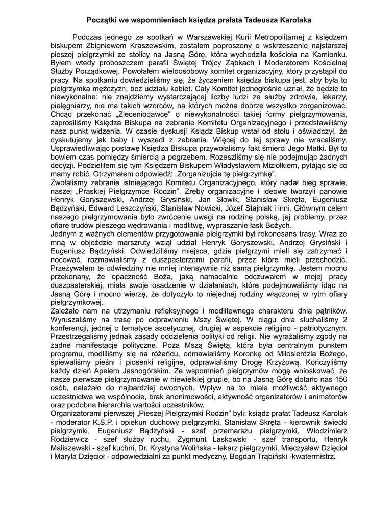Początki we wspomnieniach księdza prałata Tadeusza Karolaka Podczas jednego ze spotkań w Warszawskiej Kurii Metropolitarnej z księdzem biskupem Zbigniewem Kraszewskim, zostałem poproszony o wskrzeszenie najstarszej pieszej pielgrzymki ze stolicy na Jasną Górę, która wychodziła kościoła na Kamionku. Byłem wtedy proboszczem parafii Świętej Trójcy Ząbkach i Moderatorem Kościelnej Służby Porządkowej. Powołałem wieloosobowy komitet organizacyjny, który przystąpił do pracy. Na spotkaniu dowiedzieliśmy się, że życzeniem księdza biskupa jest, aby była to pielgrzymka mężczyzn, bez udziału kobiet. Cały Komitet jednogłośnie uznał, że będzie to niewykonalne: nie znajdziemy wystarczającej liczby ludzi ze służby zdrowia, lekarzy, pielęgniarzy, nie ma takich wzorców, na których można dobrze wszystko zorganizować. Chcąc przekonać „Zleceniodawcę” o niewykonalności takiej formy pielgrzymowania, zaprosiliśmy Księdza Biskupa na zebranie Komitetu Organizacyjnego i przedstawiliśmy nasz punkt widzenia. W czasie dyskusji Ksiądz Biskup wstał od stołu i oświadczył, że dyskutujemy jak baby i wyszedł z zebrania. Więcej do tej sprawy nie wracaliśmy. Usprawiedliwiając postawę Księdza Biskupa przywołaliśmy fakt śmierci Jego Matki. Był to bowiem czas pomiędzy śmiercią a pogrzebem. Rozeszliśmy się nie podejmując żadnych decyzji. Podzieliłem się tym Księdzem Biskupem Władysławem Miziołkiem, pytając się co mamy robić. Otrzymałem odpowiedź: „Zorganizujcie tę pielgrzymkę”. Zwołaliśmy zebranie istniejącego Komitetu Organizacyjnego, który nadał bieg sprawie, naszej „Praskiej Pielgrzymce Rodzin”. Zręby organizacyjne i ideowe tworzyli panowie Henryk Goryszewski, Andrzej Grysiński, Jan Słowik, Stanisław Skręta, Eugeniusz Bądzyński, Edward Leszczyński, Stanisław Nowicki, Józef Stajniak i inni. Głównym celem naszego pielgrzymowania było zwrócenie uwagi na rodzinę polską, jej problemy, przez ofiarę trudów pieszego wędrowania i modlitwę, wypraszanie łask Bożych. Jednym z ważnych elementów przygotowania pielgrzymki był rekonesans trasy. Wraz ze mną w objeździe marszruty wziął udział Henryk Goryszewski, Andrzej Grysiński i Eugeniusz Bądzyński. Odwiedziliśmy miejsca, gdzie pielgrzymi mieli się zatrzymać i nocować, rozmawialiśmy z duszpasterzami parafii, przez które mieli przechodzić. Przeżywałem te odwiedziny nie mniej intensywnie niż samą pielgrzymkę. Jestem mocno przekonany, że opaczność Boża, jaką namacalnie odczuwałem w mojej pracy duszpasterskiej, miała swoje osadzenie w działaniach, które podejmowaliśmy idąc na Jasną Górę i mocno wierzę, że dotyczyło to niejednej rodziny włączonej w rytm ofiary pielgrzymkowej. Zależało nam na utrzymaniu refleksyjnego i modlitewnego charakteru dnia pątników. Wyruszaliśmy na trasę po odprawieniu Mszy Świętej. W ciągu dnia słuchaliśmy 2 konferencji, jednej o tematyce ascetycznej, drugiej w aspekcie religijno - patriotycznym. Przestrzegaliśmy jednak zasady oddzielenia polityki od religii. Nie wyrażaliśmy zgody na żadne manifestacje polityczne. Poza Mszą Świętą, która była centralnym punktem programu, modliliśmy się na różańcu, odmawialiśmy Koronkę od Miłosierdzia Bożego, śpiewaliśmy pieśni i piosenki religijne, odprawialiśmy Drogę Krzyżową. Kończyliśmy każdy dzień Apelem Jasnogórskim. Ze wspomnień pielgrzymów mogę wnioskować, że nasze pierwsze pielgrzymowanie w niewielkiej grupie, bo na Jasną Górę dotarło nas 150 osób, należało do najbardziej owocnych. Wpływ na to miała możliwość aktywnego uczestnictwa we wspólnocie, brak anonimowości, aktywność organizatorów i animatorów oraz podobna hierarchia wartości uczestników. Organizatorami pierwszej „Pieszej Pielgrzymki Rodzin” byli: ksiądz prałat Tadeusz Karolak - moderator K.S.P. i opiekun duchowy pielgrzymki, Stanisław Skręta - kierownik świecki pielgrzymki, Eugeniusz Bądzyński - szef przemarszu pielgrzymki, Włodzimierz Rodziewicz - szef służby ruchu, Zygmunt Laskowski - szef transportu, Henryk Maliszewski - szef kuchni, Dr. Krystyna Wolińska - lekarz pielgrzymki, Mieczysław Dzięcioł i Maryla Dzięcioł - odpowiedzialni za punkt medyczny, Bogdan Trąbiński -kwatermistrz.