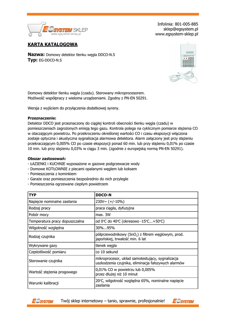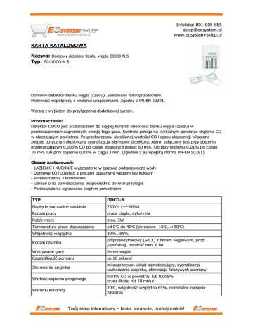 Infolinia: 801-005-885 [email protected] www.egsystem-sklep.pl KARTA KATALOGOWA Nazwa: Domowy detektor tlenku węgla DDCO-N.S Typ: EG-DDCO-N.S Domowy detektor tlenku węgla (czadu). Sterowany mikroprocesorem. Możliwość współpracy z wieloma urządzeniami. Zgodny z PN-EN 50291. Wersja z wyjściem do przyłączenia dodatkowej syreny. Przeznaczenie: Detektor DDCO jest przeznaczony do ciągłej kontroli obecności tlenku węgla (czadu) w pomieszczeniach zagrożonych emisją tego gazu. Kontrola polega na cyklicznym pomiarze stężenia CO w otaczającym powietrzu. Po przekroczeniu określonej wartości CO i czasu ekspozycji włączona zostaje optyczna i akustyczna sygnalizacja alarmowa detektora. Alarm załączony jest przy stężeniu przekraczającym 0,005% CO po czasie ekspozycji ponad 60 min. lub przy stężeniu 0,01% po czasie 10 min. lub przy stężeniu 0,03% w ciągu 3 min. (zgodnie z europejską normą PN-EN 50291). Obszar zastosowań: - ŁAZIENKI i KUCHNIE wyposażone w gazowe podgrzewacze wody - Domowe KOTŁOWNIE z piecami opalanymi węglem lub koksem - Pomieszczenia z kominkiem - Garaże oraz pomieszczenia bezpośrednio do nich przyległe - Pomieszczenia ogrzewane ciepłym powietrzem TYP DDCO-N Napięcie nominalne zasilania 230V~ (+/-10%) Rodzaj pracy praca ciągła, dyfuzyjna Pobór mocy max. 3W Temperatura pracy dopuszczalna od 0oC do 40oC (okresowo -15oC...+50oC) Wilgotność względna 30%...95% Rodzaj czujnika półprzewodnikowy (SnO2) z filtrem węglowym, prod. japońskiej, trwałość min. 6 lat Wykrywane gazy tlenek węgla Częstotliwość pomiaru co 10 sekund Sterowanie czujnika mikroprocesor, układ samotestujący, sygnalizacja uszkodzenia czujnika, eliminacja fałszywych alarmów Wartość stężenia progowego 0,01% CO w powietrzu lub 0,005% przez dłużej niż 10 minut Warunki kalibracji 20oC, wilgotność względna 65%, nominalne napięcie zasilania Twój sklep internetowy – tanio, sprawnie, profesjonalnie! Infolinia: 801-005-885 [email protected] www.egsystem-sklep.pl Stabilność termiczna progu alarmowego mniej +/- 20% wartości stężenia progowego Stabilność długoterminowa +/-15% / 1 rok, tendencja do wzrostu czułości wraz z upływem czasu Sygnalizacja alarmowa Alarm wstępny: tylko optyczny; ALARM zasadniczy: optyczny oraz akustyczny Natężenie dźwięku syreny ok. 85 dB - 1 m, ton przerywany Obudowa, wymiary 140 x 85 x 55 mm, obudowa z ABS, stopień ochrony IP42 Twój sklep internetowy – tanio, sprawnie, profesjonalnie!