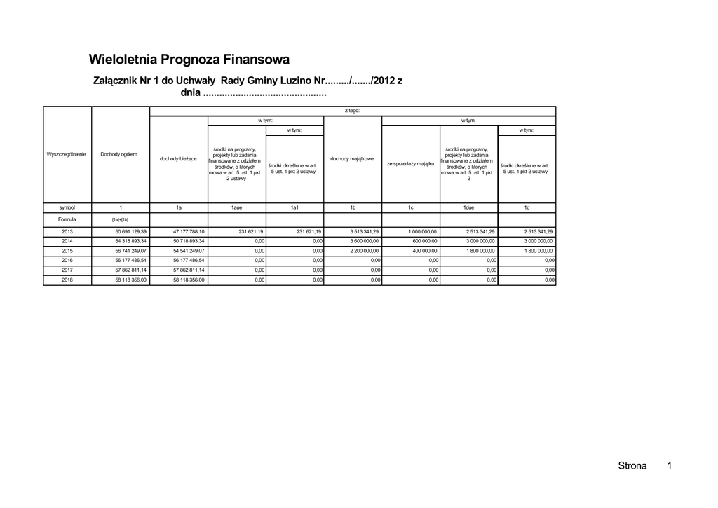 Wieloletnia Prognoza Finansowa Załącznik Nr 1 do Uchwały Rady Gminy Luzino Nr........./......./2012 z dnia .............................................. w tym: Wyszczególnienie Dochody ogółem symbol 1 Formuła [1a]+[1b] dochody bieżące 1a środki na programy, projekty lub zadania finansowane z udziałem środków, o których mowa w art. 5 ust. 1 pkt 2 ustawy 1aue z tego: w tym: w tym: środki określone w art. 5 ust. 1 pkt 2 ustawy 1a1 dochody majątkowe ze sprzedaży majątku 1b 1c w tym: środki na programy, projekty lub zadania finansowane z udziałem środków, o których mowa w art. 5 ust. 1 pkt 2 1due środki określone w art. 5 ust. 1 pkt 2 ustawy 1d 2013 50 691 129,39 47 177 788,10 231 621,19 231 621,19 3 513 341,29 1 000 000,00 2 513 341,29 2 513 341,29 2015 56 741 249,07 54 541 249,07 0,00 0,00 2 200 000,00 400 000,00 1 800 000,00 1 800 000,00 2014 2016 2017 2018 54 318 893,34 56 177 486,54 57 862 811,14 58 118 356,00 50 718 893,34 56 177 486,54 57 862 811,14 58 118 356,00 0,00 0,00 0,00 0,00 0,00 0,00 0,00 0,00 3 600 000,00 0,00 0,00 0,00 600 000,00 0,00 0,00 0,00 3 000 000,00 0,00 0,00 0,00 3 000 000,00 0,00 0,00 0,00 Strona 1 Wyszczególnienie Wydatki ogółem Wydatki bieżące razem symbol 27 24 Formuła [10]+[24] [2]+[7b] Wydatki bieżące (bez odsetek i prowizji od: kredytów i pożyczek oraz wyemitowanych papierów wartościowych) 2 w tym: w tym: gwarancje i poręczenia podlegające wyłączeniu z limitów spłaty zobowiązań z art. 243 ufp/169sufp z tytułu gwarancji i poręczeń 2c 2d z tego: z tego: na pokrycie ujemnego wyniku finansowego samodzielnego publicznego zakładu opieki zdrowotnej 2g w tym: na projekty realizowane przy udziale środków, o których mowa w art. 5 ust. 1 pkt 2 2f w tym: w tym: finansowane środkami określonymi w art. 5 ust. 1 pkt 2 ustawy 2f1 wydatki bieżące na obsługę długu odsetki i dyskonto 7b 7b1 Wydatki majątkowe 10 na projekty realizowane przy udziale środków, o których mowa w art. 5 ust. 1 pkt 2 10b 49 326 041,39 44 521 620,56 43 663 120,56 0,00 0,00 0,00 238 770,06 238 770,06 858 500,00 858 500,00 4 804 420,83 3 074 510,83 2015 52 829 095,07 45 181 474,50 44 680 685,50 0,00 0,00 0,00 0,00 0,00 500 789,00 500 789,00 7 647 620,57 2 500 000,00 2016 2017 2018 51 453 800,34 51 791 461,54 54 493 601,14 57 618 356,00 44 218 053,85 45 998 010,77 47 147 801,81 48 902 364,15 43 653 177,85 45 637 214,77 47 006 331,81 48 885 056,15 0,00 0,00 0,00 0,00 0,00 0,00 0,00 0,00 0,00 0,00 0,00 0,00 0,00 0,00 0,00 0,00 0,00 0,00 0,00 0,00 564 876,00 360 796,00 141 470,00 17 308,00 564 876,00 360 796,00 141 470,00 17 308,00 7 235 746,49 5 793 450,77 7 345 799,33 8 715 991,85 finansowane środkami określonymi w art. 5 ust. 1 pkt 2 ustawy 10b1 2013 2014 w tym: 5 330 400,00 1 234 580,86 0,00 0,00 2 500 000,00 0,00 0,00 0,00 0,00 Strona 0,00 2 w tym: Wyszczególnienie Wynik budżetu Dochody bieżące wydatki bieżące Przychody budżetu symbol 28 25 29 Formuła [1]-[27] [1a]-[24] [4.1]+[4.2]+[5]+[11] 2013 1 365 088,00 2 656 167,54 2015 3 912 154,00 9 359 774,57 2014 2016 2017 2018 2 865 093,00 6 500 839,49 4 386 025,00 10 179 475,77 500 000,00 9 215 991,85 3 369 210,00 10 715 009,33 Nadwyżka budżetowa z lat ubiegłych angażowana w budżecie roku bieżącego 4.1 1 500 000,00 0,00 0,00 0,00 0,00 0,00 w tym: na pokrycie deficytu budżetu 4.1a Wolne środki, o których mowa w art. 217 ust. 2 pkt 6 ufp, angażowane w budżecie roku bieżącego 4.2 z tego: na pokrycie deficytu budżetu 0,00 0,00 0,00 0,00 0,00 0,00 0,00 0,00 0,00 0,00 0,00 0,00 0,00 0,00 0,00 0,00 0,00 0,00 Kredyty, pożyczki, sprzedaż papierów wartościowych 0,00 0,00 0,00 0,00 w tym: na pokrycie deficytu budżetu 11a 11 4.2a 0,00 0,00 w tym: 1 500 000,00 0,00 0,00 0,00 0,00 0,00 Inne przychody nie związane z zaciągnięciem długu na pokrycie deficytu budżetu 5a 5 0,00 0,00 0,00 0,00 0,00 0,00 0,00 0,00 0,00 0,00 0,00 0,00 0,00 0,00 0,00 0,00 0,00 0,00 Strona 3 z tego: w tym: w tym: Wyszczególnienie Rozchody budżetu symbol 30 Formuła [7a]+[8] Rozchody z tytułu spłaty rat kapitałowych oraz wykupu papierów wartościowych 7a kwota wyłączeń z art. 243 ust. 3 pkt 1 ufp oraz art. 169 ust. 3 sufp przypadająca na dany rok budżetowy 7a1 Inne rozchody (bez spłaty długu np. udzielane pożyczki) Kwota długu 8 13 wskaźniki z art. 169/170 sufp dług spłacany wydatkami (zobowiązania wymagalne, umowy zaliczane do kategorii kredytów i pożyczek, itp.) 13a Łączna kwota wyłączeń z art. 170 ust. 3 sufp 14 Zadłużenie/dochod y ogółem - max 60% z art. 170 sufp (bez wyłączeń) Zadłużenie/dochod y ogółem - max 60% z art. 170 sufp (po uwzględnieniu wyłączeń) Planowana łączna kwota spłaty zobowiązań/dochod y ogółem - max 15% z art. 169 sufp (bez wyłączeń) 18 18a 19 ([13])/[1] ([13]-[14])/[1] ([7a]+[7b1]+[2c])/[1] 19a 2013 2 865 088,00 2 865 088,00 0,00 0,00 15 032 482,00 0,00 0,00 29,66% 29,66% 7,35% 2015 3 912 154,00 3 912 154,00 0,00 0,00 8 255 235,00 0,00 0,00 14,55% 14,55% 7,78% 2014 2016 2017 2018 2 865 093,00 4 386 025,00 3 369 210,00 500 000,00 2 865 093,00 4 386 025,00 3 369 210,00 500 000,00 0,00 0,00 0,00 0,00 0,00 0,00 0,00 12 167 389,00 3 869 210,00 0,00 500 000,00 0,00 0,00 0,00 0,00 0,00 0,00 0,00 0,00 0,00 22,40% 6,89% 0,86% 0,00% 22,40% 6,89% 0,86% 0,00% Planowana łączna kwota spłaty zobowiązań/dochod y ogółem - max 15% z art. 169 sufp (po uwzględnieniu wyłączeń) 6,31% 8,45% 6,07% 0,89% ([7a]+[7b1]+[2c]-[2d][7a1])/[1] Kwota zobowiązań związku współtworzonego przez jst przypadających do spłaty w danym roku budżetowym podlegająca doliczeniu zgodnie z art. 244 ufp 15 7,35% 0,00 7,78% 0,00 6,31% 8,45% 6,07% 0,89% 0,00 0,00 0,00 0,00 ** Przeznaczenie planowanej nadwyżki budżetowej jest szczegółowo opisane w objaśnieniach. Strona 4 wskaźniki z art. 243 ufp Wyszczególnienie Relacja (DbWb+Dsm)/Do, o której mowa w art. 243 w danym roku symbol 20 Formuła ([1a]-[24]+[1c])/[1] 2013 Maksymalny dopuszczalny wskaźnik sp