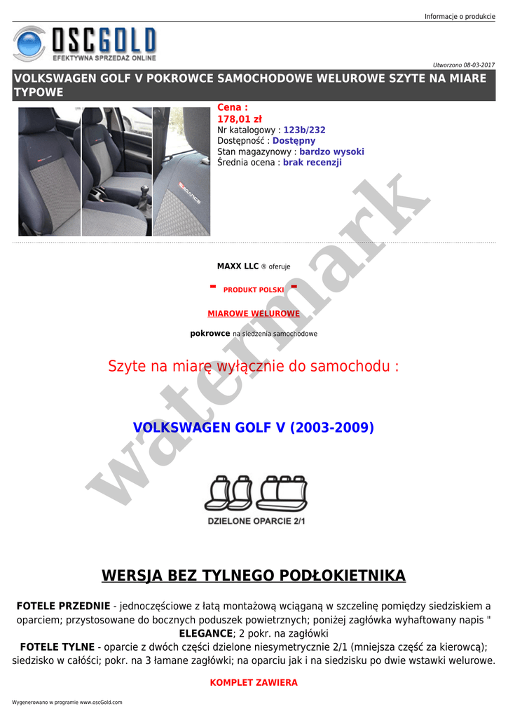 Informacje o produkcie Utworzono 08-03-2017 VOLKSWAGEN GOLF V POKROWCE SAMOCHODOWE WELUROWE SZYTE NA MIARE TYPOWE Cena : 178,01 zł er m ar k Nr katalogowy : 123b/232 Dostępność : Dostępny Stan magazynowy : bardzo wysoki Średnia ocena : brak recenzji MAXX LLC ® oferuje - PRODUKT POLSKI - MIAROWE WELUROWE pokrowce na siedzenia samochodowe at Szyte na miarę wyłącznie do samochodu : w VOLKSWAGEN GOLF V (2003-2009) WERSJA BEZ TYLNEGO PODŁOKIETNIKA FOTELE PRZEDNIE - jednoczęściowe z łatą montażową wciąganą w szczelinę pomiędzy siedziskiem a oparciem; przystosowane do bocznych poduszek powietrznych; poniżej zagłówka wyhaftowany napis " ELEGANCE; 2 pokr. na zagłówki FOTELE TYLNE - oparcie z dwóch części dzielone niesymetrycznie 2/1 (mniejsza część za kierowcą); siedzisko w całóści; pokr. na 3 łamane zagłówki; na oparciu jak i na siedzisku po dwie wstawki welurowe. KOMPLET ZAWIERA Wygenerowano w programie www.oscGold.com ● ● ● ● ● ● 2 pokrowce na przednie fotele 2 pokrowce na oparcie tylne 1 pokrowiec na siedzisko tylne 5 pokrowców na zagłówki haczyki oraz inne elementy montażowe instrukcję montażu WERSJA Z TYLNYM PODŁOKIETNIKIEM er m ar k FOTELE PRZEDNIE- pokrowce przystosowane do bocznych poduszek powietrznych (AIRBAG TYPE), jednoczęściowe z łatą montażową wciąganą w szczelinę między siedzisko a oparcie; na plecach obu oparć poziome przecięcie z wstawionym zamkiem aby umożliwić dostęp do kieszeni; 2 pokrowce na zagłówki i 1 na przedni podłokietnik. FOTELE TYLNE- oparcie dzielone niesymetrycznie 2/3 na 1/3 na środku otwierany podłokietnik z osobnym pokrowcem, mniejsza część za kierowcą, u góry otwory na zagłówki, do składania foteli i na pas środkowy; pokrowce na 2 kolumny obrzeży oparcia; siedzisko w całości; 3 pokrowce na łamane zagłówki. KOMPLET ZAWIERA ● ● ● ● ● at ● 2 pokrowce na przednie fotele 2 pokrowce na oparcie tylne 1 pokrowiec na siedzisko tylne 1 pokrowiec na tylny podłokietnik 5 pokrowców na zagłówki haczyki oraz inne elementy montażowe instrukcję montażu Pokrowce oferowane przez nas posiadają atest bezpieczeństwa na poduszki powietrzne AIRBAG Przemysłowego Instytutu Motoryzacji (PIMOT) w Warszawie. Posiadają one specjalne szycie po stronie poduszki powietrznej, oznaczone wszywką z napisem "airbag", dzięki czemu poduszki bez najmniejszego problemu będą mogły wystrzelić gdy zajdzie taka potrzeba. Dzięki czemu przystosowane są do samochodów zarówno z bocznymi poduszkami powietrznymi w fotelach, jak i do standardowych siedzeń. w ● w at er m ar k Informacje o produkcie Pokrowce wykonane są z wysokiej jakości weluru dodatkowo laminowanego pianką poliuretanową oraz podszewką co zapobiega wykruszaniu się gąbki i ułatwia zakładanie Boczki foteli, zagłówki oraz plecy wykonane są z grubej dzianiny poliestrowej Wygenerowano w programie www.oscGold.com koloru ciemno grafitowego, w całości laminowanej pianką, w at er m ar k w miejscach szczególnie podatnych na przetarcia dodatkowo wzmocnione podszewką. w at er m ar k Informacje o produkcie Wygenerowano w programie www.oscGold.com er m ar k Pokrowce są bardzo solidnie wykończone, otwory do regulacji foteli, lub pod zagłówki i pasy bezpieczeństwa są wycięte, obszyte i dopasowane pod każdy model indywidualnie. at Po dokładnym montażu naszych pokrowców uzyskujemy efekt praktycznie nie odróżniający się od orginalnej tapicerki co zresztą widać na powyższych zdjęciach. w W trzech wzorach: w at er m ar k Informacje o produkcie Wygenerowano w programie www.oscGold.com er m ar k at w w at er m ar k Informacje o produkcie Wygenerowano w programie www.oscGold.com