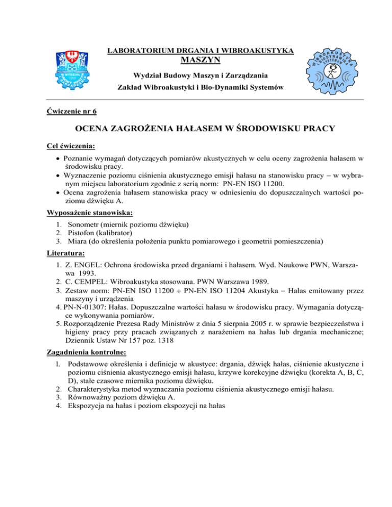 LABORATORIUM DRGANIA I WIBROAKUSTYKA MASZYN Wydział Budowy Maszyn i Zarządzania Zakład Wibroakustyki i Bio-Dynamiki Systemów Ćwiczenie nr 6 OCENA ZAGROŻENIA HAŁASEM W ŚRODOWISKU PRACY Cel ćwiczenia: • Poznanie wymagań dotyczących pomiarów akustycznych w celu oceny zagrożenia hałasem w środowisku pracy. • Wyznaczenie poziomu ciśnienia akustycznego emisji hałasu na stanowisku pracy − w wybranym miejscu laboratorium zgodnie z serią norm: PN-EN ISO 11200. • Ocena zagrożenia hałasem stanowiska pracy w odniesieniu do dopuszczalnych wartości poziomu dźwięku A. Wyposażenie stanowiska: 1. Sonometr (miernik poziomu dźwięku) 2. Pistofon (kalibrator) 3. Miara (do określenia położenia punktu pomiarowego i geometrii pomieszczenia) Literatura: 1. Z. ENGEL: Ochrona środowiska przed drganiami i hałasem. Wyd. Naukowe PWN, Warszawa 1993. 2. C. CEMPEL: Wibroakustyka stosowana. PWN Warszawa 1989. 3. Zestaw norm: PN-EN ISO 11200 ÷ PN-EN ISO 11204 Akustyka − Hałas emitowany przez maszyny i urządzenia 4. PN-N-01307: Hałas. Dopuszczalne wartości hałasu w środowisku pracy. Wymagania dotyczące wykonywania pomiarów. 5. Rozporządzenie Prezesa Rady Ministrów z dnia 5 sierpnia 2005 r. w sprawie bezpieczeństwa i higieny pracy przy pracach związanych z narażeniem na hałas lub drgania mechaniczne; Dziennik Ustaw Nr 157 poz. 1318 Zagadnienia kontrolne: l. Podstawowe określenia i definicje w akustyce: drgania, dźwięk hałas, ciśnienie akustyczne i poziomu ciśnienia akustycznego emisji hałasu, krzywe korekcyjne dźwięku (korekta A, B, C, D), stałe czasowe miernika poziomu dźwięku. 2. Charakterystyka metod wyznaczania poziomu ciśnienia akustycznego emisji hałasu. 3. Równoważny poziom dźwięku A. 4. Ekspozycja na hałas i poziom ekspozycji na hałas