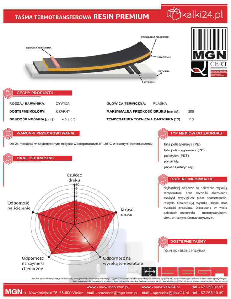 TAŚMA TERMOTRANSFEROWA RESIN PREMIUM PODKŁAD Z POLIESTRU GŁOWICA TERMICZNA BARWNIK CERT POLSKA AKADEMIA JAKOŚCI ETYKIETA PN-EN ISO 9001:2009 Certyfikat nr: 1603/12/2014/J/C WYDRUK CECHY PRODUKTU RODZAJ BARWNIKA: ŻYWICA GŁOWICA TERMICZNA: DOSTĘPNE KOLORY: CZARNY MAKSYMALNA PRĘDKOŚĆ DRUKU [mm/s]: 300 TEMPERATURA TOPNIENIA BARWNIKA [°C]: 110 GRUBOŚĆ NOŚNIKA [μm]: 4.6 ± 0.3 PŁASKA WARUNKI PRZECHOWYWANIA TYP MEDIÓW DO ZADRUKU Do 24 miesięcy w zaciemnionym miejscu w temperaturze 5°- 35°C w suchym pomieszczeniu. folia polietylenowa (PE), folia polipropylenowa (PP), polietylen (PET), DANE TECHNICZNE poliamidy, papier syntetyczny, Czułość druku 10 9 8 7 6 5 4 3 2 1 Odporność na ścieranie OGÓLNE INFORMACJE Najbardziej odporne na ścieranie, wysoką temperaturę oraz czynniki chemiczne spośród wszystkich taśm termotransferowych. Gwarantują wysoką jakość oraz trwałość produktu. Stosowane w wielu Jakość druku gałęziach przemysłu – motoryzacyjnym, elektronicznym, farmaceutycznym. DOSTĘPNE TAŚMY RESIN HQ / RESINE PREMIUM Odporność na czynniki chemiczne Odporność na wysoką temperature ISEGA to niezależny instytut badawczy, który prowadzi analizy i konsultacje, wystawia raporty z badań dotyczących nadania się produktu do pośredniego kontaktu z artykułami spożywczymi. Jest to gwarancja, że miejsca z którymi żywność może mieć kontakt nie zostaną skażone metalami ciężkimi i innymi zanieczyszczeniami chemicznymi MGN ul. Nowomiejska 78, 78-600 Wałcz www - www.mgn.com.pl www - www.kalki24.pl tel - 67 258 02 97 mail - [email protected] mail - [email protected] tel - 67 258 10 89
