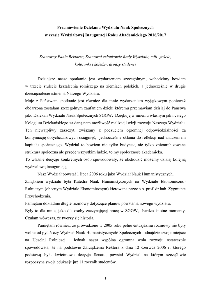 Przemówienie Dziekana Wydziału Nauk Społecznych w czasie Wydziałowej Inauguracji Roku Akademickiego 2016/2017 Szanowny Panie Rektorze, Szanowni członkowie Rady Wydziału, mili goście, koleżanki i koledzy, drodzy studenci Dzisiejsze nasze spotkanie jest wydarzeniem szczególnym, wchodzimy bowiem w trzecie stulecie kształcenia rolniczego na ziemiach polskich, a jednocześnie w drugie dziesięciolecie istnienia Naszego Wydziału. Moje z Państwem spotkanie jest również dla mnie wydarzeniem wyjątkowym ponieważ obdarzona zostałam szczególnym zaufaniem dzięki któremu przemawiam dzisiaj do Państwa jako Dziekan Wydziału Nauk Społecznych SGGW. Dziękuję w imieniu własnym jak i całego Kolegium Dziekańskiego za daną nam możliwość realizacji wizji rozwoju Naszego Wydziału. Ten niewątpliwy zaszczyt, związany z poczuciem ogromnej odpowiedzialności za kontynuację dotychczasowych osiągnięć, jednocześnie skłania do refleksji nad znaczeniem kapitału społecznego. Wydział to bowiem nie tylko budynek, nie tylko zhierarchizowana struktura społeczna ale przede wszystkim ludzie, to my społeczność akademicka. To właśnie decyzje konkretnych osób spowodowały, że obchodzić możemy dzisiaj kolejną wydziałową inaugurację. Nasz Wydział powstał 1 lipca 2006 roku jako Wydział Nauk Humanistycznych. Zalążkiem wydziału była Katedra Nauk Humanistycznych na Wydziale EkonomicznoRolniczym (obecnym Wydziale Ekonomicznym) kierowana przez ś.p. prof. dr hab. Zygmunta Przychodzenia. Pamiętam dokładnie długie rozmowy dotyczące planów powstania nowego wydziału. Były to dla mnie, jako dla osoby zaczynającej pracę w SGGW, bardzo istotne momenty. Czułam wówczas, że tworzy się historia. Pamiętam również, że prowadzone w 2005 roku pełne entuzjazmu rozmowy nie były wolne od pytań czy Wydział Nauk Humanistycznych/ Społecznych odnajdzie swoje miejsce na Uczelni Rolniczej. Jednak nasza wspólna ogromna wola rozwoju ostatecznie spowodowała, że na podstawie Zarządzenia Rektora z dnia 12 czerwca 2006 r, którego podstawą była kwietniowa decyzja Senatu, powstał Wydział na którym szczęśliwie rozpoczyna swoją edukację już 11 rocznik studentów. 1 Celem Wydziału Nauk Społecznych jest edukacja Naszych Studentów według najwyższych standardów akademickich oraz rozwój naukowy Naszych Pracowników . Kształcimy studentów na dwóch kierunkach: Pedagogice i Socjologii na studiach I i II stopnia w systemie stacjonarnym i niestacjonarnym. W ostatnich dwóch latach obydwa kierunki studiów uzyskały pozytywną ocenę Państwowej Komisji Akredytacyjnej, co silnie ugruntowuje naszą pozycję w środowisku akademickim. Prowadzimy również, mające już swoja tradycję, Studia Podyplomowe dla Nauczycieli. Jesteśmy wydziałem otwartym na współpracę z gospodarką , o czym świadczą liczne umowy partnerskie z wieloma firmami i instytucjami. Studenci Naszego Wydziału mogą rozwijać swoje pasje w 5 Kołach Naukowych oraz uczestniczyć w otwartych spotkaniach o charakterze kulturalnym i naukowym takich jak organizowane od wielu lat przez Katedrę Edukacji i Kultury spotkania z cyklu „ Bliscy znani i … nieznani” oraz zainaugurowany przez Katedrę Socjologii w ubiegłym roku „Salon Socjologiczny”, który został już doceniony przez Ministerstwo Nauki i Szkolnictwa Wyższego dofinansowaniem w ramach Działalności Upowszechniającej Naukę. Kształcimy Naszych Studentów zgodnie z ideą nowożytnego uniwersytetu w którą wpisana jest również jego wychowawcza funkcja. Zgodnie z nią uniwersytet ma nie tylko przekazywać wiedzą ale również kształtować charakter i uczyć twórczego i krytycznego myślenia. Aby tak się stało zatrudniamy specjalistów z wielu dziedzin: socjologów, pedagogów , filozofów, psychologów i politologów. Nasi Pracownicy to bardzo dynamicznie rozwijająca się kadra, o czym świadczy szereg zakończonych w ostatnich latach procedur habilitacyjnych i promowanie prac doktorskich przez samodzielnych pracowników naukowych Naszego Wydziału. Immanuel Kant polecał : „Miej odwagę posługiwać się swym własnym rozumem”. Pragniemy abyście Państwo, Nasi Studenci posiedli tę cenną umiejętność ponieważ wolny człowiek, to taki człowiek, który żyjąc wśród innych ludzi przez których jest kształtowany, nie pozwala jednocześnie nikomu myśleć za siebie. Tak pojmowana wolność pozwala na kształtowanie prawidłowych i twórczych relacji z innymi ludźmi i jednocześnie otwiera wiele możliwości własnego wzrostu. Okres studiów to zatem czas inwestowania we własny rozwój, a sposób w jaki będziecie Państwo realizowali tę inwestycję istotnie wpłynie na Wasze wyposażenie na dalsze życie, również życie zawodowe . Uzasadnieniem faktu, że Nasi Studenci rozumieją znaczenie powyższych słów niech będą dane Biura Karier i Monitorowania Losów Absolwentów, według których znaczny odsetek 2 absolwentów Wydziału Nauk Społecznych, którzy ukończyli studia w latach 2010-2014 dobrze radzi sobie na rynku pracy Studia to jednak również okres zawiązywania nowych znajomości, przyjaźni, często związków na całe życie. Nasz piękny Kampus z pewnością sprzyja życiu studenckiemu. Do Państwa dyspozycji pozostają liczne domy akademickie, dobrze wyposażona biblioteka, czy liczne obiekty sportowe. Studenci mogą realizować swoje pasje w zespołach artystycznych działających na terenie SGGW i włączać się aktywnie w działalność samorządową Zachęcamy więc Państwa do pełnego uczestnictwa we wszystkich aktywnościach, które oferuje Wam Nasza Uczelnia. Dziękując kolegium dziekańskiemu ubiegłej kadencji, kierownikom Katedr i Zakładów, pracownikom administracyjnym oraz wszystkim moim Koleżankom i Kolegom, odwołać pragnę się na zakończenie do wykładu inauguracyjnego, który miałam zaszczyt wygłaszać w ubiegłym roku akademickim i przytoczyć słowa pierwszego powojenn