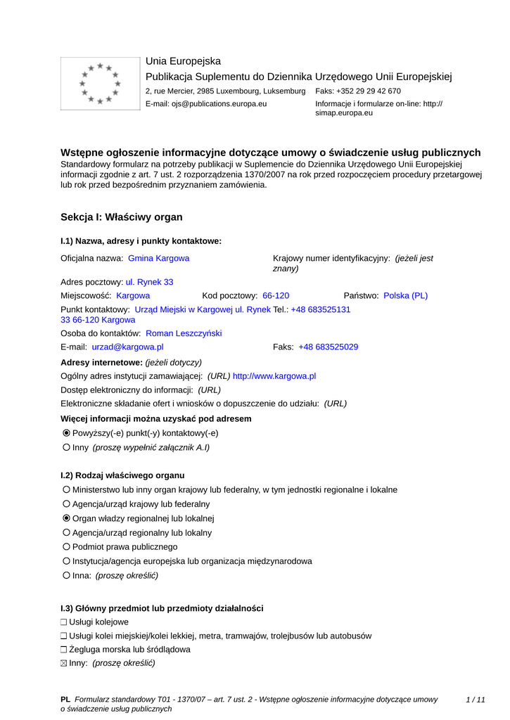 Unia Europejska Publikacja Suplementu do Dziennika Urzędowego Unii Europejskiej 2, rue Mercier, 2985 Luxembourg, Luksemburg Faks: +352 29 29 42 670 E-mail: [email protected] Informacje i formularze on-line: http:// simap.europa.eu Wstępne ogłoszenie informacyjne dotyczące umowy o świadczenie usług publicznych Standardowy formularz na potrzeby publikacji w Suplemencie do Dziennika Urzędowego Unii Europejskiej informacji zgodnie z art. 7 ust. 2 rozporządzenia 1370/2007 na rok przed rozpoczęciem procedury przetargowej lub rok przed bezpośrednim przyznaniem zamówienia. Sekcja I: Właściwy organ I.1) Nazwa, adresy i punkty kontaktowe: Krajowy numer identyfikacyjny: (jeżeli jest znany) _____ Oficjalna nazwa: Gmina Kargowa Adres pocztowy: ul. Rynek 33 Miejscowość: Kargowa Kod pocztowy: 66-120 Państwo: Polska (PL) Punkt kontaktowy: Urząd Miejski w Kargowej ul. Rynek Tel.: +48 683525131 33 66-120 Kargowa Osoba do kontaktów: Roman Leszczyński E-mail: [email protected] Faks: +48 683525029 Adresy internetowe: (jeżeli dotyczy) Ogólny adres instytucji zamawiającej: (URL) http://www.kargowa.pl Dostęp elektroniczny do informacji: (URL) _____ Elektroniczne składanie ofert i wniosków o dopuszczenie do udziału: (URL) _____ Więcej informacji można uzyskać pod adresem Powyższy(-e) punkt(-y) kontaktowy(-e) Inny (proszę wypełnić załącznik A.I) I.2) Rodzaj właściwego organu Ministerstwo lub inny organ krajowy lub federalny, w tym jednostki regionalne i lokalne Agencja/urząd krajowy lub federalny Organ władzy regionalnej lub lokalnej Agencja/urząd regionalny lub lokalny Podmiot prawa publicznego Instytucja/agencja europejska lub organizacja międzynarodowa Inna: (proszę określić) I.3) Główny przedmiot lub przedmioty działalności Usługi kolejowe Usługi kolei miejskiej/kolei lekkiej, metra, tramwajów, trolejbusów lub autobusów Żegluga morska lub śródlądowa Inny: (proszę określić) PL Formularz standardowy T01 - 1370/07 – art. 7 ust. 2 - Wstępne ogłoszenie informacyjne dotyczące umowy o świadczenie usług publicznych 1 / 11 ogólne usługi publiczne I.4) Udzielenie zamówienia w imieniu innych właściwych organów Właściwy organ dokonuje zakupu w imieniu innych właściwych organów: tak nie (jeżeli tak, więcej informacji o tych właściwych organach można podać w załączniku A.II) PL Formularz standardowy T01 - 1370/07 – art. 7 ust. 2 - Wstępne ogłoszenie informacyjne dotyczące umowy o świadczenie usług publicznych 2 / 11 Sekcja II: Przedmiot zamówienia II.1) Opis: II.1.1) Nazwa nadana zamówieniu: Świadczenie usług w zakresie publicznego transportu zbiorowego na terenie gminy Kargowa II.1.2) Rodzaj zamówienia, dziedzina(-y), której(-ych) dotyczą usługi transportu publicznego: Kategoria usług: nr: T-05 (Zob. kategorie usług w załączniku B) Dziedziny, których dotyczą usługi transportu publicznego: Transport drogowy Kod NUTS: PL432 II.1.3) Krótki opis zamówienia: Świadczenie usług w zakresie publicznego transportu zbiorowego na terenie gminy Kargowa. Zamówienie obejmuje wykonanie regularnego przewozu osób na liniach autobusowych łączących ze sobą miejscowości gminy Kargowa, względnie również na liniach autobusowych łączących miejscowości gminy Kargowa z miejscowościami gmin sąsiednich. II.1.4) Wspólny Słownik Zamówień (CPV) Główny przedmiot Słownik główny 60112000 Słownik uzupełniający (jeżeli dotyczy) II.1.5) Informacje na temat podwykonawstwa Przewidywane jest zlecenie podwykonawstwa: tak nie (jeżeli tak) Wartość lub część zamówienia, które prawdopodobnie będzie zlecone stronom trzecim: minimalny procent: _____ (%), maksymalny procent: _____ (%) wartości zamówienia albo Nieznana Krótki opis wartości/części zamówienia, które będzie zlecone podwykonawcom: _____ II.2) Ilość i/lub wartość usług Opis: _____ km usług publicznych w zakresie transportu pasażerskiego: _____ Szacunkowy koszt bez VAT: (proszę podać wyłącznie dane liczbowe) _____ albo Zakres: między _____ i _____ Waluta: Waluta: II.3) Planowana data rozpoczęcia i czas trwania zamówienia lub termin realizacji Rozpoczęcie: 01/01/2017 (dd/mm/rrrr) Okres w miesiącach: 12 albo w dniach: _____ (od udzielenia zamówienia) PL Formularz standardowy T01 - 1370/07 – art. 7 ust. 2 - Wstępne ogłoszenie informacyjne dotyczące umowy o świadczenie usług publicznych 3 / 11 Sekcja III: Informacje o charakterze prawnym, ekonomicznym, finansowym i technicznym III.1) Warunki dotyczące zamówienia: III.1.1) Parametry kosztów w celu obliczenia rekompensaty: _____ III.1.2) Informacje o wyłącznych prawach: Przyznano wyłączne prawa tak nie (jeżeli tak) Wyszczególnienie przyznanych wyłącznych praw: _____ III.1.3) Podział przychodów ze sprzedaży biletów: Odsetek przydzielony podmiotowi świadczącemu usługi publiczne: _____ (%) (uznaje się, że pozostała część jest przyznawana właściwemu organowi) III.1.4) Standardy socjalne: (przejęcie personelu zgodnie z dyrektywą 2001/23/WE) Wykaz wymaganych standardów (w tym lista pracowników, których to dotyczy, szczegółowe informacje na temat umownych praw i zobowiązań pracowników oraz warunków, na jakich pracowników uznaje się za związanych ze świadczonymi usługami): _____ III.1.5) Zobowiązania do świadczenia usług publicznych: Wyszczególnienie: _____ III.1.6) Inne szczególne warunki: Wykonanie zamówienia podlega szczególnym warunkom (jeżeli tak) Opis szczególnych warunków: _____ tak nie III.2) Warunki udziału: III.2.1) Zdolność ekonomiczna i finansowa: Informacje i formalności konieczne do dokonania oceny Minimalny poziom ewentualnie wymaganych spełniania wymogów: standardów: _____ _____ III.2.2) Wymagania techniczne: Informacje i formalności konieczne do dokonania oceny Minimalny poziom ewentualnie wymaganych spełniania wymogów: standardów: _____ _____ III.3) Cele w zakresie jakości dla umów o usługi: Opis: _____ Inform