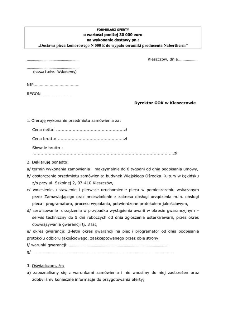 FORMULARZ OFERTY o wartości poniżej 30 000 euro na wykonanie dostawy pn.: „Dostawa pieca komorowego N 500 E do wypału ceramiki producenta Nabertherm” Kleszczów, dnia………………… .................................................. .................................................. (nazwa i adres Wykonawcy) NIP..................................... REGON …………………………… Dyrektor GOK w Kleszczowie 1. Oferuję wykonanie przedmiotu zamówienia za: Cena netto: .................................................zł Cena brutto: ................................................zł Słownie brutto : .......................................................................................................zł 2. Deklaruję ponadto: a/ termin wykonania zamówienia: maksymalnie do 6 tygodni od dnia podpisania umowy, b/ dostarczenie przedmiotu zamówienia: budynek Wiejskiego Ośrodka Kultury w Łękińsku z/s przy ul. Szkolnej 2, 97-410 Kleszczów, c/ wniesienie, ustawienie i pierwsze uruchomienie pieca w pomieszczeniu wskazanym przez Zamawiającego oraz przeszkolenie z zakresu obsługi urządzenia m.in. obsługi pieca i programatora, procesu wypalania, potwierdzone protokołem jakościowym, d/ serwisowanie urządzenia w przypadku wystąpienia awarii w okresie gwarancyjnym – serwis techniczny do 5 dni roboczych od dnia zgłoszenia usterki/awarii, przez okres obowiązywania gwarancji tj. 3 lat, e/ okres gwarancji: 3-letni okres gwarancji na piec i programator od dnia podpisania protokołu odbioru jakościowego, zaakceptowanego przez obie strony, f/ warunki gwarancji: …………………………………………………………………………………… g/ ……………………………………………………………………………………………………………………… 3. Oświadczam, że: a) zapoznaliśmy się z warunkami zamówienia i nie wnosimy do niej zastrzeżeń oraz zdobyliśmy konieczne informacje do przygotowania oferty; b) zaoferowana cena obejmuje wszystkie czynności, w tym również koszty serwisowania urządzenia w przypadku wystąpienia awarii w okresie gwarancyjnym; c) w razie wybrania naszej oferty zobowiązujemy się do realizacji przedmiotu zamówienia w terminie wskazanym przez zamawiającego, zgodnie ze zobowiązaniami określonymi w punkcie 2 niniejszego formularza oraz postanowieniami zawartymi w projekcie umowy i opisie przedmiotu zamówienia /dokumentacja techniczna/ załącznik nr 1 stanowiącym integralną część umowy. 4. Załącznikami do niniejszego formularza stanowiącymi integralną część oferty są: 1/ Dokumentacja techniczna „Opis przedmiotu zamówienia” 2/ Formularz oferty ……………………dn. .......................... .................................................. (podpis Wykonawcy)