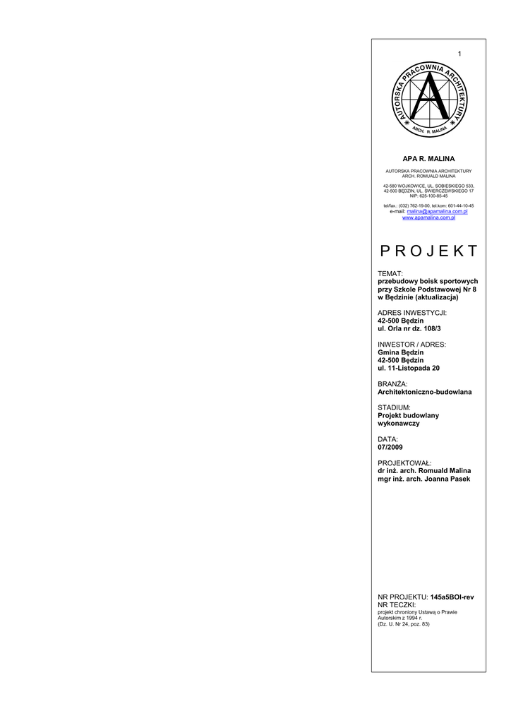1 APA R. MALINA AUTORSKA PRACOWNIA ARCHITEKTURY ARCH. ROMUALD MALINA 42-580 WOJKOWICE, UL. SOBIESKIEGO 533, 42-500 BĘDZIN, UL. ŚWIERCZEWSKIEGO 17 NIP: 625-100-85-45 tel/fax.: (032) 762-19-00, tel.kom: 601-44-10-45 e-mail: [email protected] www.apamalina.com.pl PROJEKT TEMAT: przebudowy boisk sportowych przy Szkole Podstawowej Nr 8 w Będzinie (aktualizacja) ADRES INWESTYCJI: 42-500 Będzin ul. Orla nr dz. 108/3 INWESTOR / ADRES: Gmina Będzin 42-500 Będzin ul. 11-Listopada 20 BRANŻA: Architektoniczno-budowlana STADIUM: Projekt budowlany wykonawczy DATA: 07/2009 PROJEKTOWAŁ: dr inż. arch. Romuald Malina mgr inż. arch. Joanna Pasek NR PROJEKTU: 145a5BOI-rev NR TECZKI: projekt chroniony Ustawą o Prawie Autorskim z 1994 r. (Dz. U. Nr 24, poz. 83) OPIS TECHNICZNY DO PROJEKTU: przebudowy boisk sportowych przy Szkole Podstawowej Nr 8 w Będzinie (aktualizacja) 42-500 Będzin ul. Orla nr dz. 108/3 _________________________________________________________________________________________ AUTORSKA PRACOWNIA ARCHITEKTURY ARCH.R.MALINA, 42-500 BĘDZIN, UL. ŚWIERCZEWSKIEGO 17 . Tel.: (0) 601-44-10-45, (032) 762-19-00 Projekt zawiera: Cztery egzemplarze dokumentacji technicznej oznaczonej kolejnymi numerami na stronach tytułowych: - strona tytułowa, spis zawartości projektu, opis techniczny, mapa do celów projektowych, PZT-1 projekt zagospodarowania terenu 1:500, PZT-2 inwentaryzacja terenu, dokumentacja fotograficzna 1:250, PZT-3 kompozycja planu 1:250, PZT-4 plansza wymiarowa, przekroje terenu 1:250, PZT-5 urządzenia sportowe, siatki zabezpieczające 1:250, PZT/6 Drenaż, PZT/6a Profil podłużny, studnia drenarska, studnia chłonna, odpis uprawnień projektowych - załącznik, odpis przynależności do ŚOIA, projekt oświetlenia boisk branży elektrycznej. A. DANE OGÓLNE Projekt zakłada modernizację istniejącego kompleksu boisk i urządzeń sportowych. Wszystkie projektowane boiska pokryte zostaną nawierzchnią z trawy syntetycznej. Dokumentacja projektowa prawie w całości zachowuje usytuowanie istniejących boisk i urządzeń sportowych bez zmiany ich usytuowania w planie zagospodarowania całego terenu szkoły. Po przeprowadzonych badaniach gruntowo-wodnych, określeniu warstw podbudowy dla istniejących boisk asfaltowych, uzgodniono: wykonanie całkowicie nowych boisk i urządzeń sportowych z pełną podbudową. Dla projektowanych boisk należy wykonać odprowadzenie wody deszczowej do kanalizacji deszczowej ogólnospławnej. Ponieważ teren sportowy nigdy nie posiadał oświetlenia zewnętrznego dokumentacja projektowa zakłada wykonanie słupów z naświetlaczami zewnętrznymi. Projektowane, dodatkowe typowe elementy małej architektury jak ławki, kosze oraz zieleń izolacyjna dopełnią kompleksowej realizacji przedsięwzięcia. Dla prawidłowego przebiegu gier na poszczególnych boiskach sportowych zaprojektowano siatki zabezpieczające dla piłek z siatki polipropylenowej na słupach systemowych aluminiowych do wysokości 5,0 m. Dodatkowo w projekcie założono wykonanie renowacji, rekultywacji nawierzchni trawiastej naturalnej - istniejącego boiska do piłki nożnej. Istniejący teren urządzeń sportowych posiada boisko do piłki nożnej o nawierzchni żużlowej oraz cztery istniejące boiska o nawierzchni asfaltowej. Założono całkowitą likwidację boisk o nawierzchni asfaltowej. Teren z niewielkim nachyleniem podłużnym wymaga niewielkich zmian w ukształtowaniu terenu. W dokumentacji założono wycinkę drzew i karczowanie krzewów, nie uwzględniono wymiany istniejącego ogrodzenia terenu szkoły. B. PROGRAM FUNKCJONALNY Założono realizację następującego programu funkcjonalnego urządzeń sportowych: boisko do piłki ręcznej 20,0 m x 40,0 m /nawierzchnia z trawy syntetycznej zielonej 968,0 m2, boisko do piłki siatkowej, koszykówki 15,0 m x 28,0 m /nawierzchnia z trawy syntetycznej zielonej 608,0 m2, bieżnia na 40 m / nawierzchnia z trawy syntetycznej czerwonej 315 m2, bieżnia do skoku w dal / nawierzchnia z trawy syntetycznej czerwonej 81 m2, 2 OPIS TECHNICZNY DO PROJEKTU: przebudowy boisk sportowych przy Szkole Podstawowej Nr 8 w Będzinie (aktualizacja) 42-500 Będzin ul. Orla nr dz. 108/3 _________________________________________________________________________________________ AUTORSKA PRACOWNIA ARCHITEKTURY ARCH.R.MALINA, 42-500 BĘDZIN, UL. ŚWIERCZEWSKIEGO 17 . Tel.: (0) 601-44-10-45, (032) 762-19-00 C. OPIS DO PROJEKTU ZAGOSPODAROWANIA TERENU DANE MATERIAŁOWO KONSTRUKCYJNE 1. 2. 3. 4. 5. 1. 6. 7. 8. 9. 10. USYTUOWANIE URZĄDZEŃ SPORTOWYCH: wszystkie projektowane boiska i urządzenia sportowe zostały usytuowane wzdłuż osi południowo północnej. Główne boisko do piłki ręcznej 20,0 m x 40,0 m zostało zmodernizowane i zachowuje swoje pierwotne usytuowanie. Bieżnię do skoku w dal usytuowano pomiędzy boiskami do koszykówki i piłki ręcznej. Ponieważ warunki terenowe nie pozwalały na usytuowanie pełno wymiarowej bieżni do biegu na 60 m, uzgodniono wykonanie bieżni do biegu na 40,0 m wzdłuż zachodniej granicy działki. NIWELACJA TERENU I PRACE ZIEMNE: projekt zagospodarowania terenu nie przewiduje znaczących zmian w ukształtowaniu terenu. Przy niwelacji terenu należy zachować nachylenie podłużne w kierunku wschodnim dla wszystkich boisk i urządzeń sportowych 0,5 %. NAWIERZCHNIE Z TRAWY SYNTETYCZNEJ: zastosować jednolitą nawierzchnię z trawy syntetycznej dla wszystkich boisk do siatkówki i koszykówki oraz do piłki ręcznej. Zastosować nawierzchnię o całkowitej wysokości 22,0 mm, gęstość 50 000 splotów/m2, ciężar 2700 gram/m2 z wklejeniem linii wyznaczających obrysy i elementy boisk oraz tory bieżni. Zastosować zasypkę z piasku kwarcowego. Zastosować kolor zielony dla boisk i czerwony dla bieżni i rozbiegu skoczni. PROJEKTOWANE RZĘDNE URZĄDZEŃ SPORTOWYCH: założono rzędną +/- 0,00 dla projektowanych nawierzchni boisk - sztucznej trawy + 288,895 i + 288,628. CHODNIKI: na terenie całego kompl