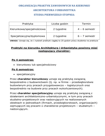 ORGANIZACJA PRAKTYK ZAWODOWYCH NA KIERUNKU ARCHITEKTURA I URBANISTYKA STUDIA PIERWSZEGO STOPNIA: Praktyka Liczba godzin Termin Kierunkowa/specjalnościowa 2 tygodnie 4 – 6 semestr Specjalizacyjna/dyplomowa 2 tygodnie 6 – 7 semestr UWAGA: Uznaje się, że 1 tydzień praktyki ciągłej to 25 godzin pracy studenta na praktyce Praktyki na kierunku Architektura i Urbanistyka powinny mieć następujący charakter: Po 4 semestrze: kierunkowy lub specjalnościowy Po 6 semestrze: specjalizacyjny Przez charakter kierunkowy uznaje się praktykę związaną bezpośrednio z budownictwem (tj. np. w firmie – przedsiębiorstwie budowlanym przy pracach przygotowawczo – logistycznych oraz bezpośrednio na budowie przy pracach wykończeniowych). Przez charakter specjalizacyjny uznaje się praktykę związaną z działaniami architektoniczno-urbanistycznymi, w tym przy pracach studialno-projektowych oraz nadzorujących na realizowanych obiektach w jednostkach (firmach, przedsiębiorstwach, organizacjach) zajmujących się pracami o charakterze projektowym – studialnym – nadzorującym.
