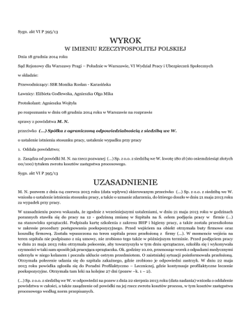 Sygn. akt VI P 395/13 WYROK W IMIENIU RZECZYPOSPOLITEJ POLSKIEJ Dnia 18 grudnia 2014 roku Sąd Rejonowy dla Warszawy Pragi – Południe w Warszawie, VI Wydział Pracy i Ubezpieczeń Społecznych w składzie: Przewodniczący: SSR Monika Rosłan - Karasińska Ławnicy: Elżbieta Godlewska, Agnieszka Olga Mika Protokolant: Agnieszka Wojtyła po rozpoznaniu w dniu 08 grudnia 2014 roku w Warszawie na rozprawie sprawy z powództwa M. N. przeciwko (...) Spółka z ograniczoną odpowiedzialnością z siedzibą we W. o ustalenie istnienia stosunku pracy, ustalenie wypadku przy pracy 1. Oddala powództwo; 2. Zasądza od powódki M. N. na rzecz pozwanej (...) Sp. z o.o. z siedzibą we W. kwotę 180 zł (sto osiemdziesiąt złotych 00/100) tytułem zwrotu kosztów zastępstwa procesowego. Sygn. akt VI P 395/13 UZASADNIENIE M. N. pozwem z dnia 04 czerwca 2013 roku (data wpływu) skierowanym przeciwko (...) Sp. z o.o. z siedzibą we W. wniosła o ustalenie istnienia stosunku pracy, a także o uznanie zdarzenia, do którego doszło w dniu 21 maja 2013 roku za wypadek przy pracy. W uzasadnieniu pozwu wskazała, że zgodnie z wcześniejszymi ustaleniami, w dniu 21 maja 2013 roku w godzinach porannych stawiła się do pracy na 12 - godzinną zmianę w Szpitalu na S. celem podjęcia pracy w firmie (...) na stanowisku sprzątaczki. Podpisała kartę szkolenia z zakresu BHP i higieny pracy, a także została przeszkolona w zakresie procedury postępowania poekspozycyjnego. Przed wejściem na obiekt otrzymała buty firmowe oraz koszulkę firmową. Została wpuszczona na teren szpitala przez przełożoną z firmy (...). W momencie wejścia na teren szpitala nie podpisano z nią umowy, nie zrobiono tego także w późniejszym terminie. Przed podjęciem pracy w dniu 21 maja 2013 roku otrzymała polecenie, aby towarzyszyła w tym dniu sprzątaczce, szkoliła się i wykonywała czynności w taki sam sposób jak pracująca sprzątaczka. Ok. godziny 10.00, przenosząc worek z odpadami medycznymi uderzyła w niego kolanem i poczuła ukłucie ostrym przedmiotem. O zaistniałej sytuacji poinformowała przełożoną. Otrzymała polecenie udania się do szpitala zakaźnego, gdzie zrobiono je odpowiedni zastrzyk. W dniu 22 maja 2013 roku powódka zgłosiła się do Poradni Profilaktyczno – Leczniczej, gdzie kontynuuje profilaktyczne leczenie poekspozycyjne. Otrzymała tam leki na kolejne 27 dni (pozew –k. 1 – 2). (...) Sp. z o.o. z siedzibą we W. w odpowiedzi na pozew z dnia 22 sierpnia 2013 roku (data nadania) wniosła o oddalenie powództwa w całości, a także zasądzenie od powódki na jej rzecz zwrotu kosztów procesu, w tym kosztów zastępstwa procesowego według norm przepisanych. Uzasadniając swoje stanowisko wskazała, że powództwo jest bezzasadne i nie zasługuje na uwzględnienie. Pozwana zaprzeczyła, aby łączył ją z powódką stosunek pracy. Przyznała, że powódka w dniu 21 maja 2013 roku wykonywała dla pozwanej w ramach umowy zlecenia usługi porządkowo – czystościowe, polegające na doczyszczaniu obiektu na terenie Szpitala na S.. Pozwana była tam podwykonawcą spółki (...) sp. z o.o. Zwarta z powódką umowa zlecenia była umową jednorazową, tj. czynności sprzątające miały być wykonane przez powódkę w dniu 21 maja 2013 roku za ustalone wynagrodzenie 60 zł. Powódka wykonywała czynności w ramach zawartej umowy zlecenia jedynie przez jeden dzień. Nie wykonywała swoich czynności w warunkach opisanych w art. 22 § 1 k.p., brak jest bowiem w tym przypadku podstawowych cech stosunku pracy. Zlecenie nie było wykonywane pod kierownictwem pozwanego, ani w czasie wyznaczonym przez pozwanego, a także brak było istotnego elementu stosunku pracy, jakim jest obowiązek wyłącznie osobistego wykonywania czynności. Pozwany nie kierował, nie organizował i nie pełnił nadzoru nad sposobem wykonania zleconych powódce czynności. Zasada podporządkowania pracownika polega zwłaszcza na obowiązku stosowania się do poleceń przełożonego, które pozostają w związku z wykonywaną pracą, tj. jej organizacją i przebiegiem. Kodeks pracy, normując różne rodzaje stosunków pracy, wszystkie stosunki prawne opiera m.in. na zasadzie podporządkowania pracownika regulaminowi pracy i poleceniom pracodawcy, co w niniejszej sprawie nie ma miejsca. W umowie z powódką chodziło o wykonanie prostych czynności porządkowych. Czynności te nie były wykonywane w określonym z góry przedziale czasowym, lecz w miarę potrzeby. Czas jaki należało poświęcić na wykonanie poszczególnych czynności, zależał wyłącznie od sprawności manualnej powódki i tylko od niej zależało, ile czasu zajmie jej wykonanie danej czynności. Nadto wskazała, że pozwana spółka ma swoją siedzibę we W., zaś na terenie W. nie ma żadnych struktur organizacyjnych. Już choćby ten fakt powoduje, że niemożliwe było jakiekolwiek kierowanie czynnościami powódki i jej podporządkowanie organizacyjne (odpowiedź na pozew – k. 28 – 30). Sąd Rejonowy ustalił następujący stan faktyczny: Powódka dowiedziała się od znajomej o możliwości nawiązania współpracy z pozwaną (...) Sp. z o.o. Poinformowano ją, że pozwany poszukuje do pracy sprzątaczki. (okoliczność bezsporna, a nadto zeznania powódki – k. 83 verte) Powódka w dniu 21 maja 2013 roku wykonywała dla pozwanej w ramach umowy zlecenia usługi porządkowo – czystościowe, polegające na doczyszczaniu obiektu na terenie Szpitala na S.. Pozwana była tam podwykonawcą spółki (...) sp. z o.o. Zwarta z powódką umowa zlecenia była umową jednorazową, tj. czynności miały być wykonane przez powódkę wyłącznie w dniu 21 maja 2013 roku za ustalone wynagrodzenie 60 zł. Powódka w dniu 21 maja 2013 roku w godzinach porannych zgłosiła się do Szpitala na S.. Tam poinformowano ją jakie czynności ma wykonywać w ramach umowy, przeprowadzono też szkolenie dotyczące postępowania w przypadku ekspozycji na materiał 