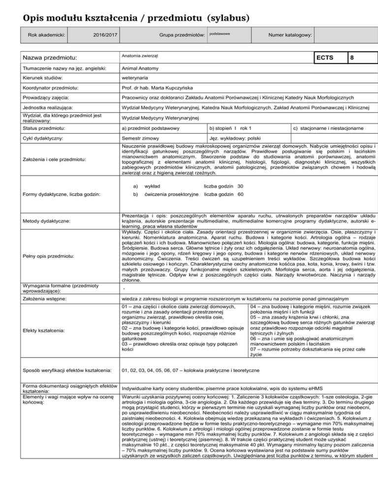 01_Anatomia_zwierzat_2016-17 - Wydział Medycyny Weterynaryjnej