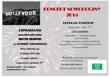 KONCERT NOWOROCZNY 2015 PROGRAM KONCERTU ZAPRASZAMY wszystkich miłośników Muzyki filmowej na KONCERT NOWOROCZNY, który odbędzie się rozpoczęcie – godz. 1700 Część estradowa: piosenki w wykonaniu uczniów i absolwentów, występy taneczne zespołów szkolnych, scenki kabaretowe w wykonaniu uczniów, niespodzianki. 17 lutego 2015 roku w naszej szkole – rozpoczęcie o godzinie 1700. Koordynator szkolny – Anna Kowalczyk, współorganizatorzy i artyści W przerwie zapraszamy na poczęstunek i udział w loterii fantowej. Życzymy miłej zabawy. Patronat medialny objęła: