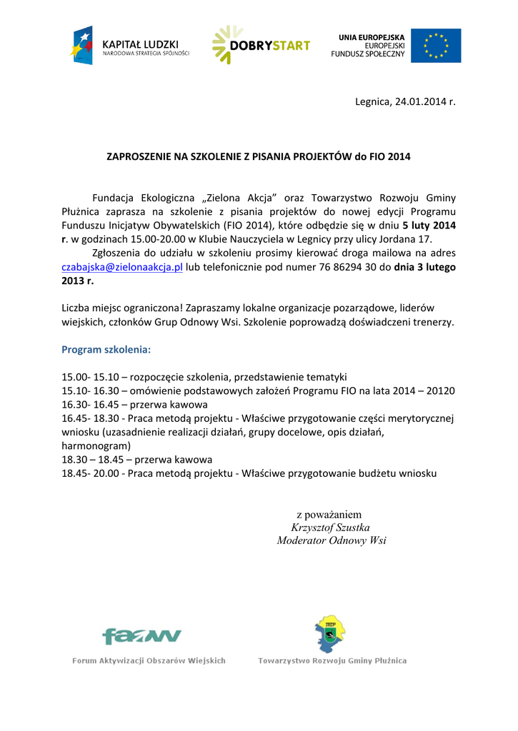 Legnica, 24.01.2014 r. ZAPROSZENIE NA SZKOLENIE Z PISANIA PROJEKTÓW do FIO 2014 Fundacja Ekologiczna „Zielona Akcja” oraz Towarzystwo Rozwoju Gminy Płużnica zaprasza na szkolenie z pisania projektów do nowej edycji Programu Funduszu Inicjatyw Obywatelskich (FIO 2014), które odbędzie się w dniu 5 luty 2014 r. w godzinach 15.00-‐20.00 w Klubie Nauczyciela w Legnicy przy ulicy Jordana 17. Zgłoszenia do udziału w szkoleniu prosimy kierować droga mailowa na adres [email protected] lub telefonicznie pod numer 76 86294 30 do dnia 3 lutego 2013 r. Liczba miejsc ograniczona! Zapraszamy lokalne organizacje pozarządowe, liderów wiejskich, członków Grup Odnowy Wsi. Szkolenie poprowadzą doświadczeni trenerzy. Program szkolenia: 15.00-‐ 15.10 – rozpoczęcie szkolenia, przedstawienie tematyki 15.10-‐ 16.30 – omówienie podstawowych założeń Programu FIO na lata 2014 – 20120 16.30-‐ 16.45 – przerwa kawowa 16.45-‐ 18.30 -‐ Praca metodą projektu -‐ Właściwe przygotowanie części merytorycznej wniosku (uzasadnienie realizacji działań, grupy docelowe, opis działań, harmonogram) 18.30 – 18.45 – przerwa kawowa 18.45-‐ 20.00 -‐ Praca metodą projektu -‐ Właściwe przygotowanie budżetu wniosku z poważaniem Krzysztof Szustka Moderator Odnowy Wsi