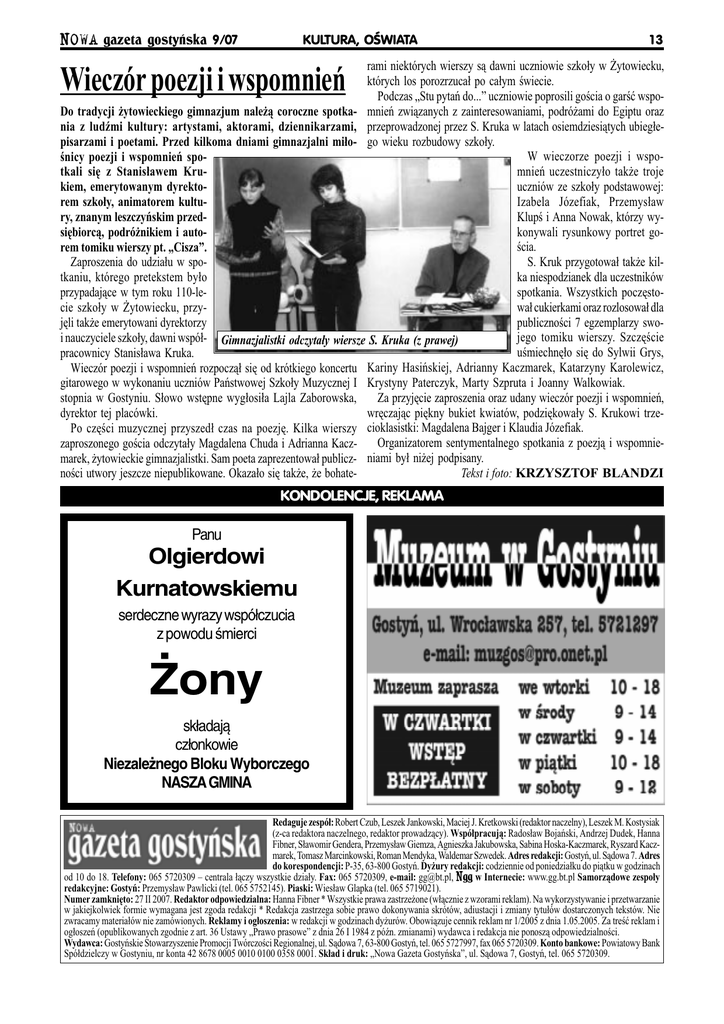 NOWA gazeta gostyñska 9/07 KULTURA, OWIATA 13 Wieczór poezji i wspomnieñ rami niektórych wierszy s¹ dawni uczniowie szko³y w ¯ytowiecku, których los porozrzuca³ po ca³ym wiecie. Podczas Stu pytañ do... uczniowie poprosili gocia o garæ wspoDo tradycji ¿ytowieckiego gimnazjum nale¿¹ coroczne spotka- mnieñ zwi¹zanych z zainteresowaniami, podró¿ami do Egiptu oraz nia z ludmi kultury: artystami, aktorami, dziennikarzami, przeprowadzonej przez S. Kruka w latach osiemdziesi¹tych ubieg³episarzami i poetami. Przed kilkoma dniami gimnazjalni mi³o- go wieku rozbudowy szko³y. W wieczorze poezji i wsponicy poezji i wspomnieñ spomnieñ uczestniczy³o tak¿e troje tkali siê z Stanis³awem Kruuczniów ze szko³y podstawowej: kiem, emerytowanym dyrektoIzabela Józefiak, Przemys³aw rem szko³y, animatorem kultuKlup i Anna Nowak, którzy wyry, znanym leszczyñskim przedkonywali rysunkowy portret gosiêbiorc¹, podró¿nikiem i autocia. rem tomiku wierszy pt. Cisza. S. Kruk przygotowa³ tak¿e kilZaproszenia do udzia³u w spoka niespodzianek dla uczestników tkaniu, którego pretekstem by³o spotkania. Wszystkich poczêstoprzypadaj¹ce w tym roku 110-lewa³ cukierkami oraz rozlosowa³ dla cie szko³y w ¯ytowiecku, przypublicznoci 7 egzemplarzy swojêli tak¿e emerytowani dyrektorzy jego tomiku wierszy. Szczêcie i nauczyciele szko³y, dawni wspó³- Gimnazjalistki odczyta³y wiersze S. Kruka (z prawej) umiechnê³o siê do Sylwii Grys, pracownicy Stanis³awa Kruka. Wieczór poezji i wspomnieñ rozpocz¹³ siê od krótkiego koncertu Kariny Hasiñskiej, Adrianny Kaczmarek, Katarzyny Karolewicz, gitarowego w wykonaniu uczniów Pañstwowej Szko³y Muzycznej I Krystyny Paterczyk, Marty Szpruta i Joanny Walkowiak. Za przyjêcie zaproszenia oraz udany wieczór poezji i wspomnieñ, stopnia w Gostyniu. S³owo wstêpne wyg³osi³a Lajla Zaborowska, wrêczaj¹c piêkny bukiet kwiatów, podziêkowa³y S. Krukowi trzedyrektor tej placówki. Po czêci muzycznej przyszed³ czas na poezjê. Kilka wierszy cioklasistki: Magdalena Bajger i Klaudia Józefiak. Organizatorem sentymentalnego spotkania z poezj¹ i wspomniezaproszonego gocia odczyta³y Magdalena Chuda i Adrianna Kaczmarek, ¿ytowieckie gimnazjalistki. Sam poeta zaprezentowa³ publicz- niami by³ ni¿ej podpisany. Tekst i foto: KRZYSZTOF BLANDZI noci utwory jeszcze niepublikowane. Okaza³o siê tak¿e, ¿e bohate- KONDOLENCJE, REKLAMA Panu Olgierdowi Kurnatowskiemu serdeczne wyrazy wspó³czucia z powodu mierci ¯ony sk³adaj¹ cz³onkowie Niezale¿nego Bloku Wyborczego NASZA GMINA Redaguje zespó³: Robert Czub, Leszek Jankowski, Maciej J. Kretkowski (redaktor naczelny), Leszek M. Kostysiak (z-ca redaktora naczelnego, redaktor prowadz¹cy). Wspó³pracuj¹: Rados³aw Bojañski, Andrzej Dudek, Hanna Fibner, S³awomir Gendera, Przemys³aw Giemza, Agnieszka Jakubowska, Sabina Hoska-Kaczmarek, Ryszard Kaczmarek, Tomasz Marcinkowski, Roman Mendyka, Waldemar Szwedek. Adres redakcji: Gostyñ, ul. S¹dowa 7. Adres do korespondencji: P-35, 63-800 Gostyñ. Dy¿ury redakcji: codziennie od poniedzia³ku do pi¹tku w godzinach od 10 do 18. Telefony: 065 5720309 centrala ³¹czy wszystkie dzia³y. Fax: 065 5720309, e-mail: [email protected], Ngg w Internecie: www.gg.bt.pl Samorz¹dowe zespo³y redakcyjne: Gostyñ: Przemys³aw Pawlicki (tel. 065 5752145). Piaski: Wies³aw Glapka (tel. 065 5719021). Numer zamkniêto: 27 II 2007. Redaktor odpowiedzialna: Hanna Fibner * Wszystkie prawa zastrze¿one (w³¹cznie z wzorami reklam). Na wykorzystywanie i przetwarzanie w jakiejkolwiek formie wymagana jest zgoda redakcji * Redakcja zastrzega sobie prawo dokonywania skrótów, adiustacji i zmiany tytu³ów dostarczonych tekstów. Nie zwracamy materia³ów nie zamówionych. Reklamy i og³oszenia: w redakcji w godzinach dy¿urów. Obowi¹zuje cennik reklam nr 1/2005 z dnia 1.05.2005. Za treæ reklam i og³oszeñ (opublikowanych zgodnie z art. 36 Ustawy Prawo prasowe z dnia 26 I 1984 z pón. zmianami) wydawca i redakcja nie ponosz¹ odpowiedzialnoci. Wydawca: Gostyñskie Stowarzyszenie Promocji Twórczoci Regionalnej, ul. S¹dowa 7, 63-800 Gostyñ, tel. 065 5727997, fax 065 5720309. Konto bankowe: Powiatowy Bank Spó³dzielczy w Gostyniu, nr konta 42 8678 0005 0010 0100 0358 0001. Sk³ad i druk: Nowa Gazeta Gostyñska, ul. S¹dowa 7, Gostyñ, tel. 065 5720309.