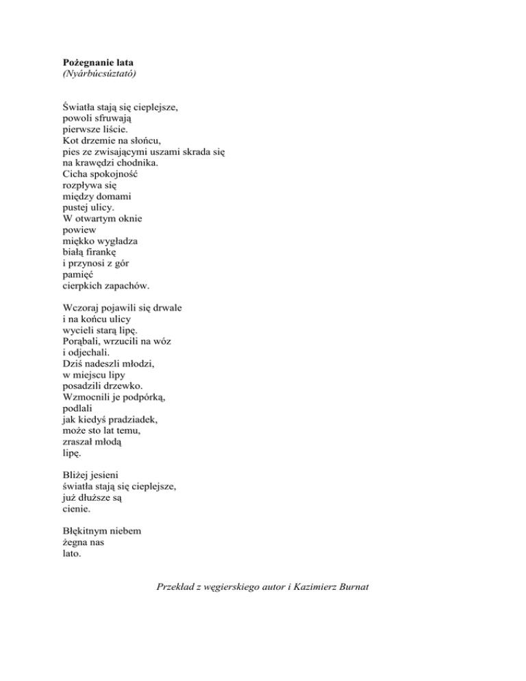 PoŜegnanie lata (Nyárbúcsúztató) Światła stają się cieplejsze, powoli sfruwają pierwsze liście. Kot drzemie na słońcu, pies ze zwisającymi uszami skrada się na krawędzi chodnika. Cicha spokojność rozpływa się między domami pustej ulicy. W otwartym oknie powiew miękko wygładza białą firankę i przynosi z gór pamięć cierpkich zapachów. Wczoraj pojawili się drwale i na końcu ulicy wycieli starą lipę. Porąbali, wrzucili na wóz i odjechali. Dziś nadeszli młodzi, w miejscu lipy posadzili drzewko. Wzmocnili je podpórką, podlali jak kiedyś pradziadek, moŜe sto lat temu, zraszał młodą lipę. BliŜej jesieni światła stają się cieplejsze, juŜ dłuŜsze są cienie. Błękitnym niebem Ŝegna nas lato. Przekład z węgierskiego autor i Kazimierz Burnat