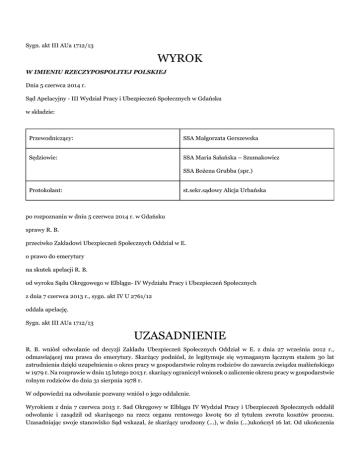 Sygn. akt III AUa 1712/13 WYROK W IMIENIU RZECZYPOSPOLITEJ POLSKIEJ Dnia 5 czerwca 2014 r. Sąd Apelacyjny - III Wydział Pracy i Ubezpieczeń Społecznych w Gdańsku w składzie: Przewodniczący: SSA Małgorzata Gerszewska Sędziowie: SSA Maria Sałańska – Szumakowicz SSA Bożena Grubba (spr.) Protokolant: st.sekr.sądowy Alicja Urbańska po rozpoznaniu w dniu 5 czerwca 2014 r. w Gdańsku sprawy R. B. przeciwko Zakładowi Ubezpieczeń Społecznych Oddział w E. o prawo do emerytury na skutek apelacji R. B. od wyroku Sądu Okręgowego w Elblągu- IV Wydziału Pracy i Ubezpieczeń Społecznych z dnia 7 czerwca 2013 r., sygn. akt IV U 2761/12 oddala apelację. Sygn. akt III AUa 1712/13 UZASADNIENIE R. B. wniósł odwołanie od decyzji Zakładu Ubezpieczeń Społecznych Oddział w E. z dnia 27 września 2012 r., odmawiającej mu prawa do emerytury. Skarżący podniósł, że legitymuje się wymaganym łącznym stażem 30 lat zatrudnienia dzięki uzupełnieniu o okres pracy w gospodarstwie rolnym rodziców do zawarcia związku małżeńskiego w 1979 r. Na rozprawie w dniu 15 lutego 2013 r. skarżący ograniczył wniosek o zaliczenie okresu pracy w gospodarstwie rolnym rodziców do dnia 31 sierpnia 1978 r. W odpowiedzi na odwołanie pozwany wniósł o jego oddalenie. Wyrokiem z dnia 7 czerwca 2013 r. Sad Okręgowy w Elblągu IV Wydział Pracy i Ubezpieczeń Społecznych oddalił odwołanie i zasądził od skarżącego na rzecz organu rentowego kwotę 60 zł tytułem zwrotu kosztów procesu. Uzasadniając swoje stanowisko Sąd wskazał, że skarżący urodzony (...), w dniu (...)ukończył 16 lat. Od ukończenia przez skarżącego 16 lat do ukończenia nauki w szkole średniej, wnioskodawca mieszkał z rodzicami i rodzeństwem w miejscowości B. i uczęszczał do Liceum Ogólnokształcącego w L.. Pomiędzy B. a L. znajdowało się gospodarstwo rolne rodziców skarżącego o powierzchni 3,16 ha, położone w miejscowości R.. W gospodarstwie tym część gruntów przeznaczona była na łąkę i pastwisko, na pozostałej części uprawiano zboże, ziemniaki i buraki. Chowano 2 krowy, konia i kilka świń. W pracach w gospodarstwie uczestniczyli rodzice wnioskodawcy i wnioskodawca, rzadko jego o 3 lata starszy brat i mieszkająca w tym gospodarstwie wdowa po dziadku skarżącego (druga żona dziadka). Dziadek wnioskodawcy wówczas już nie żył. W gospodarstwie były tylko drobne maszyny rolnicze. Prace polowe takie jak orka, rodzice skarżącego zlecali kółku rolniczemu albo wykonywał je ojciec wnioskodawcy z użyciem sprzętu z zakładu pracy. Młodsze rodzeństwo skarżącego to brat (młodszy o 7 lat) i siostra urodzona w (...) r., która w wieku około 5 lat zaczęła uczęszczać do przedszkola. Wcześniej zajmowała się nią matka. Zajęcia szkolne zaczynały się przeważnie o 8 i trwały zwykle do 14-15. Wnioskodawca do szkoły dojeżdżał głównie autobusem. Zdarzało się, że wnioskodawca przed lekcjami zatrzymywał się w R., gdzie obrządzał zwierzęta. Po lekcjach wnioskodawca jechał zwykle do B., sporadycznie wysiadał w R.. Wnioskodawca jeździł do R. w godzinach popołudniowych do pomocy w gospodarstwie kilka razy w tygodniu. Jego praca w gospodarstwie przekraczała wymiar 4 godzin na dobę tylko w okresach nasilenia prac polowych. Ubezpieczony wykazał 28 lat, 6 m-cy i 13 dni okresów składkowych i nieskladkowych. Skarżący jest nauczycielem ze stażem pracy w tym zawodzie przekraczającym 20 lat. Spór w sprawie sprowadzał się do ustalenia, czy skarżący legitymuje się trzydziestoletnim okresem zatrudnienia. Z uwagi na fakt, że okres składkowy i nieskładkowy skarżącego do dnia złożenia wniosku wynosił 28 lat i 6 m-cy, zaś do dnia ustania stosunku pracy (31 sierpnia 2012r.) – 28 lat, 6 m-cy i 13 dni, wnioskodawca domagał się uzupełnienia okresu zatrudnienia okresem pracy w gospodarstwie rolnym rodziców. Mając na uwadze powyższe, Sąd podkreślił, że zgodnie z art. 10 ust. 1 pkt 3 ustawy o emeryturach i rentach z FUS, przy ustalaniu prawa do emerytury uwzględnia się również przypadające przed dniem 1 stycznia 1983 r. okresy pracy w gospodarstwie rolnym po ukończeniu 16 roku życia, traktując je jak okresy składkowe, w zakresie niezbędnym do uzupełnienia tego okresu, a więc w realiach rozpoznawanej sprawy – 1 roku, 5 m-cy i 17 dni. Dokonując oceny wnioskowanego przez ubezpieczonego okresu Sąd wskazał, że o ile nie można zgodzić się z twierdzeniem pozwanego, że dojazdy musiały stać na przeszkodzie pracy wnioskodawcy w gospodarstwie, o tyle słusznie akcentuje się w odpowiedzi na odwołanie, że przedmiotowe gospodarstwo było małe, a sposób jego organizacji nie wymagał szczególnego nakładu pracy. Taką ocenę potwierdza nie tylko to, że gospodarstwo rodziców skarżącego funkcjonowało jeszcze przez około 2 lata po zakończeniu okresu świadczenia pomocy w nim przez wnioskodawcę, ale i jego struktura. Część gruntów gospodarstwa wykorzystywana była jako łąka i pastwisko, na części uprawiano zboże, ziemniaki i buraki. Żaden z tych sposobów wykorzystania gruntów rolnych nie wymaga (przy łącznym areale około 3 ha) szczególnego nakładu pracy kilku osób, o jakim można by mówić np. przy ich wykorzystaniu ogrodniczym. W tym kontekście ocena przedstawionych Sądowi dowodów osobowych musiała być dla skarżącego niekorzystna, pomimo tego, że nie ujawniły się żadne podstawy do tego, aby nie przydać waloru wiarygodności zeznaniom świadków J. D., M. Z. i J. C.. Co do zeznań świadków mieszkających w sąsiedztwie gruntów, które niegdyś stanowiły gospodarstwo rolne rodziców wnioskodawcy, tj. J. D. i M. Z., można z nich wysnuć jedynie ogólny wniosek, co do niespornej okoliczności, że wnioskodawca świadczył pomoc w tymże gospodarstwie, w żadnym jednak razie – co do zakresu tej pomocy, gdyż świadkowie nie mieli takiej wiedzy. Co do rodzaju prac wykonywanych przez wnioskodaw