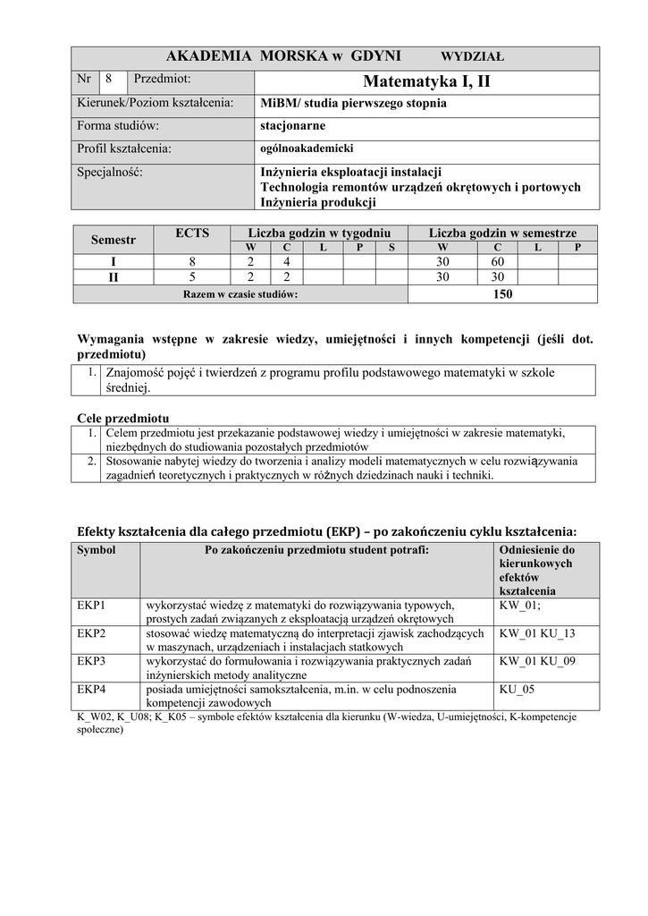 WYDZIAŁ AKADEMIA MORSKA w GDYNI Nr 8 Przedmiot: Matematyka I, II Kierunek/Poziom kształcenia: MiBM/ studia pierwszego stopnia Forma studiów: stacjonarne Profil kształcenia: ogólnoakademicki Specjalność: Inżynieria eksploatacji instalacji Technologia remontów urządzeń okrętowych i portowych Inżynieria produkcji ECTS Semestr 8 5 I II Liczba godzin w tygodniu W C 2 2 4 2 L P Liczba godzin w semestrze S W C 30 30 60 30 150 Razem w czasie studiów: L P Wymagania wstępne w zakresie wiedzy, umiejętności i innych kompetencji (jeśli dot. przedmiotu) 1. Znajomość pojęć i twierdzeń z programu profilu podstawowego matematyki w szkole średniej. Cele przedmiotu 1. Celem przedmiotu jest przekazanie podstawowej wiedzy i umiejętności w zakresie matematyki, niezbędnych do studiowania pozostałych przedmiotów 2. Stosowanie nabytej wiedzy do tworzenia i analizy modeli matematycznych w celu rozwiązywania zagadnień teoretycznych i praktycznych w różnych dziedzinach nauki i techniki. Efekty kształcenia dla całego przedmiotu (EKP) – po zakończeniu cyklu kształcenia: Symbol EKP1 EKP2 EKP3 EKP4 Po zakończeniu przedmiotu student potrafi: wykorzystać wiedzę z matematyki do rozwiązywania typowych, prostych zadań związanych z eksploatacją urządzeń okrętowych stosować wiedzę matematyczną do interpretacji zjawisk zachodzących w maszynach, urządzeniach i instalacjach statkowych wykorzystać do formułowania i rozwiązywania praktycznych zadań inżynierskich metody analityczne posiada umiejętności samokształcenia, m.in. w celu podnoszenia kompetencji zawodowych Odniesienie do kierunkowych efektów kształcenia KW_01; KW_01 KU_13 KW_01 KU_09 KU_05 K_W02, K_U08; K_K05 – symbole efektów kształcenia dla kierunku (W-wiedza, U-umiejętności, K-kompetencje społeczne) Treści programowe: Semestr I Zagadnienia Lp. 1. 2. 3. 4. 5. 6. Liczby zespolone. Definicja liczby zespolonej, postać algebraiczna, trygonometryczna i wykładnicza liczby zespolonej Algebra wektorów. Działania na wektorach, iloczyn skalarny, wektorowy i mieszany wektorów. Geometria analityczna na płaszczyźnie i w przestrzeni. Prosta i płaszczyzna w przestrzeni. Analiza matematyczna. Granica i ciągłość funkcji, pochodna funkcji, różniczka, pochodne wyższych rzędów, wzór Taylora, ekstrema lokalne i absolutne. Definicja macierzy. Działanie na macierzach, macierz odwrotna. Wyznaczniki. Wartości własne macierzy. Układy Równań liniowych, wzory Cramera. Rozwiązywanie układów równań rachunkiem macierzowym. Rachunek całkowy funkcji jednej zmiennej. Definicja funkcji pierwotnej i całki oznaczonej. Podstawowe wzory i metody całkowania. Całkowanie funkcji wymiernych, niewymiernych i trygonometrycznych. Całka oznaczona Riemanna. Wzór Newtona-Leibniza. Całki niewłaściwe. Zastosowanie całki w geometrii i fizyce. Rachunek różniczkowy funkcji wielu zmiennych. Definicja funkcji dwóch zmiennych, granica, ciągłość funkcji. Pochodne cząstkowe, pochodne kierunkowe, gradient funkcji. Ekstrema funkcji dwóch zmiennych, Różniczka zupełna i jej zastosowania. Wzór Taylora. Funkcja uwikłana, pochodne, ekstremum funkcji uwikłanej. W C 2 4 Odniesienie do EKP dla L/P przedmiotu EKP1,EKP2 5 10 EKP1,EKP2 8 16 EKP1,EKP2 4 8 EKP1,EKP2 8 16 EKP1,EKP2 3 6 EKP1,EKP2 Liczba godzin Semestr II Lp. 1. 2. 3. Zagadnienia Liczba godzin W Ć L 5 5 Rachunek całkowy funkcji wielu zmiennych. Całka podwójna po prostokącie i w obszarze normalnym. Współrzędne biegunowe. Całka potrójna w prostopadłościanie i w obszarze normalnym. Całka potrójna we współrzędnych walcowych i sferycznych. 6 6 Całka krzywoliniowa i powierzchniowa. Całka krzywoliniowa nieskierowana i skierowana, twierdzenie Greena. Całka powierzchniowa zorientowana i niezorientowana, twierdzenie Stokes’a, twierdzenie Gaussa. 10 10 Równania różniczkowe. Definicja równania różniczkowego i zagadnień brzegowych. Rozwiązywanie wybranych typów równań różniczkowych: Odniesienie do EKP dla przedmiotu EKP1,EKP2 EKP1,EKP2 EKP1,EKP2 Równania różniczkowe o rozdzielonych zmiennych. Równania różniczkowe liniowe pierwszego rzędu. Rozwiązywanie równań niejednorodnych (metoda uzmienniania stałej, metoda przewidywań). Równanie Bernoulliego. Równania różniczkowe liniowe drugiego rzędu o stałych współczynnikach. 3 Szeregi liczbowe. Definicja szeregu liczbowego, zbieżność szeregów o wyrazach dodatnich. Kryteria zbieżności szeregów liczbowych: kryterium Cauchy’ego, d’Alamberta, całkowe, porównawcze. Szeregi liczbowe o wyrazach dowolnych, szeregi naprzemienne, kryterium Leibniza. 6 Transformata Laplace’a, odwrotna transformata Laplace’a, zastosowanie transformaty do rozwiązywania równań różniczkowych. 4. 5. 3 EKP1,EKP2 6 EKP1,EKP2 Metody weryfikacji efektów kształcenia /w odniesieniu do poszczególnych efektów/: Symbol EKP Test EKP1 EKP2 EKP3 EKP4 Egzamin ustny Egzamin pisemny Kolokwium X X X X X X X X Sprawozdanie Projekt Prezentacja Zaliczenie praktyczne Inne Kryteria zaliczenia przedmiotu: Semestr I Ocena pozytywna (min. dostateczny) Student uzyskał zakładane efekty kształcenia oraz spełnia wymagania konwencji STCW odnośnie zaliczenia przedmiotu. Uczęszczał na wykłady i ćwiczenia (dopuszczalne – 3 nieobecności). Ćwiczenia: 2 kolokwia. Wykład: egzamin pisemny. Ocena do indeksu oceną średnią z otrzymanych ocen z wykładu i ćwiczeń z uwzględnieniem aktywności na ćwiczeniach, po pozytywnym zaliczeniu dwóch kolokwiów i egzaminu. Student uzyskał zakładane efekty kształcenia. Uczęszczał na wykłady i ćwiczenia. Ćwiczenia: 2 kolokwia. II Wykład: egzamin pisemny. Ocena do indeksu oceną średnią z otrzymanych ocen z wykładu i ćwiczeń z uwzględnieniem aktywności na ćwiczeniach, po pozytywnym zaliczeniu dwóch kolokwiów i egzaminu. Uwaga: student otrzymuje ocenę powyżej dst., jeżeli uzyskane efekty kształcenia przekraczają wymagane minimum. Nakład pra