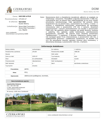 DOM Numer oferty: Do/444 Cena: 640 000 zł PLN Powierzchnia: 270.00 m² O ofercie: Sprzedaż Rynek Wtórny Lokalizacja: Nowa Wieś Tworoska ( Nowa Wieś Tworoska ) woj. Śląskie www.czerkawskinieruchomosci.com.pl/oferta/10099 Opis: Nowoczesny dom o charakterze rezydencji, głównie ze względu na lokalizację i otoczenie. Posiadłość o łącznej powierzchni 7.200 m2, usytuowana jest za pasem lasu oddzielającego ją od ulicy, blisko przystanku autobusowego. Cała ogrodzona. Na polanie, która rozpościera się za pasem lasu, usytuowane są 3 domy, 2 nowe i 1 stylowy o charakterze leśniczówki. proponujemy do sprzedaży nowoczesny dom o powierzchni 270 m2, z dużymi, otwartym przestrzeniami i dużymi przeszkleniami (na działce o powierzchni 1900 m2). Na parterze domu znajduje się pokój dzienny, kuchnia z jadalnią, hol, gabinet, pokój telewizyjny, pomieszczenie gospodarcze, spiżarka. Na piętrze dużo otwartej przestrzeni "poddaszowej", 3 sypialnie, 2 łazienki. Oddzielnie można kupić ( lub wynająć) garaż 5-cio stanowiskowy, o powierzchni 126 m2, z zadaszeniem grilowym i poddaszem użytkowym, na działce 110 m2 . Do sprzedania również sąsiedni stylowy dom murowany, z drewnianą elewacją o powierzchni 120 m2, z kortami. Informacje dodatkowe Rodzaj obiektu wolnostojący Ilu rodzinny 1 rodzinny Powierzchnia użytkowa 270.00 Powierzchnia działki 1900.00 Kaucja Ilość pokoi 7 Cena za metr 2370.37 Typ budynku dom Stan do zamieszkania Standard wysoki Przeznaczenie mieszkaniowe Ilość kondygnacji 2 Ilość łazienek 2 Dach dachówka cementowa Typ kuchni otwarta Przynależne Okna Ogrzewanie garaż, PCV, elektryczne podłogowe, kominek, Dane kontaktowe agenta: Łopatyńska Grażyna kom. 505-059-966 e-mail: [email protected] Nr licencji: 2185 Jerzy Czerkawski www.czerkawski-nieruchomosci.com.pl