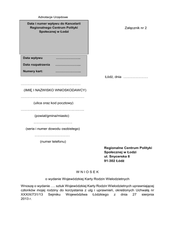 Adnotacje Urzędowe Data i numer wpływu do Kancelarii Regionalnego Centrum Polityki Społecznej w Łodzi Data wpływu ………………….. Data rozpatrzenia …………………... Numery kart: …………………... Załącznik nr 2 Łódź, dnia ………………… …………………………………………… (IMIĘ I NAZWISKO WNIOSKODAWCY) ……………………………………………… (ulica oraz kod pocztowy) …………………………….….…….…..….. (powiat/gmina/miasto) …………………………… (seria i numer dowodu osobistego) ………………………… (numer telefonu) Regionalne Centrum Polityki Społecznej w Łodzi ul. Snycerska 8 91-302 Łódź WNIOSEK o wydanie Wojewódzkiej Karty Rodzin Wielodzietnych Wnoszę o wydanie …. sztuk Wojewódzkiej Karty Rodzin Wielodzietnych uprawniającej członków mojej rodziny do korzystania z ulg i uprawnień, określonych Uchwałą nr XXXIX/731/13 Sejmiku Województwa Łódzkiego z dnia 27 sierpnia 2013 r. Proszę zaznaczyć odpowiednio: □ Nowe Karty □ duplikaty □ przedłużenie Kart Oświadczam, że moja rodzina składa się z następujących osób wspólnie zamieszkałych pod wyżej wskazanym adresem: 1. ………………………………………………………………………………………… (imię, nazwisko, PESEL Wnioskodawcy) 2. ………………………………………………………………………………………… (imię, nazwisko, PESEL, stopień pokrewieństwa w stosunku do Wnioskodawcy) 3. ………………………………………………………………………………………… (imię, nazwisko, PESEL, stopień pokrewieństwa w stosunku do Wnioskodawcy) 4. ………………………………………………………………………………………… (imię, nazwisko, PESEL, stopień pokrewieństwa w stosunku do Wnioskodawcy) 5. ………………………………………………………………………………………… (imię, nazwisko, PESEL, stopień pokrewieństwa w stosunku do Wnioskodawcy) 6. ………………………………………………………………………………………… (imię, nazwisko, PESEL, stopień pokrewieństwa w stosunku do Wnioskodawcy) 7. ………………………………………………………………………………………… (imię, nazwisko, PESEL, stopień pokrewieństwa w stosunku do Wnioskodawcy) 8. ………………………………………………………………………………………… (imię, nazwisko, PESEL, stopień pokrewieństwa w stosunku do Wnioskodawcy) 9. ………………………………………………………………………………………… (imię, nazwisko, PESEL, stopień pokrewieństwa w stosunku do Wnioskodawcy) 10. ………………………………………………………………………………………… (imię, nazwisko, PESEL, stopień pokrewieństwa w stosunku do Wnioskodawcy) Miejsce na potwierdzenie przez urząd gminy lub miasta danych zawartych we wniosku Potwierdzam zgodność danych (miejsce zamieszkania/zameldowania oraz liczba osób w rodzinie), zawartych we wniosku o Wojewódzką Kartę Rodzin Wielodzietnych ………………….. data ………………………………. podpis pracownika ………………………….. pieczęć urzędu Do wniosku dołączam: a) w przypadku osób, które nie uzyskały potwierdzenia przez urząd gminy lub miasta, danych zwartych we wniosku – kserokopię aktów urodzenia dzieci lub skrócone odpisy aktów urodzenia, wymienionych we wniosku dzieci lub zaświadczenie o zameldowaniu; b) w przypadku osób, które nie uzyskały potwierdzenia przez urząd gminy lub miasta, danych zwartych we wniosku – kserokopię dowodu osobistego rodziców lub opiekunów prawnych; c) w przypadku dzieci powyżej 18 roku życia – zaświadczenie lub oświadczenie potwierdzające kontynuowanie nauki (załącznik nr 3) lub kserokopię legitymacji szkolnej lub studenckiej; d) w przypadku rodzin zastępczych – kserokopię postanowienia sądu o ustanowieniu rodziny zastępczej, w tym o charakterze pogotowia rodzinnego; e) w przypadku rodzinnego domu dziecka – kserokopię postanowienia sądu o umieszczeniu dziecka w rodzinnym domu dziecka; f) w przypadku opiekuna prawnego – kserokopię postanowienia sądu o ustanowieniu opieki prawnej nad dzieckiem; g) w przypadku rodzin z dzieckiem/dziećmi niepełnosprawnym(i) powyżej 18go roku życia – kserokopię orzeczenia o znacznym stopniu niepełnosprawności lub całkowitej niezdolności do pracy i samodzielnej egzystencji ……….………………………………………… (data i podpis wnioskodawcy) Jednocześnie oświadczam, że: 1. Dane zawarte we wniosku oraz oświadczenia są zgodne z prawdą, a kserokopie dokumentów są zgodne z oryginałem i stanem faktycznym na dzień składania wniosku – w związku z tym jestem świadomy / a odpowiedzialności za składanie nieprawdziwych oświadczeń oraz zobowiązuję się niezwłocznie poinformować o wszelkich zmianach danych zawartych w niniejszym wniosku; 2. Zostałam poinformowana / zostałem poinformowany, że Karta ma charakter osobisty i nie może być użyczana, bądź odstępowana nieuprawnionym osobom. ……….………………………………………… (data i podpis wnioskodawcy) Wyrażam zgodę – w związku z art. 7 pkt 5 w odniesieniu do art. 24 ust. 1 ustawy z dnia 29 sierpnia 1997 r. o ochronie danych osobowych (Dz. U. z 2002 r., Nr 101, poz. 926, z późn. zm.) – na gromadzenie i przetwarzanie przez Regionalne Centrum Polityki Społecznej w Łodzi, ul. Snycerska 8, danych osobowych zawartych we wniosku o wydanie Wojewódzkiej Karty Rodzin Wielodzietnych i załącznikach do wniosku, zawierającym imiona, nazwisko, PESEL, serię i numer dowodu osobistego, adres zamieszkania, numer telefonu oraz - w przypadku osób, których uprawnienie dotyczy 