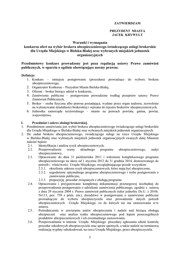ZATWIERDZAM PREZYDENT MIASTA JACEK KRYWULT Warunki i wymagania konkursu ofert na wybór brokera ubezpieczeniowego świadczącego usługi brokerskie dla Urzędu Miejskiego w Bielsku-Białej oraz wybranych miejskich jednostek organizacyjnych Przedmiotowy konkurs prowadzony jest poza regulacją ustawy Prawo zamówień publicznych, w oparciu o ogólnie obowiązujące normy prawne. Definicje: 1. Konkurs – niniejsze postępowanie (procedura) prowadzące do wyboru brokera ubezpieczeniowego, 2. Organizator Konkursu – Prezydent Miasta Bielska-Białej, 3. Oferent – broker biorący udział w konkursie, 4. Zamówienie publiczne – postępowanie prowadzone według przepisów ustawy Prawo Zamówień Publicznych, 5. Broker – osoba fizyczna albo prawna posiadająca, wydane przez organ nadzoru, zezwolenie na wykonywanie działalności brokerskiej i wpisana do rejestru brokerów ubezpieczeniowych, 6. Jednostka samorządu terytorialnego – miasto na prawach powiatu, gmina, powiat, województwo. I. Przedmiot i zakres obsługi brokerskiej. 1. Przedmiotem zamówienia jest wybór brokera ubezpieczeniowego świadczącego usługi brokerskie dla Urzędu Miejskiego w Bielsku-Białej oraz wybranych miejskich jednostek organizacyjnych. 2. Do zadań brokera ubezpieczeniowego, świadczącego usługi na rzecz Urzędu Miejskiego w Bielsku-Białej oraz wybranych miejskich jednostek organizacyjnych zwanych dalej Miastem naleŜeć będzie: 2.1. Identyfikacja i analiza ryzyk ubezpieczeniowych, 2.2. Przeprowadzenie oceny aktualnego programu ubezpieczeniowego, audyt ubezpieczeniowy, 2.3. Opracowanie do dnia 31 października 2011 i wdroŜenie kompleksowego programu ubezpieczeniowego na okres od 1 stycznia 2012 do 31 grudnia 2014, dostosowanego do potrzeb i właściwości Urzędu Miejskiego, uwzględniającego przede wszystkim: 2.3.1. określenie zakresu ryzyk ubezpieczeniowych, które mają być ubezpieczone, 2.3.2. uzgodnienie optymalnego programu ubezpieczeniowego i trybu postępowania o zamówienie publiczne, 2.3.3. propozycję procedur związanych z obsługą programu. 2.4. Opracowanie i przygotowanie kompletnej dokumentacji przetargowej niezbędnej do przeprowadzenia postępowania o udzielenie zamówienia publicznego, zgodnie z ustawą z dnia 29 stycznia 2004 r. Prawo zamówień publicznych (tekst jednolity Dz.U. z 2010r. Nr113, poz. 759 z późn. zm.), doradztwo w postępowaniu o zamówienie publiczne prowadzącym do wyboru ubezpieczyciela oraz prowadzenie innych potrzeb ubezpieczeniowych Urzędu Miejskiego, co do których nie ma zastosowania w/w ustawa. 2.5. Pośredniczenie w zawieraniu umów ubezpieczenia i nadzór nad bieŜącą obsługą ubezpieczeń oraz analiza rynku ubezpieczeniowego pod kątem poszczególnych produktów ubezpieczeniowych i ich ewentualnego zastosowania. 2.6. Przeprowadzanie w imieniu Urzędu Miejskiego procedury zgłaszania szkód, kontrolę procedur szkodowych ubezpieczyciela oraz spraw spornych, a takŜe nadzór na terminową realizacją wypłaty odszkodowań, na rzecz Urzędu Miejskiego, przez ubezpieczyciela. 1 2.7. 2.8. 2.9. 2.10. 2.11. 2.12. II. 1. 2. 3. 4. 5. 6. 7. 8. 9. III. Merytoryczna ocena ofert w zakresie ubezpieczeń mienia składanych Urzędowi Miejskiemu. Doradztwo w zakresie ubezpieczeń i prawa ubezpieczeniowego. Zapewnienie terminowego obiegu dokumentów zgodnie z ustalonymi procedurami, Sporządzanie sprawozdań o przebiegu ubezpieczenia, wystawionych polisach, aneksach, szkodach. Organizowanie szkoleń dla pracowników w zakresie niezbędnym do wykonywania umów ubezpieczenia Organizowanie cyklicznych spotkań z zespołem odpowiedzialnym za ubezpieczenia. Istotne postanowienia do umowy: Broker będzie świadczył usługi brokerskie w zakresie ubezpieczeń zgodnie z ustawą z dnia 22 maja 2003 r. o pośrednictwie ubezpieczeniowym (Dz.U. z 2010r. nr 11 poz.66). Koszty powyŜszych czynności broker pokrywa ze środków własnych. Wynagrodzenie Brokera stanowić będzie prowizja brokerska, wypłacana przez ubezpieczyciela wybranego przez organizatora zgodnie z ustawą Prawo zamówień publicznych. Broker w przypadku powstania szkody w majątku Urzędu Miejskiego, wynikającej z winy brokera lub w przypadku nienaleŜytego wywiązywania się z warunków umowy, poniesie odpowiedzialność cywilną z tytułu wykonywanego zawodu. Składki ubezpieczeniowe będą przekazywane bezpośrednio przez Organizatora Konkursu na rachunek bankowy ubezpieczyciela. Umowa zostanie zawarta na czas określony od dnia podpisania umowy do dnia 31.03.2015 r., z moŜliwością jej rozwiązania bez podania przyczyny, z zachowaniem trzymiesięcznego terminu wypowiedzenia. Wszelkie zmiany umowy wymagają formy pisemnej pod rygorem niewaŜności. Organizator Konkursu zastrzega sobie prawo ostatecznego sformułowania treści umowy. Do treści mogą zostać wprowadzone tylko i wyłącznie takie postanowienia, które nie będą powodować sprzeczności umowy z warunkami i postanowieniami określonymi w niniejszym regulaminie oraz z obowiązującymi przepisami prawa polskiego. W sprawach nie uregulowanych umową zastosowanie mają przepisy ustawy z dnia 22 maja 2003 r. o pośrednictwie ubezpieczeniowym (Dz.U. z 2010r. nr 11 poz.66) oraz Kodeksu cywilnego. Warunki uczestnictwa w konkursie. 1. W konkursie mogą brać udział osoby fizyczne lub prawne wykonujące działalność brokerską w rozumieniu ustawy z dnia 22 maja 2003 r. o pośrednictwie ubezpieczeniowym (Dz.U. z 2010r. nr 11 poz.66) , które spełniają następujące wymagania: 1.1. posiadają waŜne zezwolenie na wykonywanie działalności brokerskiej i są wpisane do rejestru brokerów ubezpieczeniowych, 1.2. prowadzą działalność na polskim rynku pośrednictwa ubezpieczeniowego nieprzerwanie od co najmniej 10 lat, 1.3. posiadają oddział lub siedzibę lub przedstawicielstwo na terenie „Miasta Bielska-Białej”, w którym świadczą usługi przez: a) co najmniej 5 osób legitymujących się waŜną licencją brokera ubezpieczeniowego, b