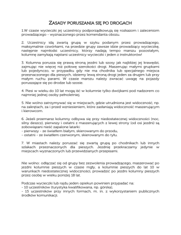 ZASADY PORUSZANIA SIĘ PO DROGACH 1.W czasie wycieczki jej uczestnicy podporządkowują się rozkazom i zaleceniom prowadzącego - wyznaczonego przez komendanta obozu. 2. Uczestnicy idą zwartą grupą w szyku podanym przez prowadzącego, maksymalnie czwórkami, na przedzie grupy zawsze idzie prowadzący wycieczkę, następnie najmłodsi uczestnicy, którzy nadają tempo marszu pozostałym, kolumnę zamykają najstarsi uczestnicy wycieczki i jeden z instruktorów! 3. Kolumna porusza się prawą stroną jezdni lub szosy jak najbliżej jej krawędzi, zajmując nie więcej niż połowę szerokości drogi. Maszerując małymi grupkami lub pojedynczo, w przypadku gdy nie ma chodnika lub specjalnego miejsca przeznaczonego dla pieszych, idziemy lewą stroną drogi jeden za drugim lub przy małym ruchu parami. W czasie marszu należy zwracać uwagę na pojazdy poruszające się po drodze lub szosie. 4. Piesi w wieku do 10 lat mogą iść w kolumnie tylko dwójkami pod nadzorem co najmniej jednej osoby pełnoletniej. 5. Nie wolno zatrzymywać się w miejscach, gdzie utrudniona jest widoczność, np. na zakrętach, za i przed wzniesieniem, które zasłaniają widoczność maszerującym i kierowcom. 6. Jeżeli przemarsz kolumny odbywa się przy niedostatecznej widoczności (noc, silny deszcz), pierwszy i ostatni z maszerujących z lewej strony (od osi jezdni) są zobowiązani nieść zapalone latarki: - pierwszy - ze światłem białym, skierowanym do przodu, - ostatni - ze światłem czerwonym, skierowanym do tyłu. 7. W miastach należy poruszać się zwartą grupą po chodnikach lub innych szlakach przeznaczonych dla pieszych. Jezdnię przekraczamy jedynie w miejscach wyznaczonych lub przewidzianych przepisami. Nie wolno: odłączać się od grupy bez zezwolenia prowadzącego, maszerować po jezdni kolumnie pieszych w czasie mgły, a kolumnie pieszych do lat 10 w warunkach niedostatecznej widoczności, prowadzić po jezdni kolumny pieszych przez osobę w wieku poniżej 18 lat. Podczas wycieczki lub rajdu jeden opiekun powinien przypadać na: - 10 uczestników (turystyka kwalifikowana, np. górska), - 15 uczestników przy innych formach, m. in. z wykorzystaniem publicznych środków komunikacji.