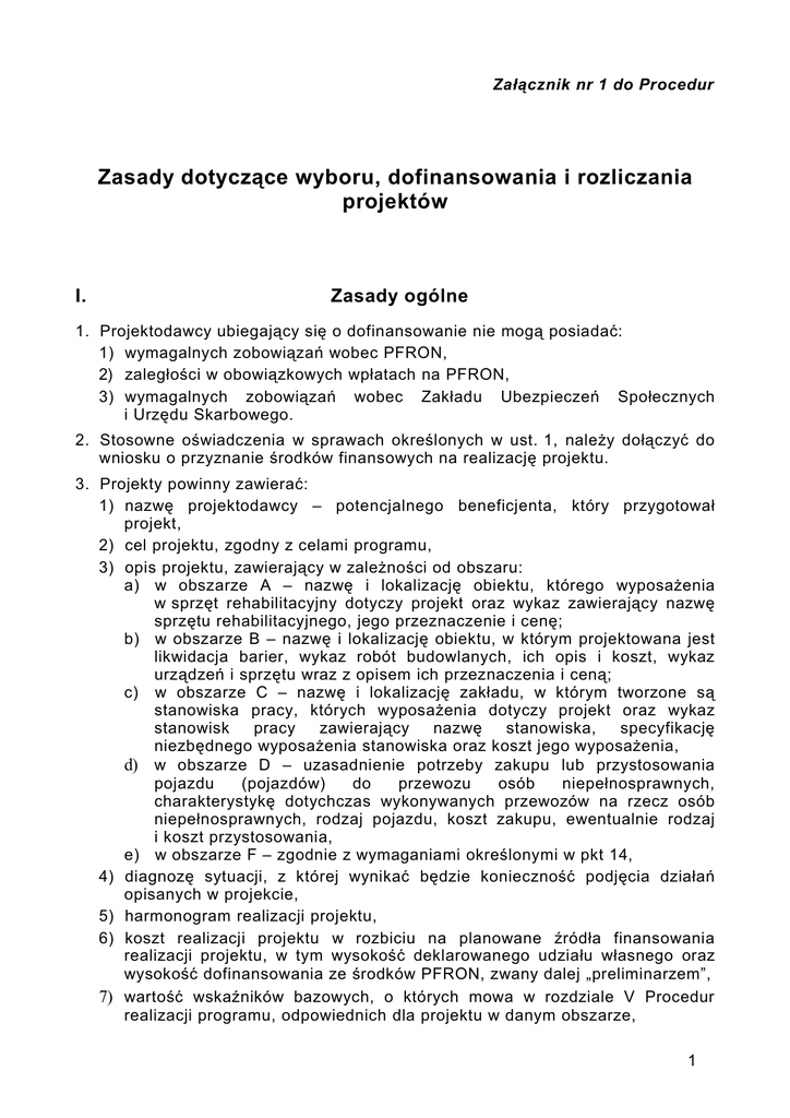 Załącznik nr 1 do Procedur Zasady dotyczące wyboru, dofinansowania i rozliczania projektów I. Zasady ogólne 1. Projektodawcy ubiegający się o dofinansowanie nie mogą posiadać: 1) wymagalnych zobowiązań wobec PFRON, 2) zaległości w obowiązkowych wpłatach na PFRON, 3) wymagalnych zobowiązań wobec Zakładu Ubezpieczeń Społecznych i Urzędu Skarbowego. 2. Stosowne oświadczenia w sprawach określonych w ust. 1, należy dołączyć do wniosku o przyznanie środków finansowych na realizację projektu. 3. Projekty powinny zawierać: 1) nazwę projektodawcy – potencjalnego beneficjenta, który przygotował projekt, 2) cel projektu, zgodny z celami programu, 3) opis projektu, zawierający w zależności od obszaru: a) w obszarze A – nazwę i lokalizację obiektu, którego wyposażenia w sprzęt rehabilitacyjny dotyczy projekt oraz wykaz zawierający nazwę sprzętu rehabilitacyjnego, jego przeznaczenie i cenę; b) w obszarze B – nazwę i lokalizację obiektu, w którym projektowana jest likwidacja barier, wykaz robót budowlanych, ich opis i koszt, wykaz urządzeń i sprzętu wraz z opisem ich przeznaczenia i ceną; c) w obszarze C – nazwę i lokalizację zakładu, w którym tworzone są stanowiska pracy, których wyposażenia dotyczy projekt oraz wykaz stanowisk pracy zawierający nazwę stanowiska, specyfikację niezbędnego wyposażenia stanowiska oraz koszt jego wyposażenia, d) w obszarze D – uzasadnienie potrzeby zakupu lub przystosowania pojazdu (pojazdów) do przewozu osób niepełnosprawnych, charakterystykę dotychczas wykonywanych przewozów na rzecz osób niepełnosprawnych, rodzaj pojazdu, koszt zakupu, ewentualnie rodzaj i koszt przystosowania, e) w obszarze F – zgodnie z wymaganiami określonymi w pkt 14, 4) diagnozę sytuacji, z której wynikać będzie konieczność podjęcia działań opisanych w projekcie, 5) harmonogram realizacji projektu, 6) koszt realizacji projektu w rozbiciu na planowane źródła finansowania realizacji projektu, w tym wysokość deklarowanego udziału własnego oraz wysokość dofinansowania ze środków PFRON, zwany dalej „preliminarzem”, 7) wartość wskaźników bazowych, o których mowa w rozdziale V Procedur realizacji programu, odpowiednich dla projektu w danym obszarze, 1 8) planowane wartości wskaźników ewaluacji dotyczących projektu w danym obszarze, 9) wymagane, zgodne z zapisami programu i procedur, opinie, o których mowa w ust. 4 i 5, 10) potwierdzenie posiadania rachunku bankowego, 11) pełnomocnictwo, dokument lub oświadczenie o uprawnieniu projektodawcy do zaciągania zobowiązań finansowych, 12) aktualny dokument potwierdzający status prawny projektodawcy, 13) w przypadku obszaru B programu następujące dokumenty: a) dokumentacja techniczna niezbędna do weryfikacji kosztorysów, b) dokument potwierdzający tytuł prawny do obiektu, c) pozwolenie na budowę – jeśli jest wymagana na podstawie odrębnych przepisów, d) zgoda właściciela obiektu na realizację zadań będących przedmiotem projektu – jeśli jest wymagana na podstawie odrębnych przepisów, 14) w przypadku obszaru F programu – projekt powinien spełniać wymogi określone w pkt 1-12 a także powinien zostać sporządzony zgodnie z § 3 ust. 3 Rozporządzenia Ministra Gospodarki, Pracy i Polityki Społecznej z dnia 25 marca 2004 roku w sprawie warsztatów terapii zajęciowej (Dz. U. Nr 63, poz. 587). 4. W przypadku obszaru A wymagana jest opinia wojewódzkiej rady do spraw osób niepełnosprawnych, dotycząca znaczenia inwestycji, której dotyczy projekt, dla rehabilitacji zawodowej, społecznej i leczniczej dla regionu oraz oświadczenie realizatora programu (samorząd wojewódzki) o zgodności projektu z samorządowym programem działań na rzecz osób niepełnosprawnych. 5. W przypadku obszaru B, C D i F wymagana jest opinia powiatowej społecznej rady do spraw osób niepełnosprawnych oraz samorządu powiatowego o znaczeniu realizacji projektu dla rehabilitacji zawodowej i społecznej osób niepełnosprawnych w regionie. 6. Projektodawcy prowadzący działalność gospodarczą, ubiegający się o pomoc de minimis zobowiązani są do przedstawienia realizatorowi programu, wraz z wnioskiem o przyznanie środków finansowych na realizację projektu: 1) wszystkich zaświadczeń o pomocy de minimis, jakie otrzymali w ciągu trzech ostatnich lat poprzedzających dzień wystąpienia z wnioskiem o udzielenie pomocy, lub 2) w okresie 3 lat od dnia wejścia w życie ustawy z dnia 30 kwietnia 2004 roku o postępowaniu w sprawach dotyczących pomocy publicznej (Dz. U. Nr 123, poz. 1291) sumy: a) wartości pomocy indywidualnej, niepodlegającej opiniowaniu przez Prezesa Urzędu Ochrony Konsumentów i Konkurencji, udzielonej przed dniem wejścia w życie powyższej ustawy, w okresie kolejnych 3 lat poprzedzających dzień udzielenia pomocy ze środków PFRON, oraz b) pomocy, której charakter de minimis został potwierdzony zaświadczeniem. 2 7. Projektodawcy prowadzący działalność gospodarczą, ubiegający się o pomoc inną, niż pomoc de minimis zobowiązani są do przedstawienia realizatorowi programu, wraz z wnioskiem o przyznanie środków finansowych na realizację projektu, informacji o otrzymanej pomocy publicznej, zgodnie z Rozporządzeniem Rady Ministrów z dnia 11 sierpnia 2004 roku w sprawie informacji o otrzymanej pomocy publicznej innej niż pomoc de minimis (Dz. U. Nr 191, poz. 1960). 8. Projekty składane są w jednostkach samorządu terytorialnego; wojewódzkiego – dla obszaru A i powiatowego – dla obszarów B, C D i F, a następnie jednostka samorządu terytorialnego składa do PFRON wystąpienie w sprawie uczestnictwa w realizacji programu, zawierające m.in. opis tych projektów, które przez jednostkę samorządu terytorialnego zostały wybrane do dofinansowania ze środków PFRON. 9. Projekt należy składać w terminie wskazanym przez jednostkę samorządu terytorialnego, gwarantującym ujęcie tego p