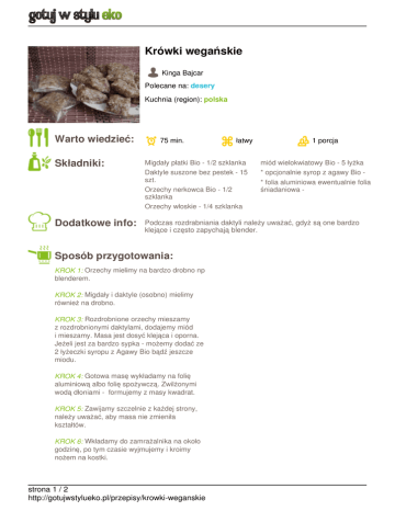 Krówki wegańskie Kinga Bajcar Polecane na: desery Kuchnia (region): polska Warto wiedzieć: 75 min. łatwy 1 porcja Składniki: Migdały płatki Bio - 1/2 szklanka Daktyle suszone bez pestek - 15 szt. Orzechy nerkowca Bio - 1/2 szklanka Orzechy włoskie - 1/4 szklanka Dodatkowe info: Podczas rozdrabniania daktyli należy uważać, gdyż są one bardzo klejące i często zapychają blender. Sposób przygotowania: KROK 1: Orzechy mielimy na bardzo drobno np blenderem. KROK 2: Migdały i daktyle (osobno) mielimy również na drobno. KROK 3: Rozdrobnione orzechy mieszamy z rozdrobnionymi daktylami, dodajemy miód i mieszamy. Masa jest dosyć klejąca i oporna. Jeżeli jest za bardzo sypka - możemy dodać ze 2 łyżeczki syropu z Agawy Bio bądź jeszcze miodu. KROK 4: Gotowa masę wykładamy na folię aluminiową albo folię spożywczą. Zwilżonymi wodą dłoniami - formujemy z masy kwadrat. KROK 5: Zawijamy szczelnie z każdej strony, należy uważać, aby masa nie zmieniła kształtów. KROK 6: Wkładamy do zamrażalnika na około godzinę, po tym czasie wyjmujemy i kroimy nożem na kostki. strona 1 / 2 http://gotujwstylueko.pl/przepisy/krowki-weganskie miód wielokwiatowy Bio - 5 łyżka * opcjonalnie syrop z agawy Bio * folia aluminiowa ewentualnie folia śniadaniowa - Część takich "krówek" możemy śmiało zapakować w folię :) strona 2 / 2 http://gotujwstylueko.pl/przepisy/krowki-weganskie Powered by TCPDF (www.tcpdf.org)