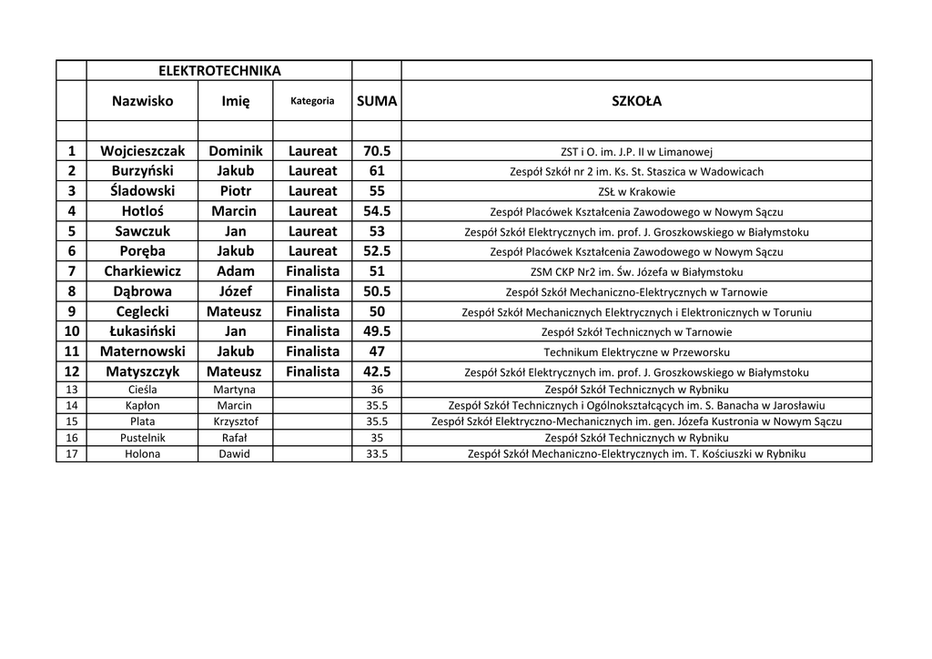 ELEKTROTECHNIKA Nazwisko Imię Kategoria SUMA SZKOŁA 1 2 3 4 5 6 7 8 9 10 11 12 Wojcieszczak Burzyński Śladowski Hotloś Sawczuk Poręba Charkiewicz Dąbrowa Ceglecki Łukasiński Maternowski Matyszczyk Dominik Jakub Piotr Marcin Jan Jakub Adam Józef Mateusz Jan Jakub Mateusz Laureat Laureat Laureat Laureat Laureat Laureat Finalista Finalista Finalista Finalista Finalista Finalista 70.5 61 55 54.5 53 52.5 51 50.5 50 49.5 47 42.5 ZST i O. im. J.P. II w Limanowej 13 14 15 16 17 Cieśla Kapłon Plata Pustelnik Holona Martyna Marcin Krzysztof Rafał Dawid 36 35.5 35.5 35 33.5 Zespół Szkół nr 2 im. Ks. St. Staszica w Wadowicach ZSŁ w Krakowie Zespół Placówek Kształcenia Zawodowego w Nowym Sączu Zespół Szkół Elektrycznych im. prof. J. Groszkowskiego w Białymstoku Zespół Placówek Kształcenia Zawodowego w Nowym Sączu ZSM CKP Nr2 im. Św. Józefa w Białymstoku Zespół Szkół Mechaniczno-Elektrycznych w Tarnowie Zespół Szkół Mechanicznych Elektrycznych i Elektronicznych w Toruniu Zespół Szkół Technicznych w Tarnowie Technikum Elektryczne w Przeworsku Zespół Szkół Elektrycznych im. prof. J. Groszkowskiego w Białymstoku Zespół Szkół Technicznych w Rybniku Zespół Szkół Technicznych i Ogólnokształcących im. S. Banacha w Jarosławiu Zespół Szkół Elektryczno-Mechanicznych im. gen. Józefa Kustronia w Nowym Sączu Zespół Szkół Technicznych w Rybniku Zespół Szkół Mechaniczno-Elektrycznych im. T. Kościuszki w Rybniku