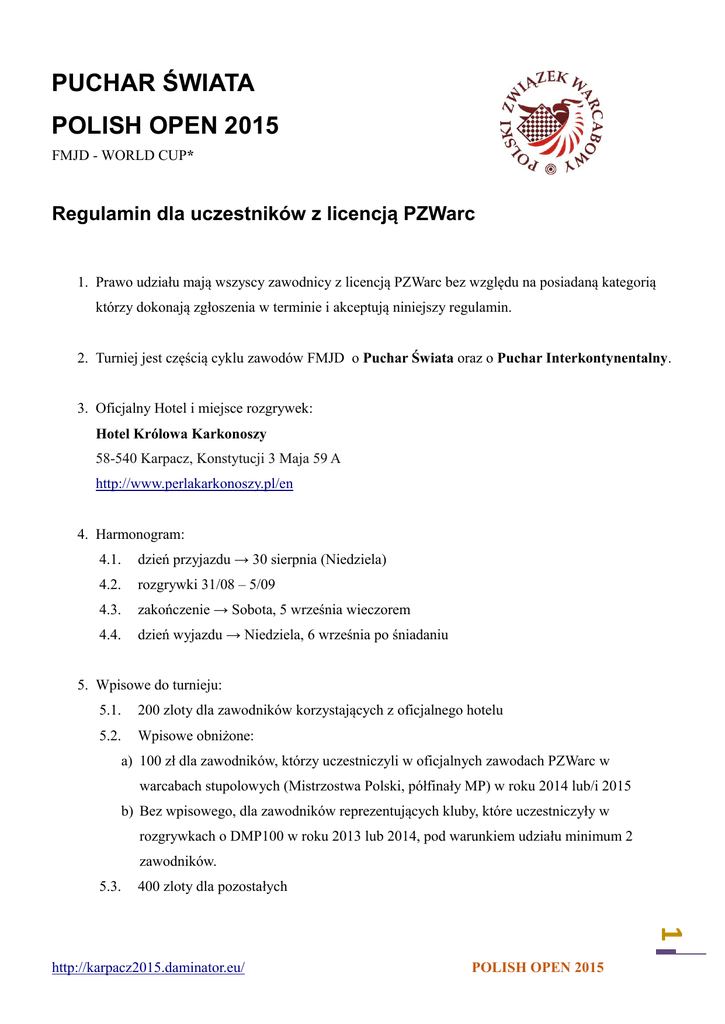 PUCHAR ŚWIATA POLISH OPEN 2015 FMJD - WORLD CUP* Regulamin dla uczestników z licencją PZWarc 1. Prawo udziału mają wszyscy zawodnicy z licencją PZWarc bez względu na posiadaną kategorią którzy dokonają zgłoszenia w terminie i akceptują niniejszy regulamin. 2. Turniej jest częścią cyklu zawodów FMJD o Puchar Świata oraz o Puchar Interkontynentalny. 3. Oficjalny Hotel i miejsce rozgrywek: Hotel Królowa Karkonoszy 58-540 Karpacz, Konstytucji 3 Maja 59 A http://www.perlakarkonoszy.pl/en 4. Harmonogram: 4.1. dzień przyjazdu → 30 sierpnia (Niedziela) 4.2. rozgrywki 31/08 – 5/09 4.3. zakończenie → Sobota, 5 września wieczorem 4.4. dzień wyjazdu → Niedziela, 6 września po śniadaniu 5. Wpisowe do turnieju: 5.1. 200 zloty dla zawodników korzystających z oficjalnego hotelu 5.2. Wpisowe obniżone: a) 100 zł dla zawodników, którzy uczestniczyli w oficjalnych zawodach PZWarc w warcabach stupolowych (Mistrzostwa Polski, półfinały MP) w roku 2014 lub/i 2015 b) Bez wpisowego, dla zawodników reprezentujących kluby, które uczestniczyły w rozgrywkach o DMP100 w roku 2013 lub 2014, pod warunkiem udziału minimum 2 zawodników. 5.3. 400 zloty dla pozostałych 1 http://karpacz2015.daminator.eu/ POLISH OPEN 2015 6. Ostateczny termin zgłoszeń → 15 sierpnia 2015 7. Ceny za hotel z pełnym wyżywieniem (od kolacji 30.08 do śniadania 6.09): a) trójka/czwórka (za osobę) A - 700 zł B- 800 zł b) dwójka (za osobę) A - 770 zł B- 900 zł c) dwójka do pojedynczego wykorzystania A - 1.120 zł B – 1.300 zł Cena A – dla wpłacających do 20go lipca Cena B - dla wpłacających po 20 lipca lub gotówką po przyjeździe: 8. Pula nagród → minimum 10.000 złotych netto: 8.1. Mężczyźni: a) 1 miejsce 3.000 b) 2 miejsce 1.500 c) 3 miejsce 1.000 8.2. d) 4 miejsce 700 e) 5 miejsce 600 f) 6 miejsce 500 Kobiety a) 1 miejsce 1.200 8.3. b) 2 miejsce 900 c) 3 miejsce 600 Dodatkowe nagrody dla najlepszych zawodników z Polski, najlepszych w poszczególnych grupach rankingowych (2201-2300, 2101-2200, 2001-2100, 2000 i poniżej. 8.4. Nagrody mogą być łączone. 9. System rozgrywek: 9.1. Tempo gry – 1h20’ + 1’ na posunięcie 9.2. System szwajcarski (klasyczny) – 9 rund 10.Pozostałe: 10.1. Rezerwacja, zgłoszenia, pytania: [email protected] 10.2. Wpłaty na rachunek PZWarc: 22 1050 1559 1000 0091 3538 0898 2 http://karpacz2015.daminator.eu/ POLISH OPEN 2015