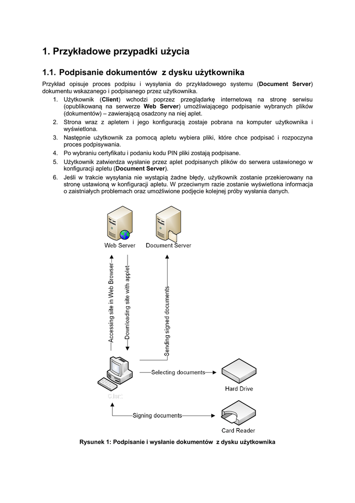 1. Przykładowe przypadki użycia 1.1. Podpisanie dokumentów z dysku użytkownika Przykład opisuje proces podpisu i wysyłania do przykładowego systemu (Document Server) dokumentu wskazanego i podpisanego przez użytkownika. 1. Użytkownik (Client) wchodzi poprzez przeglądarkę internetową na stronę serwisu (opublikowaną na serwerze Web Server) umożliwiającego podpisanie wybranych plików (dokumentów) – zawierającą osadzony na niej aplet. 2. Strona wraz z apletem i jego konfiguracją zostaje pobrana na komputer użytkownika i wyświetlona. 3. Następnie użytkownik za pomocą apletu wybiera pliki, które chce podpisać i rozpoczyna proces podpisywania. 4. Po wybraniu certyfikatu i podaniu kodu PIN pliki zostają podpisane. 5. Użytkownik zatwierdza wysłanie przez aplet podpisanych plików do serwera ustawionego w konfiguracji apletu (Document Server). 6. Jeśli w trakcie wysyłania nie wystąpią żadne błędy, użytkownik zostanie przekierowany na stronę ustawioną w konfiguracji apletu. W przeciwnym razie zostanie wyświetlona informacja o zaistniałych problemach oraz umożliwione podjęcie kolejnej próby wysłania danych. Rysunek 1: Podpisanie i wysłanie dokumentów z dysku użytkownika 1.2. Podpisanie danych dostarczonych przez formularz Przykład opisuje proces podpisu i wysyłania do przykładowego systemu (Document Server) formularza wygenerowanego przez serwer (Web Server) i wypełnionego danymi przez użytkownika (Client). 1. Użytkownik wchodzi poprzez przeglądarkę internetową na stronę serwisu (opublikowaną na serwerze Web Server) z przygotowanym formularzem. 2. Po wypełnieniu i zatwierdzeniu formularza użytkownik zostaje przekierowany na stronę z apletem do którego przekazano formularz z wprowadzonymi przez użytkownika danymi. Strona wraz ta zostaje pobrana na komputer użytkownika i wyświetlona. 3. Następnie użytkownik rozpoczyna proces podpisywania. 4. Po wybraniu certyfikatu i podaniu kodu PIN formularz wraz z danymi zostaje podpisany. 5. Użytkownik zatwierdza wysłanie przez aplet podpisanych danych do serwera ustawionego w konfiguracji apletu (Document Server). 6. Jeśli w trakcie wysyłania nie wystąpią żadne błędy, użytkownik zostanie przekierowany na stronę ustawioną w konfiguracji apletu. W przeciwnym razie zostanie wyświetlona informacja o zaistniałych problemach oraz umożliwione podjęcie kolejnej próby wysłania danych. Rysunek 2: Podpisanie danych dostarczonych przez formularz 1.3. Podpisanie danych wygenerowanych przez serwer Przykład opisuje proces podpisu i wysyłania do przykładowego systemu (Document Server) danych wygenerowanych przez serwer (Web Server) i podpisanych przez użytkownika (Client). 1. Użytkownik (Client) wchodzi poprzez przeglądarkę internetową na stronę serwisu (opublikowaną na serwerze Web Server) umożliwiającego podpisanie wygenerowanych przez serwer dokumentów – zawierającą osadzony na niej aplet. 2. Strona wraz z apletem, jego konfiguracją i dokumentami do podpisania zostaje pobrana na komputer użytkownika i wyświetlona. 3. Następnie użytkownik rozpoczyna proces podpisywania. 4. Po wybraniu certyfikatu i podaniu kodu PIN pliki zostają podpisane. 5. Użytkownik zatwierdza wysłanie przez aplet podpisanych dokumentów do serwera ustawionego w konfiguracji apletu (Document Server). 6. Jeśli w trakcie wysyłania nie wystąpią żadne błędy, użytkownik zostanie przekierowany na stronę ustawioną w konfiguracji apletu. W przeciwnym razie zostanie wyświetlona informacja o zaistniałych problemach oraz umożliwione podjęcie kolejnej próby wysłania danych. Rysunek 3: Podpisanie danych wygenerowanych przez serwer