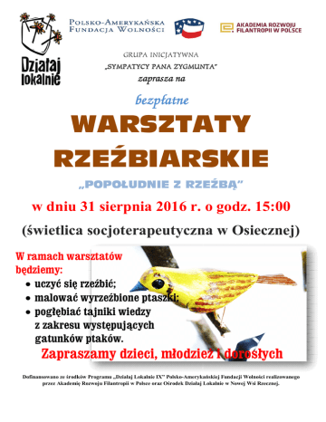 GRUPA INICJATYWNA „SYMPATYCY PANA ZYGMUNTA” zaprasza na bezpłatne WARSZTATY RZEŹBIARSKIE „POPOŁUDNIE Z RZEŹBĄ” w dniu 31 sierpnia 2016 r. o godz. 15:00 (świetlica socjoterapeutyczna w Osiecznej) W ramach warsztatów będziemy: uczyć się rzeźbić; malować wyrzeźbione ptaszki; pogłębiać tajniki wiedzy z zakresu występujących gatunków ptaków. Zapraszamy dzieci, młodzież i dorosłych Dofinansowano ze środków Programu „Działaj Lokalnie IX” Polsko-Amerykańskiej Fundacji Wolności realizowanego przez Akademię Rozwoju Filantropii w Polsce oraz Ośrodek Działaj Lokalnie w Nowej Wsi Rzecznej.